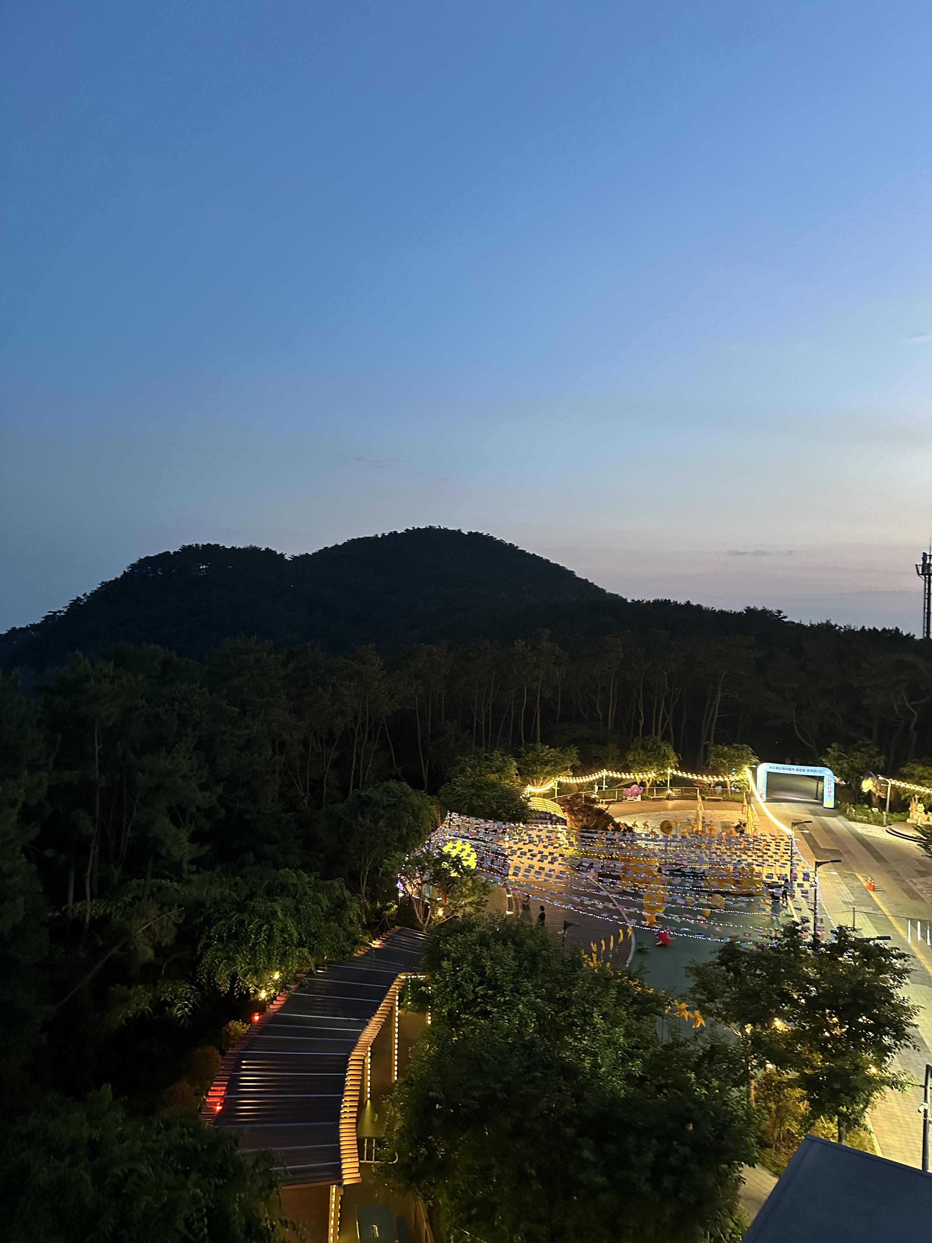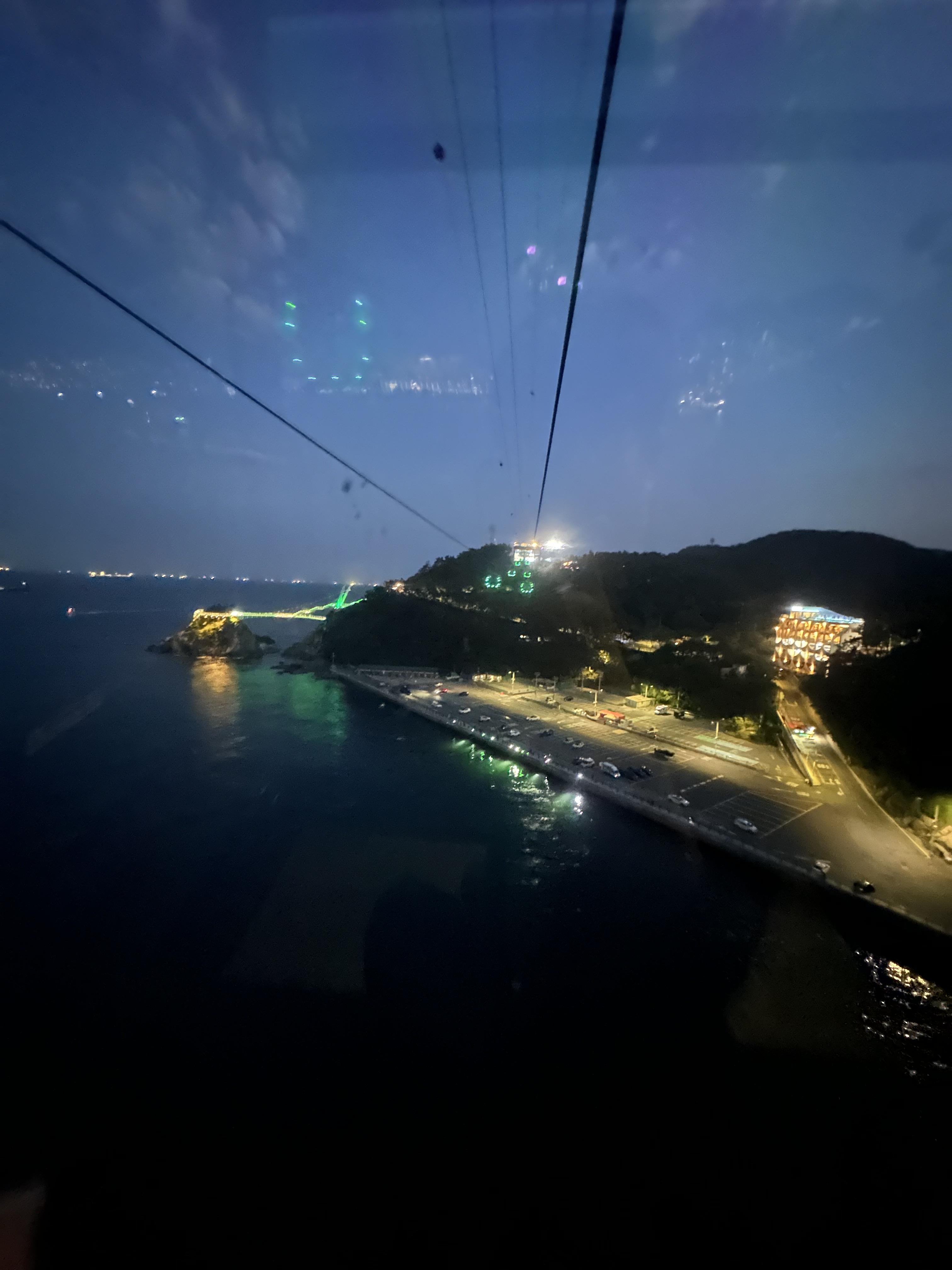 송도해상케이블카를 타고 가다가 암남공원이 보이는 뒤로 돌아보니 어두워진 모습을 볼 수 있습니다. 암남공원은 힐링과 치유의 숲길이라는 컨셉을 가진 송도의 공원인데요. 숲길이다보니 컴컴해진 밤에는 아무것도 보이지 않는 모습을 볼 수 있습니다. 그러나 암남공원과 이어주는 송도 용궁 구름다리 건너편에는 밝은 조명이 비춰지고 있었습니다. 밤 늦게라도 입장이 가능 했더라면 좋았을 것 같습니다. 2번째 방문에도 방문하지 못해서 아쉬웠습니다.