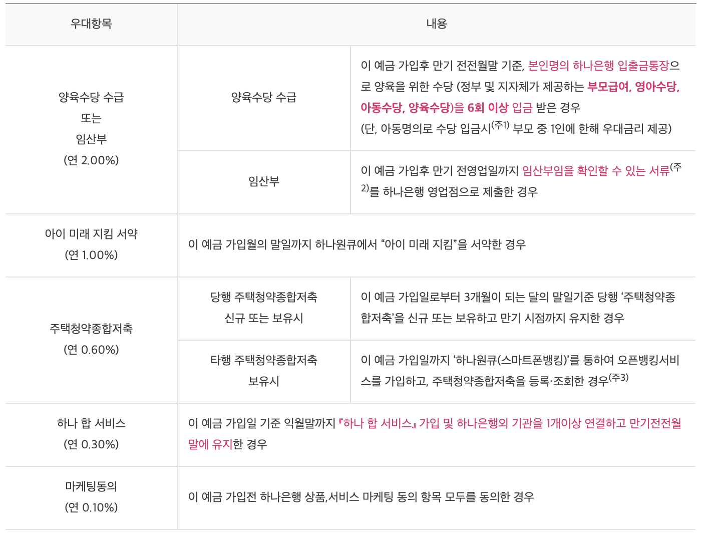 | 연 1.00% | 2명 | 이 예금 가입 후 만기 전영업일까지 다자녀 미성년(만19세 미만) 자녀만 해당 가구임이 확인되는 서류를 하나은행 영업점으로 제출 한 경우 |
