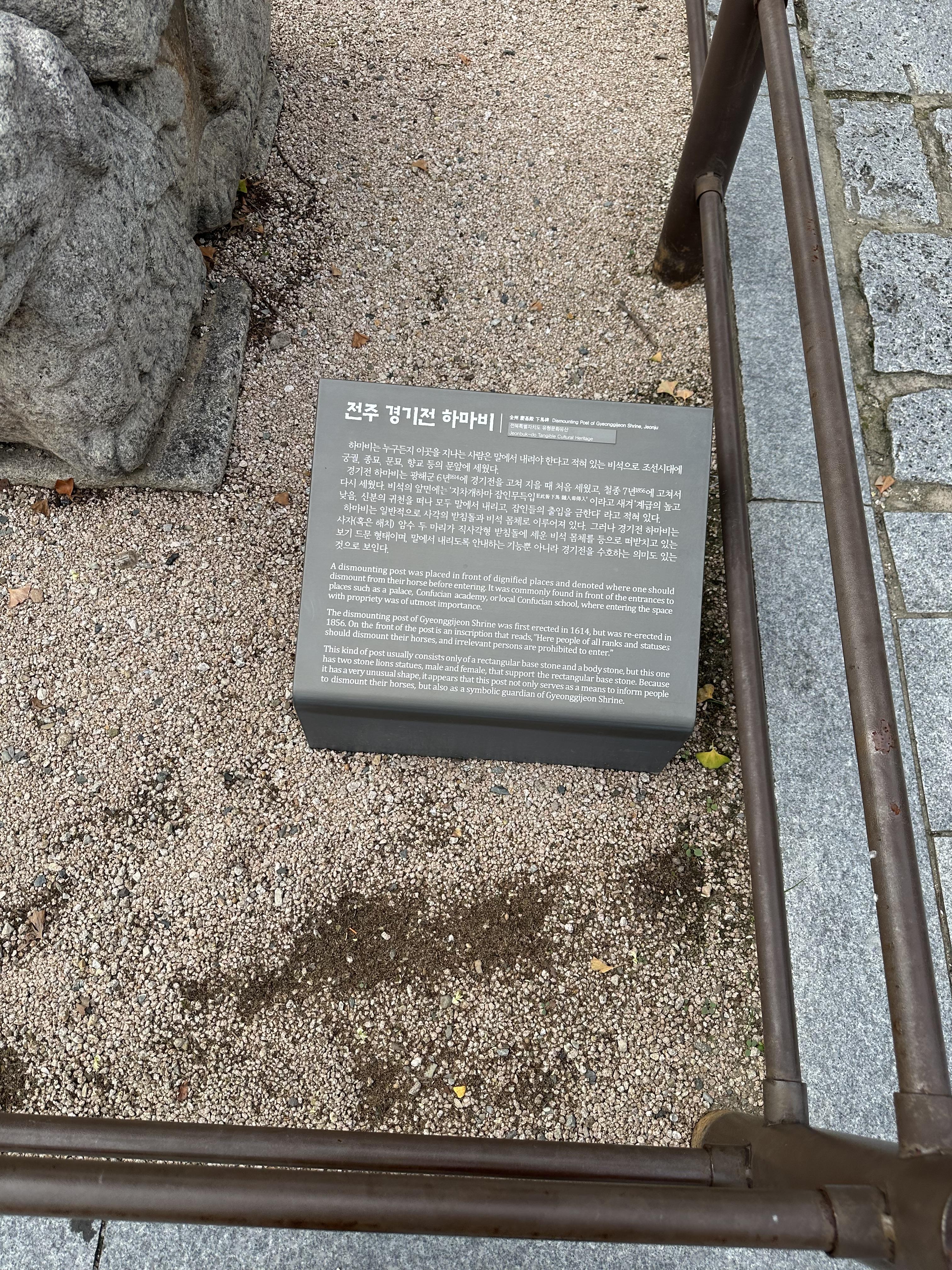 경기전 문 앞에는 작은 비석이 하나 있는데요. 이 비석은 하마비라는 것입니다. 하바미는 다시 조선시대 궁궐이나 성문앞에 비슷한 비석들이 많았습니다. 서울 종묘에서도 이런 것드리 있는데요. 간략히 설명드리면 하마비는 과거 왕들 묘 앞을 지나갈때는 말에서 내려야 한다는 이야기가 전해지고 있습니다.