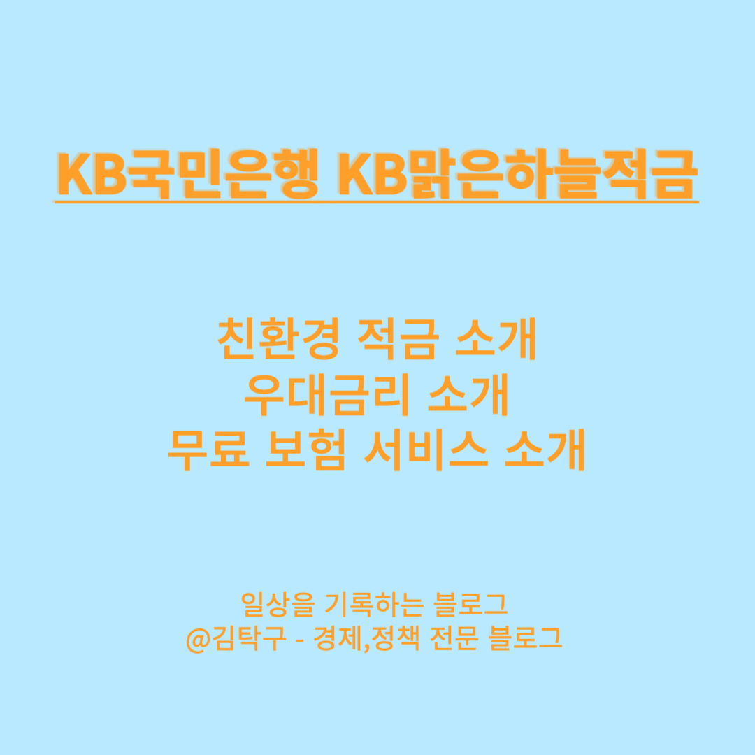 오늘 포스팅 하는 주제는 금리도 얻고 친환경을 실천 할 수 있는 적금인데요. KB 국민은행에서 출시한 KB맑은하늘적금에 대해 포스팅하려고 합니다. 지구온난화, 기상이변으로 인해 전세계가 친환경에 대해서 계속해서 고민하고 있습니다. 그리고 친환경을 위한 다양한 상품들이 나오고 있는데요. 지구가 따뜻해지고 있어 봄과 가을이 점점 짧아지고 있습니다. 더 늦기 전에 바로 잡아 후손들이 살아 갈 수 있는 환경을 만들어야 한다고 생각해요. KB국민은행에서 출시한 상품은 어떤식으로 친환경을 해결해 나갈 수 있는지, 친환경을 위한 개선 사항, 금융 상품들의 혜택을 살펴보겠습니다.