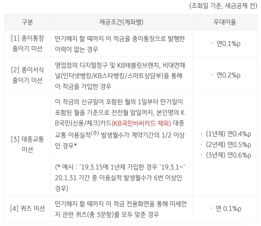 - 적금 해지 전 한번이라도 통행방행을 하시는 경우 종이통장 줄이기 미션 우대이율이 제공되지 않아요.