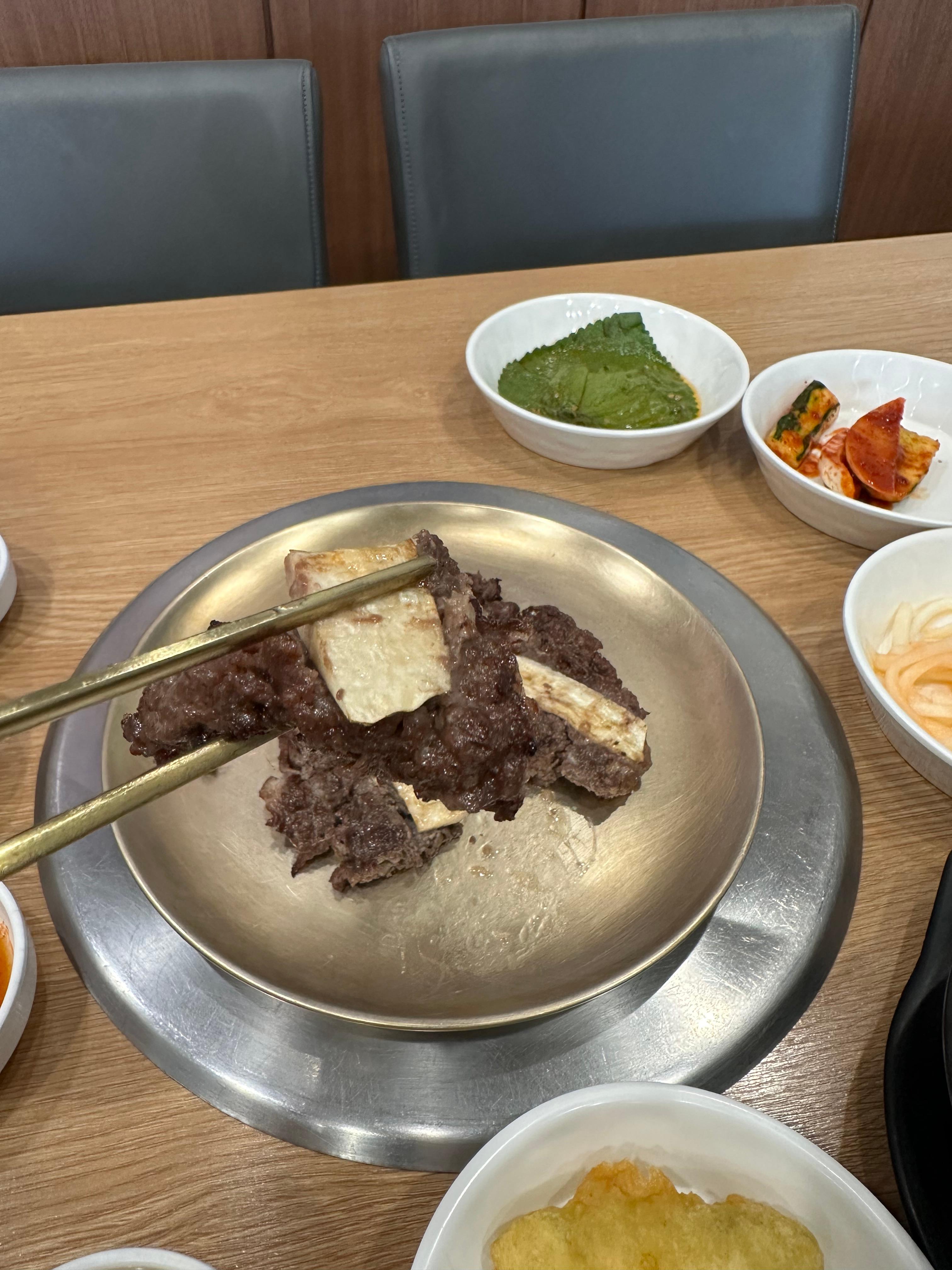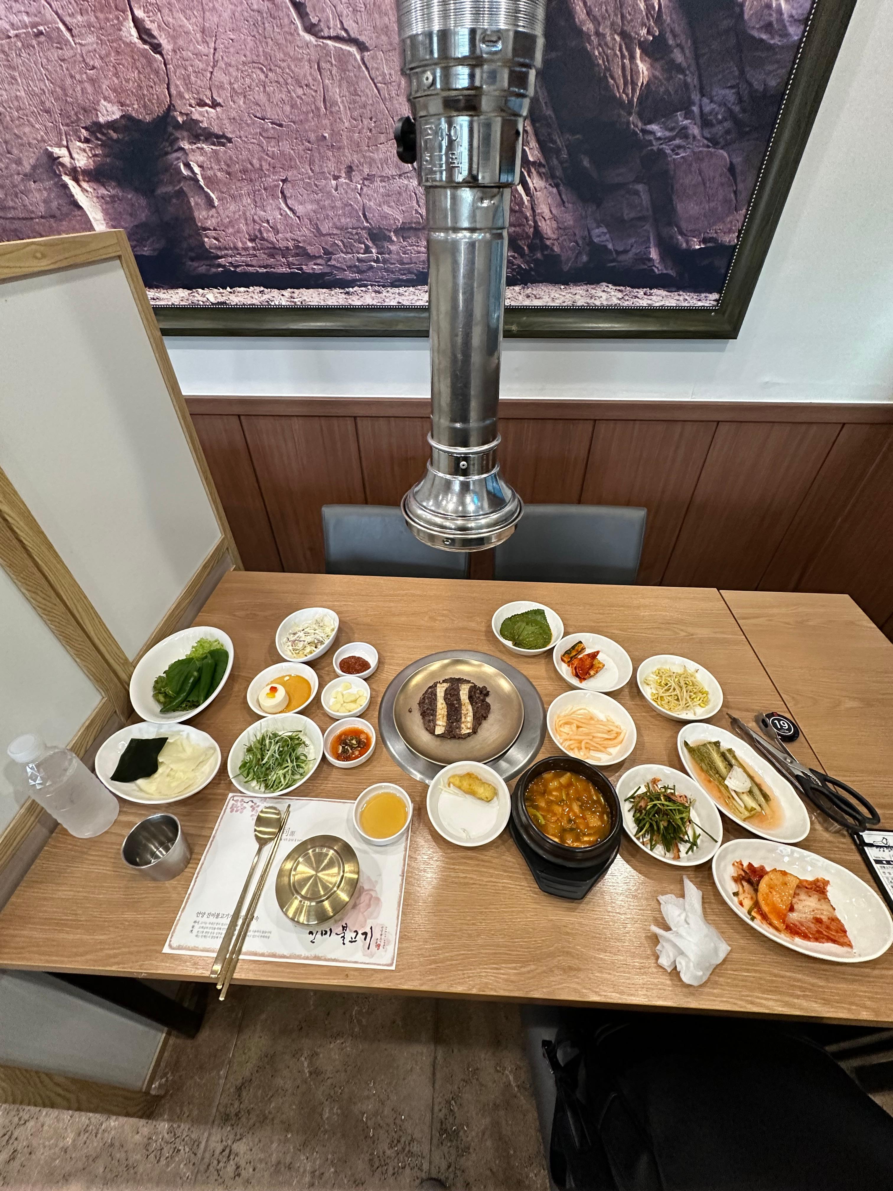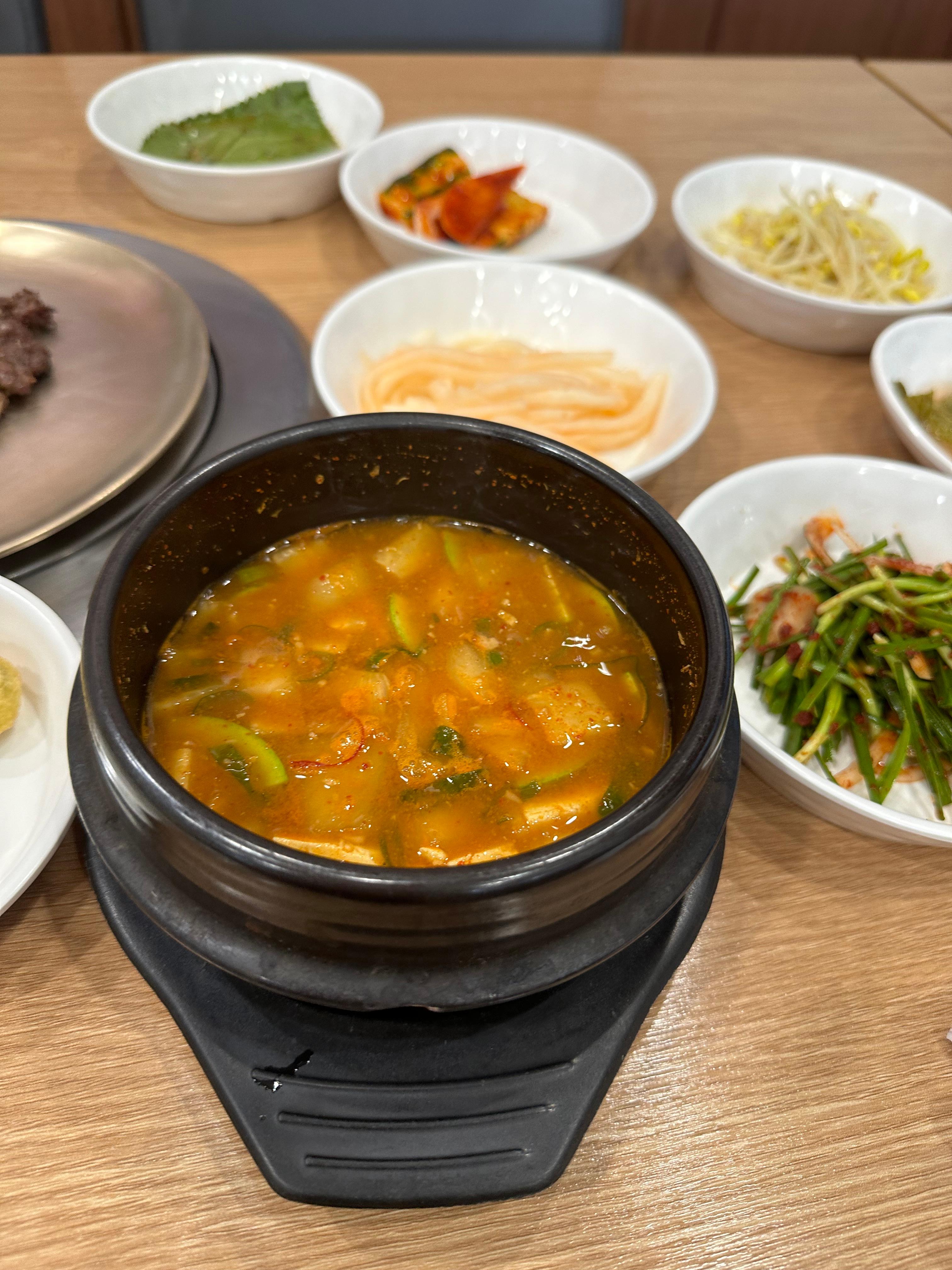 고기는 1인분으로 작은 크기이지만 반찬이 정말 푸짐하게 많이 나오고 된장찌개도 나와서 배부르게 잘먹었습니다. 특히 어렸을 때부터 느낀거는 고기집에서 먹는 된장국은 정말 일품인데요. 고기에 먹는 된장찌개가 맛있는것인지 아니면 가게 된장찌개가 맛있는건지는 잘모르겠ㅅ습니다. 여러 고기집에서 먹은 느낌으로는 그냥 고기집에서 먹는 된장찌개가 가장 맛있는것 같습니다.