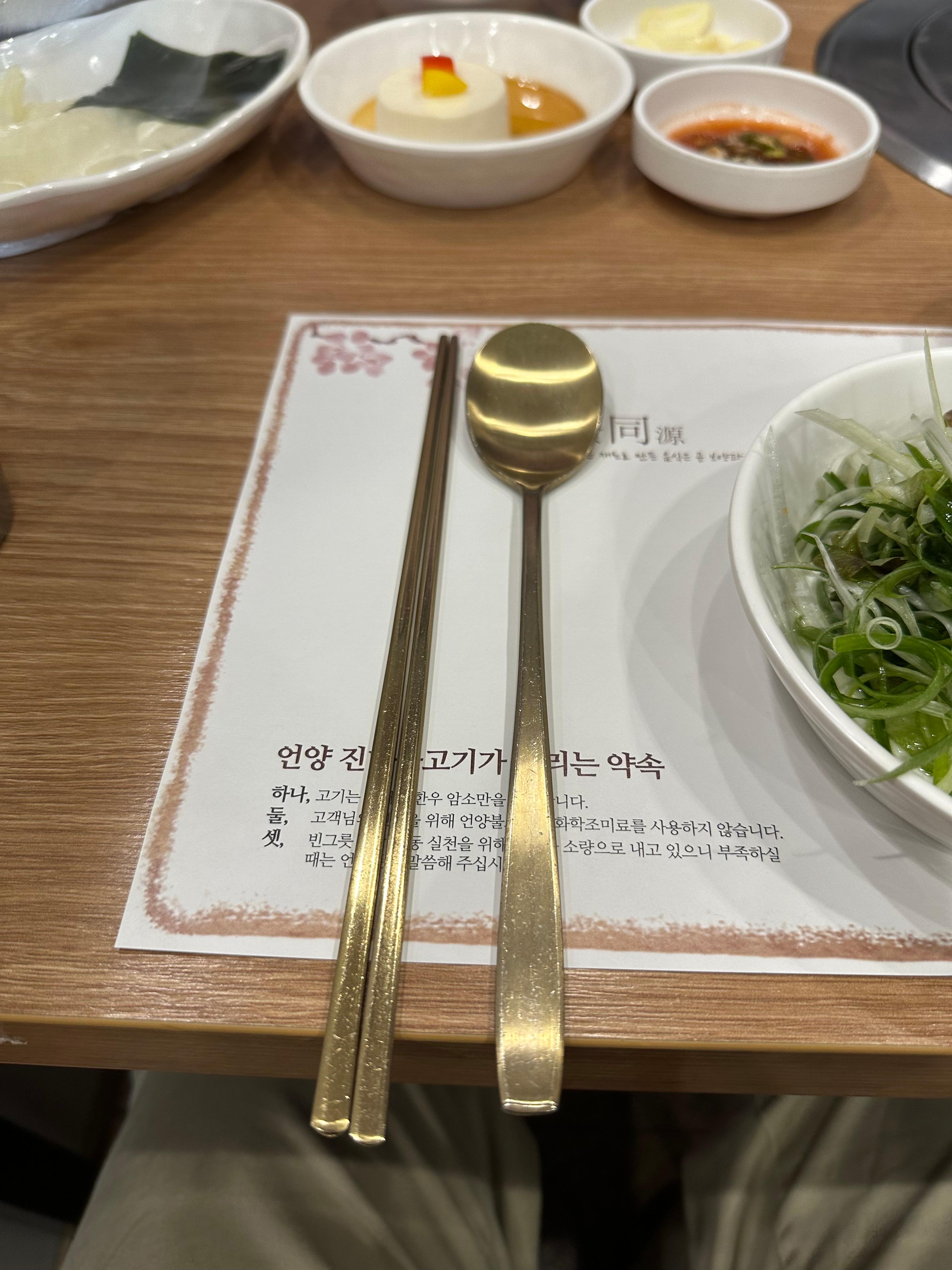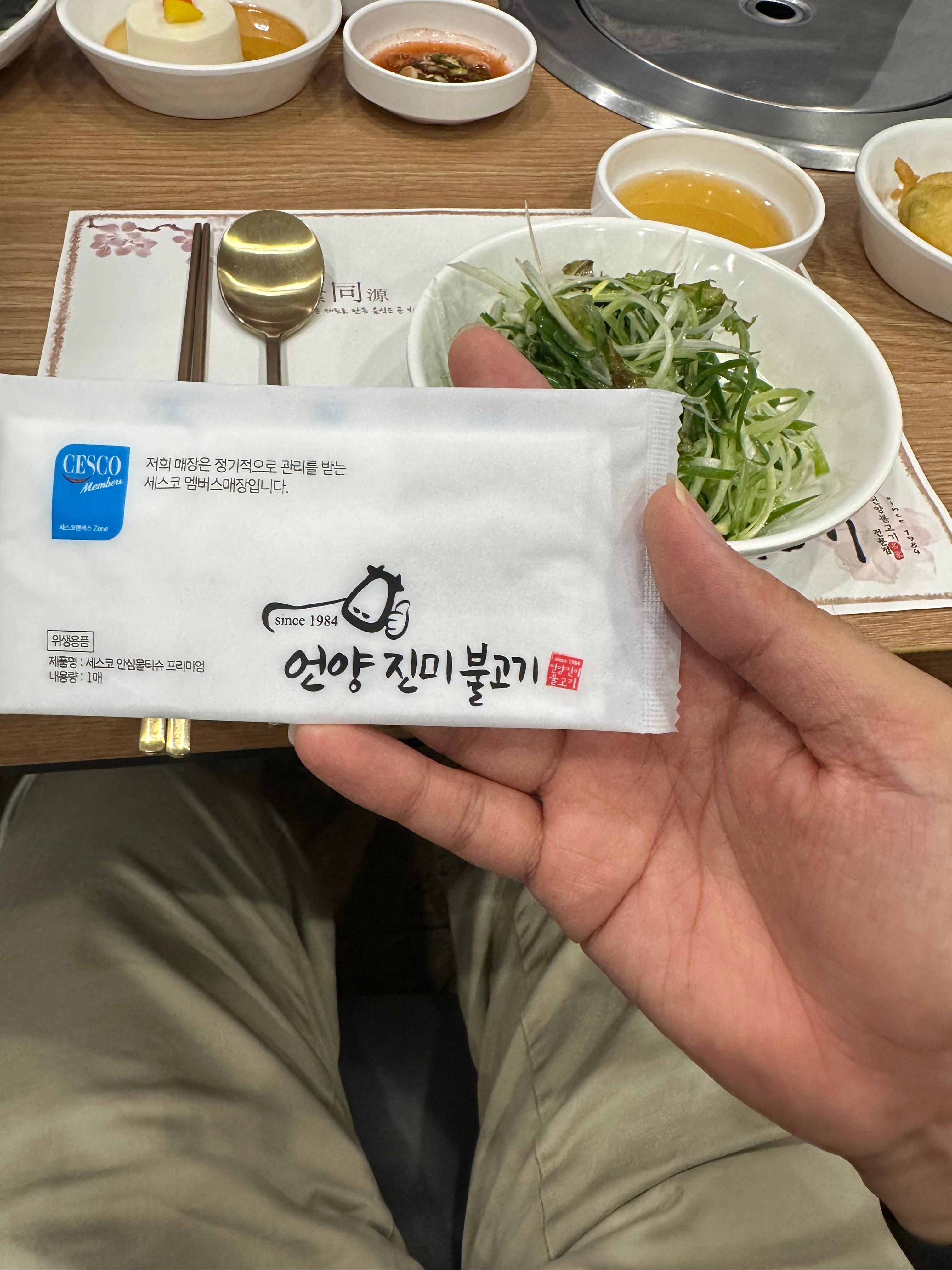 1인분으로써는 나쁘지 않았습니다. 특히 언양진미불고기는 혼자 가도 주문도 가능하고 먹을 수 있었습니다. 우선 반찬이 정말 많이 나왔습니다. 튀김류도 나오구요. 고기보다 반찬 때문에 더 배불렀습니다. 특히 수저와 젓가락이 금색인데 뭔가 더 있어보이는 것 같습니다. 예로부터 불고기 하면 임금님들이 자주 먹던 그런 음식이기도 한데요. 마치 임금님 수랏상 받는 듯한 고급스러운 수저 젓가락 색상이었습니다. 고기는 아직 안나왔지만 배도 고프고 가볍게 손을 닦고 반찬을 먹기 시작했습니다.