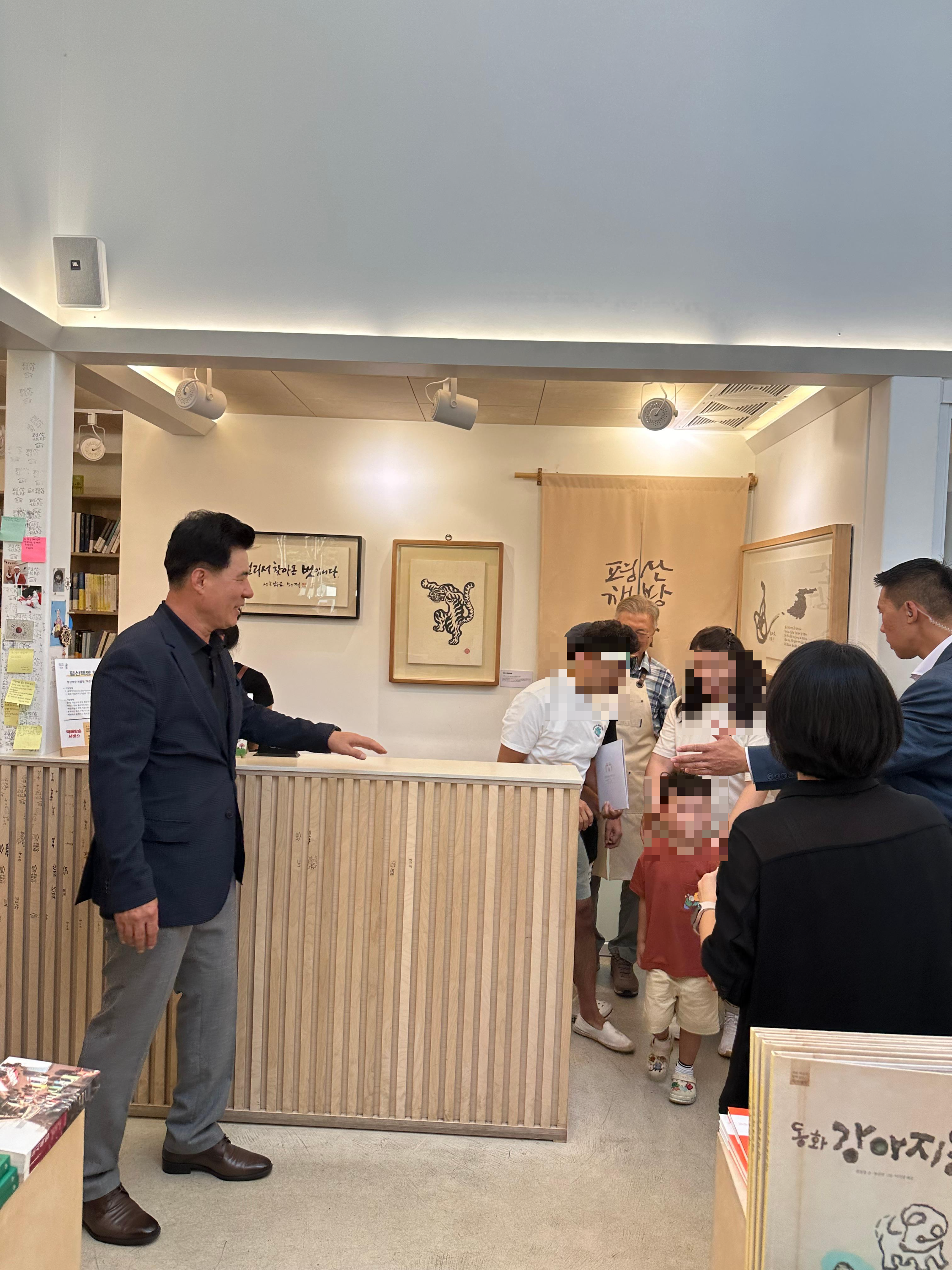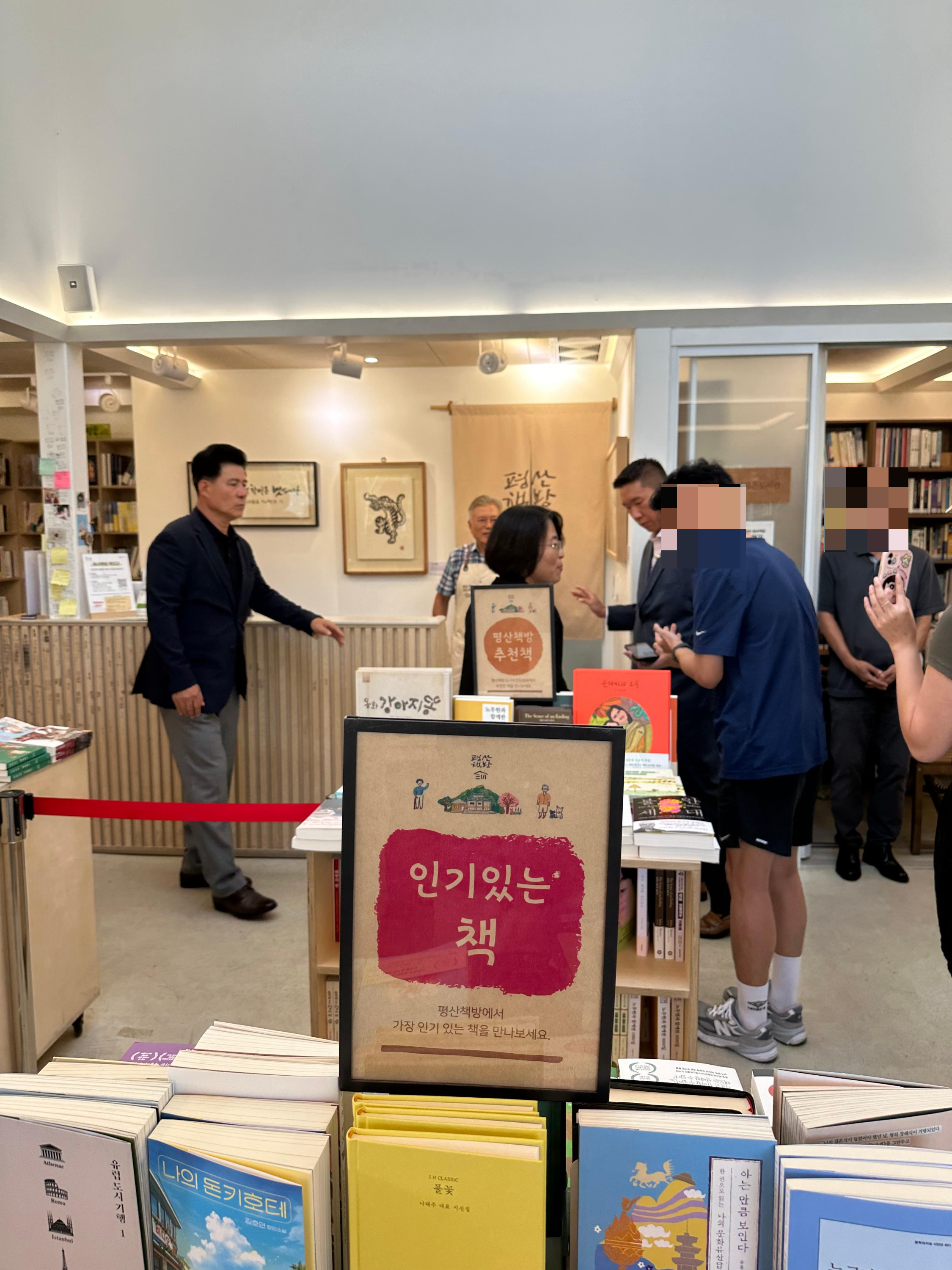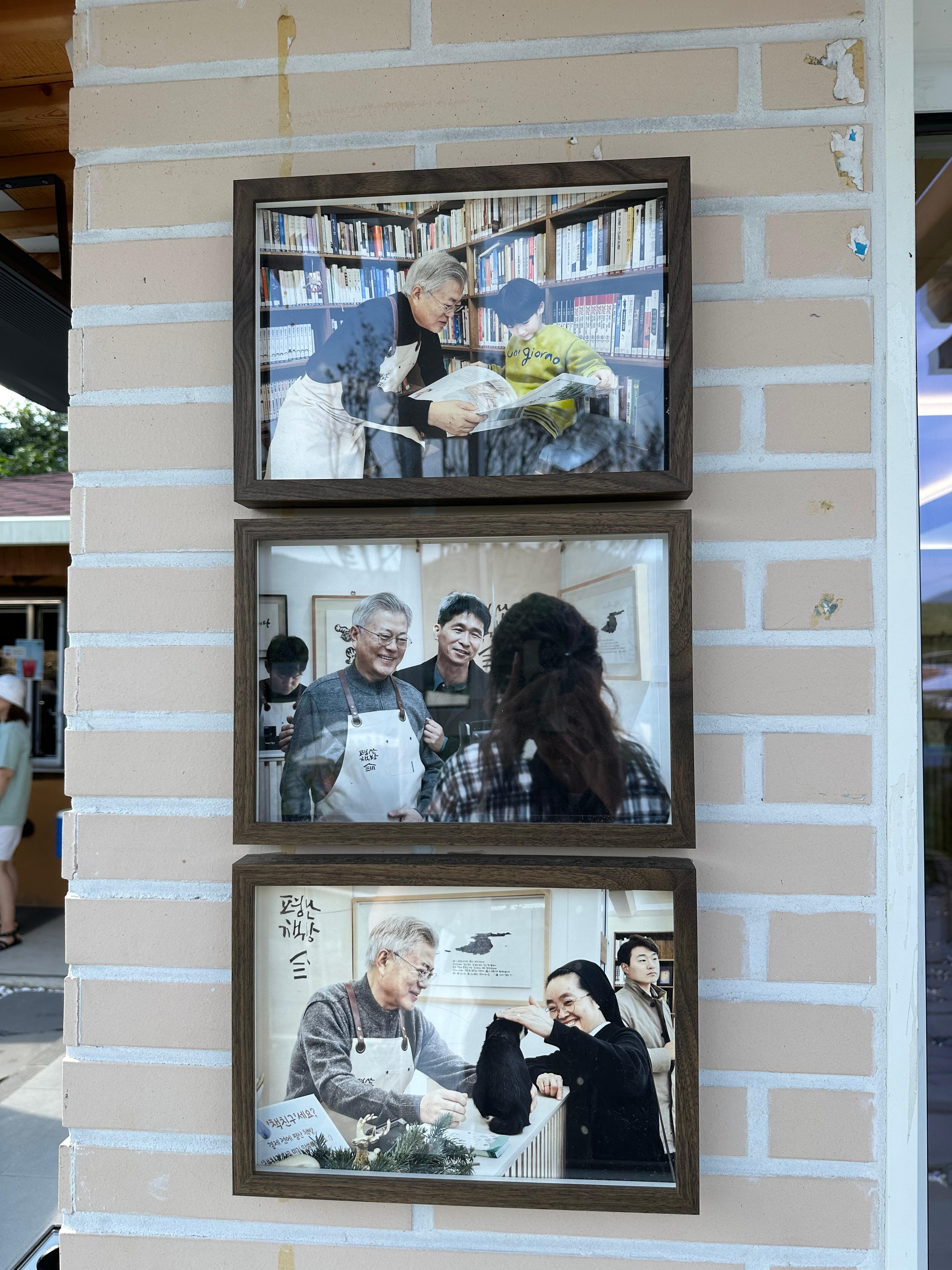 아무래도 정치적인 활동을 하시는 분이라 그런지 특히 평산책방 주변에는 보수세력들의 시위와 작년에 이재명대통령과 평산책방 직원이 폭행당하는 모습도 볼 수 있는 만큼 완전 행복하고 힐링의 공간은 아니였습니다. 정치인이기 때문에 안티세력과 지지세력들로 평산책방은 언제 어떤일이 일어날지 모르는 곳이기도 합니다. 대선과 선거 등이 있는 날이면 여당 대표와 문재인 대통령과 정치적 친분이 있는 분들도 자주 찾아옵니다. 책방 한쪽에는 지금은 교도소에 가서 복역중인 조국혁신당 전 조국 대표와 함께한 사진도 볼 수 있었습니다. 크기가 크지 않기 때문에 사람 조금만 들어오더라도 꽉 차는 모습을 볼 수 있습니다. 퇴임 후 처음 평산책방을 열었을 때는 문재인대통령님을 보러오는 국민들로 인해 작은 책방과 주변에 관광객들로 붐볐지만 지금은 조금 나아졌다고 합니다. 작은 책방이지만 책방앞으로는 자연이 보이는 창문과 함께 힐링 그자체였습니다.