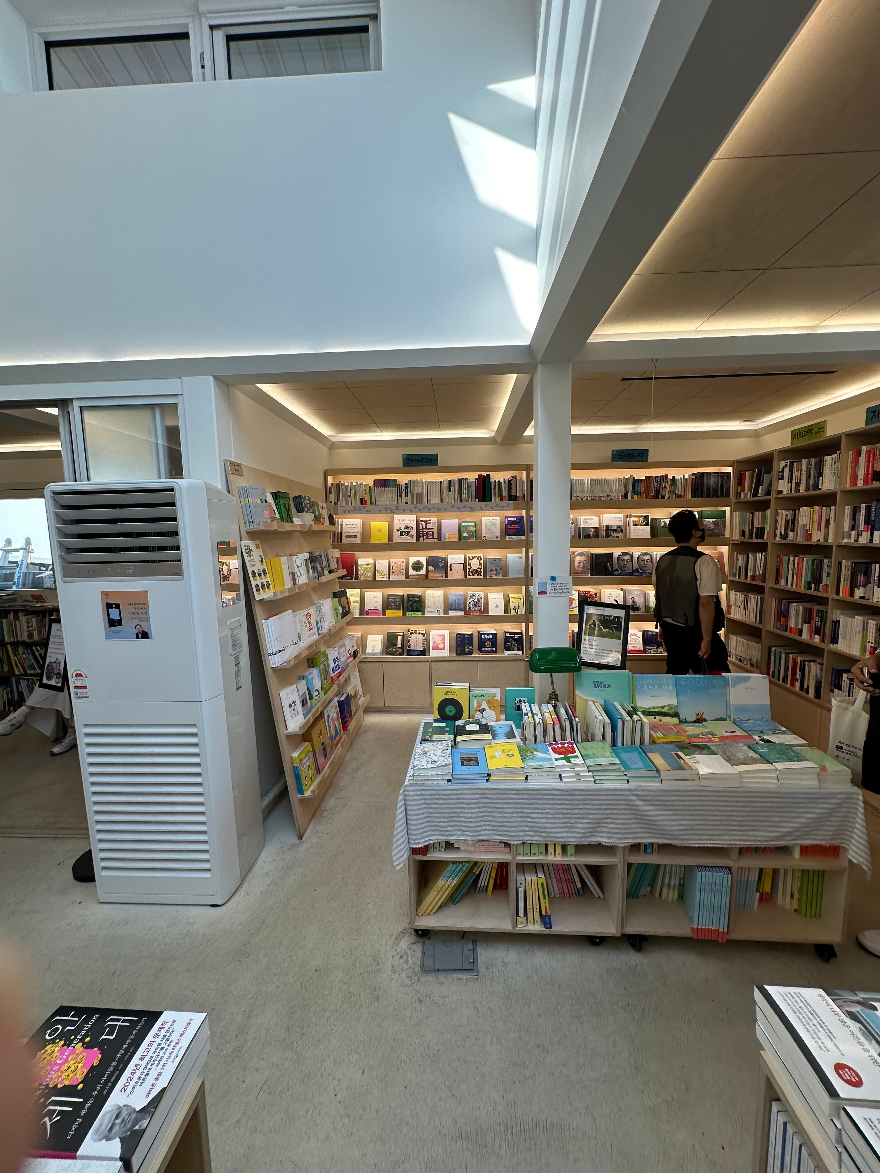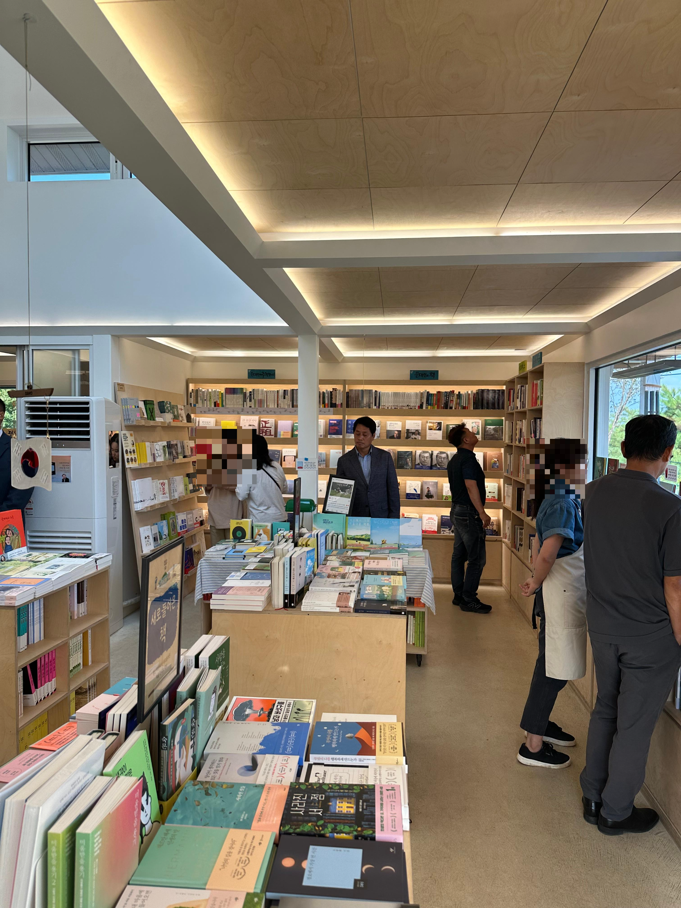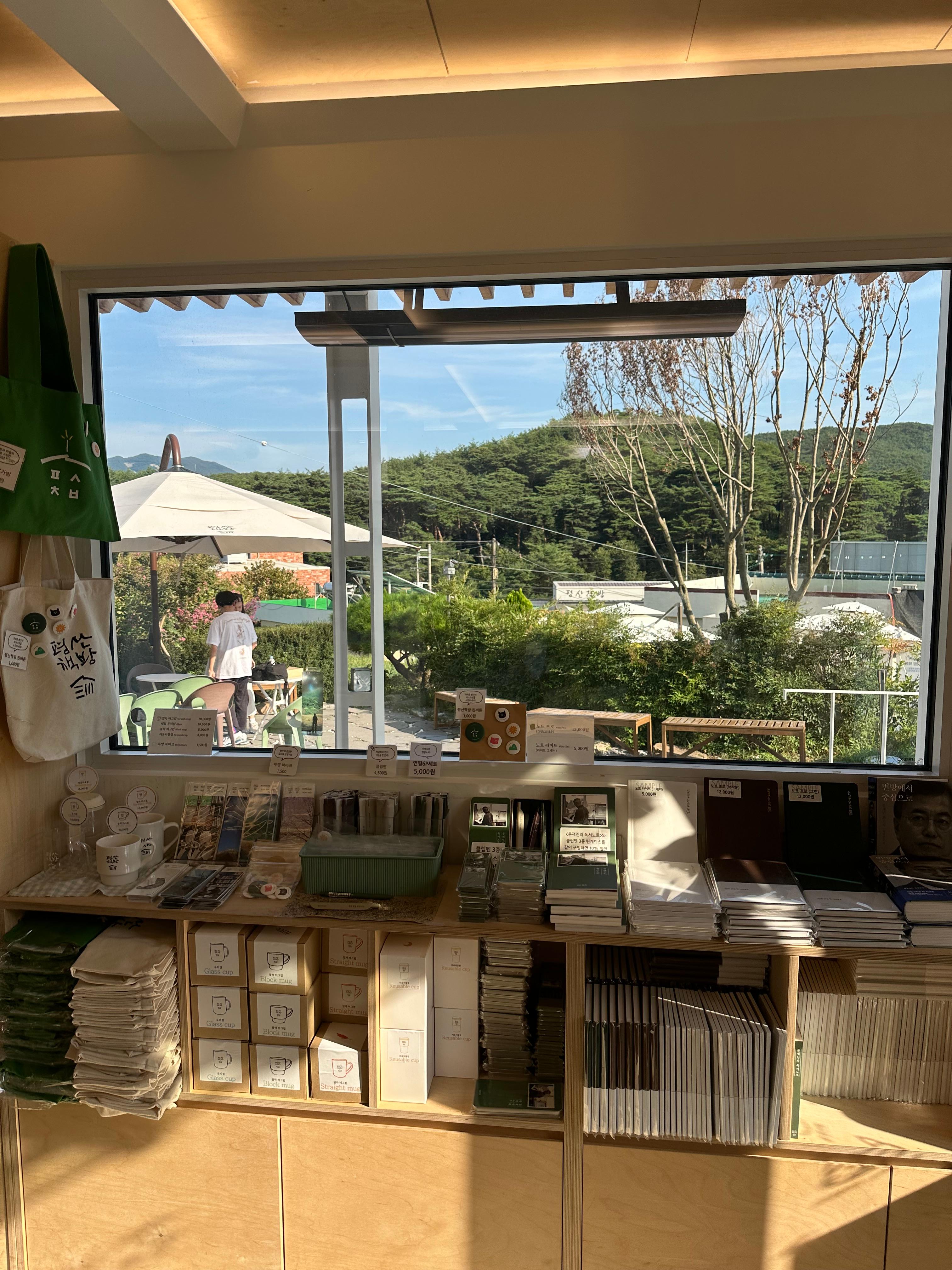문재인대통령님이 양산책방에 오시고 나서 10분정도 지나니까 대부분 사진 찍고 다 떠나가고 금세 조용한 모습을 볼 수 있었습니다. 전직대통령이시라 작은 책방에 경호원들이 퍼져서 대통령님을 보호하는 것을 볼 수 있었습니다. 평산책방 입구 쪽에는 이렇게 큰 창문을 통해 산과 자연을 그대로 볼 수 있었습니다. 어느 서점과 같이 책뿐만 아니라 다양한 기념품 및 문구류로 판매하는 것을 볼 수 있었습니다.