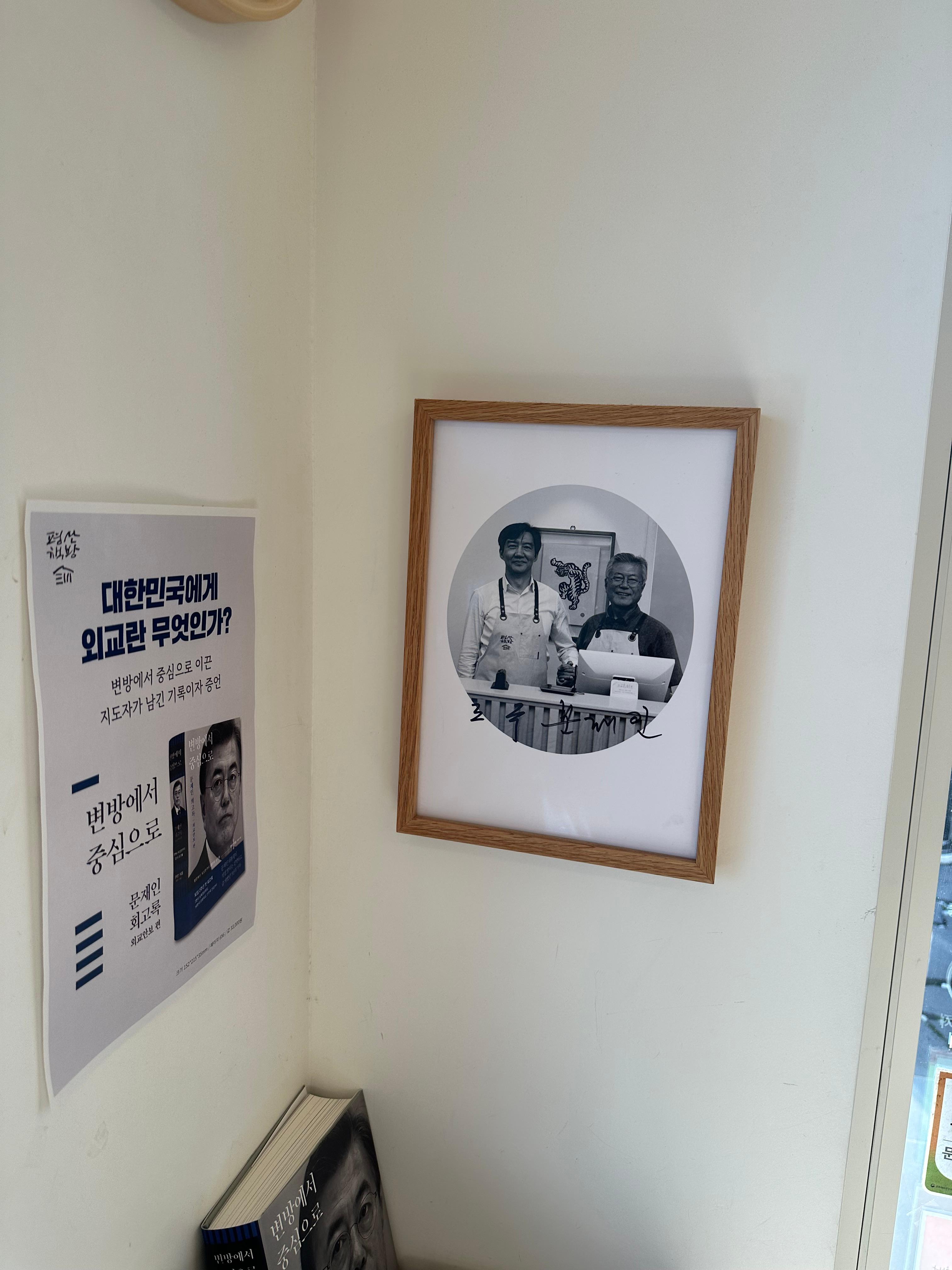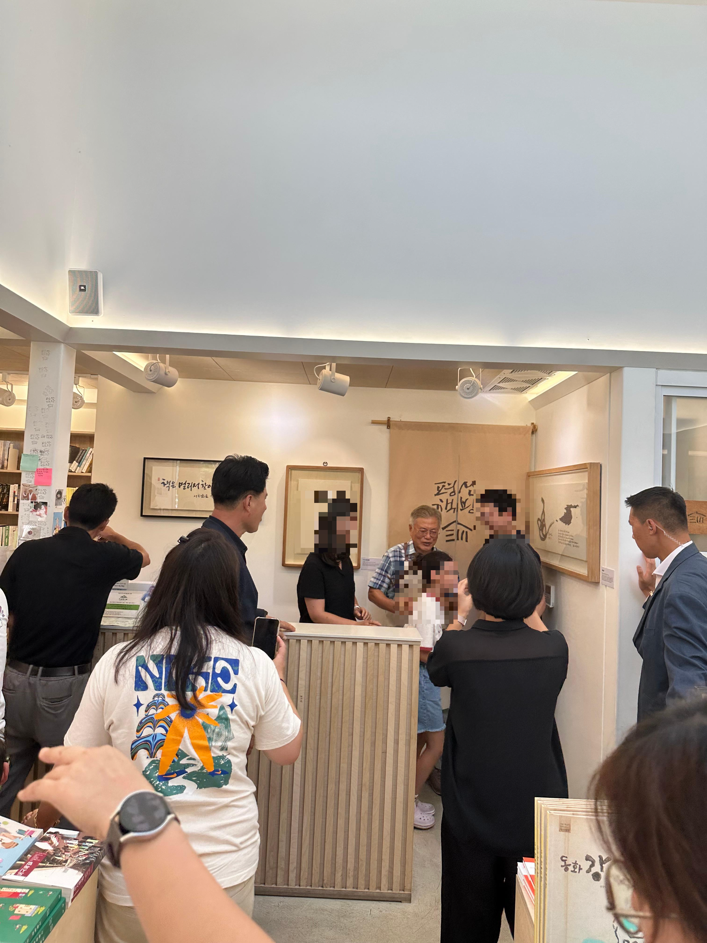 그래도 서점에 왔으니까 책은 사서 가는게 맞았습니다. 그래서 어느정도 혼잡함이 사라지는 동안에 사전에 봐두었던 문재인 대통령이 2024년 상반기에 내신 변방에서 중심으로라는 회고록 자서전을 구매했습니다. 결제를 마치고 구매한 책과 함께 저도 대통령님과 사진을 찍었습니다. 특히 작년 2024년 8월에 방문했을 때 정치적 분쟁으로 문재인 대통령님을 못보나 싶었는데 이렇게 전직대통령님을 가까이에서 볼 수 있다는 것이 영광이었습니다.