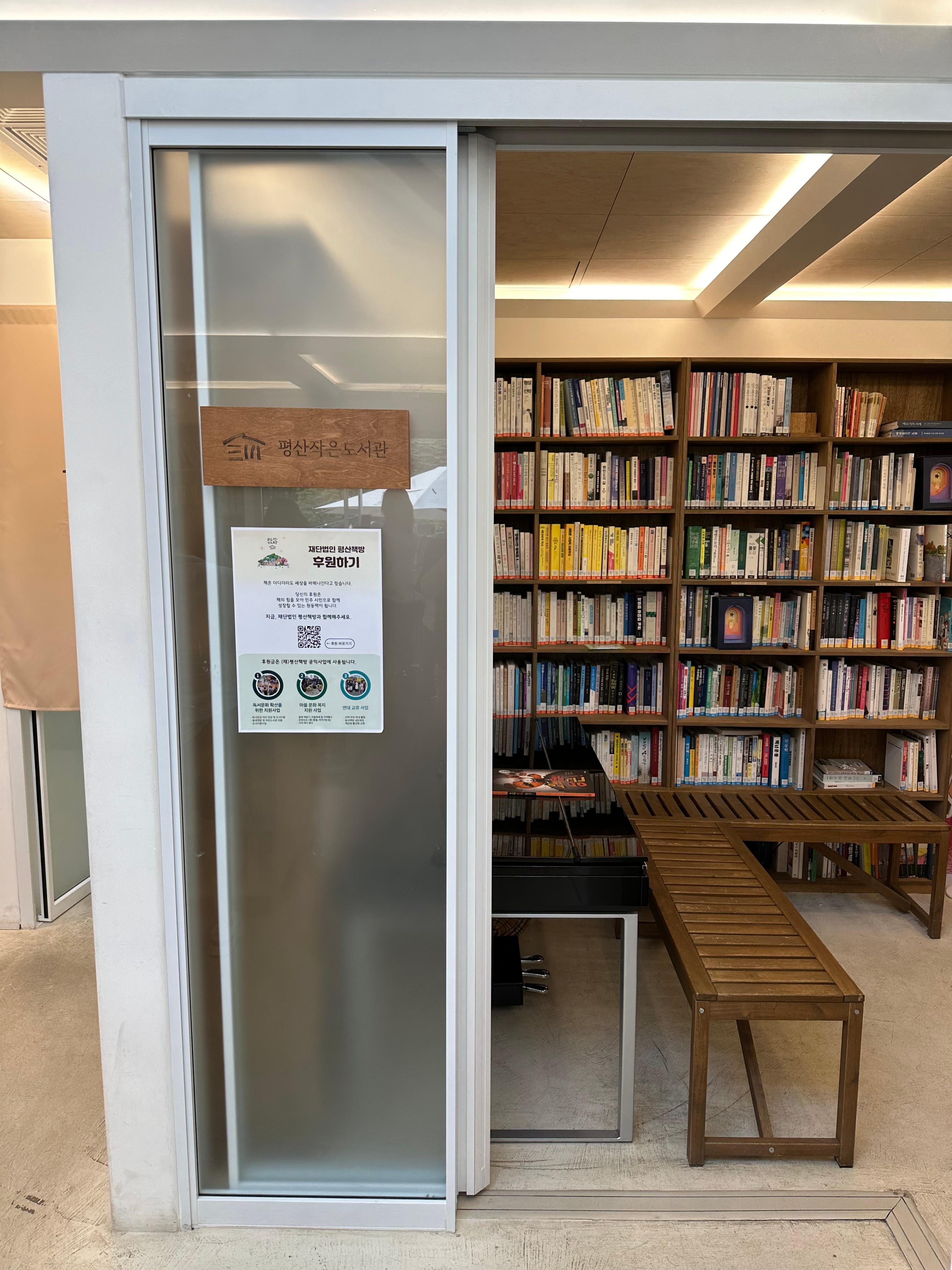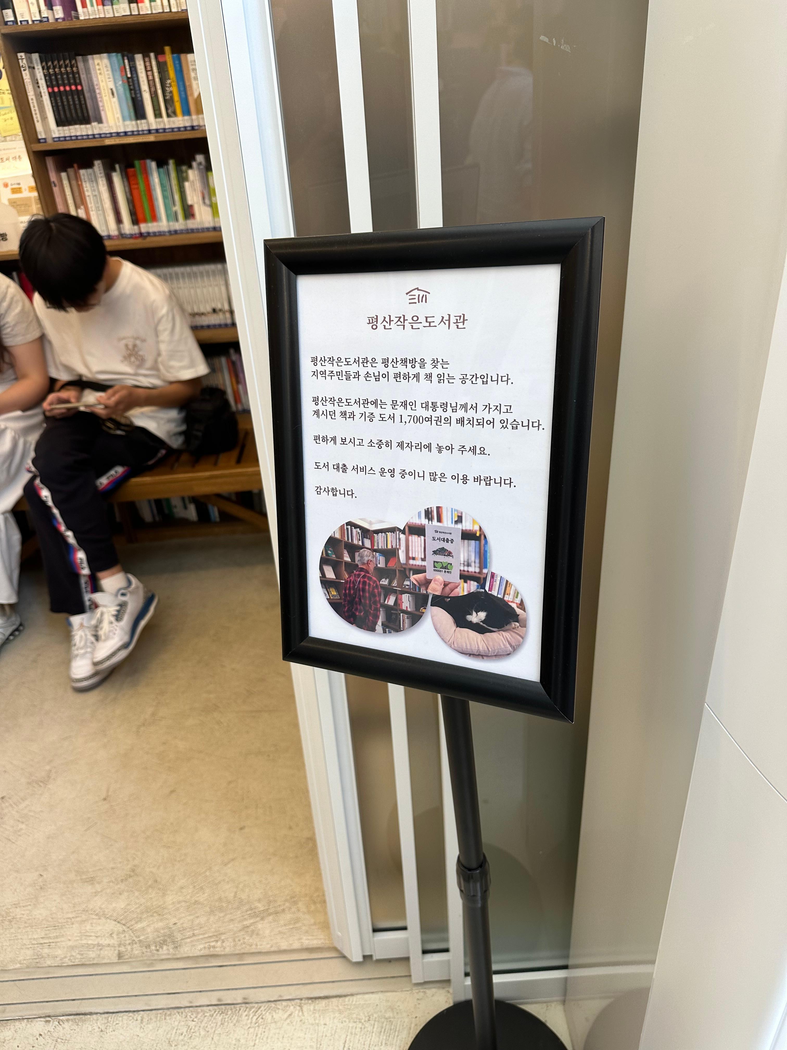 넓지 않은 작은 규모의 평산책방이지만 카운터 바로 옆에는 평산작은 도서관이라는 이름의 앉아서 책을 읽으며 휴식을 취할 수 있는 공간도 있었습니다. 이곳 평산자은도서관에는 문재인 대통령님이 가지고 있던 책과 기증 도서 1700여권이 배치되어있다고 하는데요. 편하게 읽고 제자리에 놓아두면 된다고 합니다. 도서 대출 서비스도 운영 중이라고 하니 카운터를 통해 알아보시면 좋을 것 같습니다.