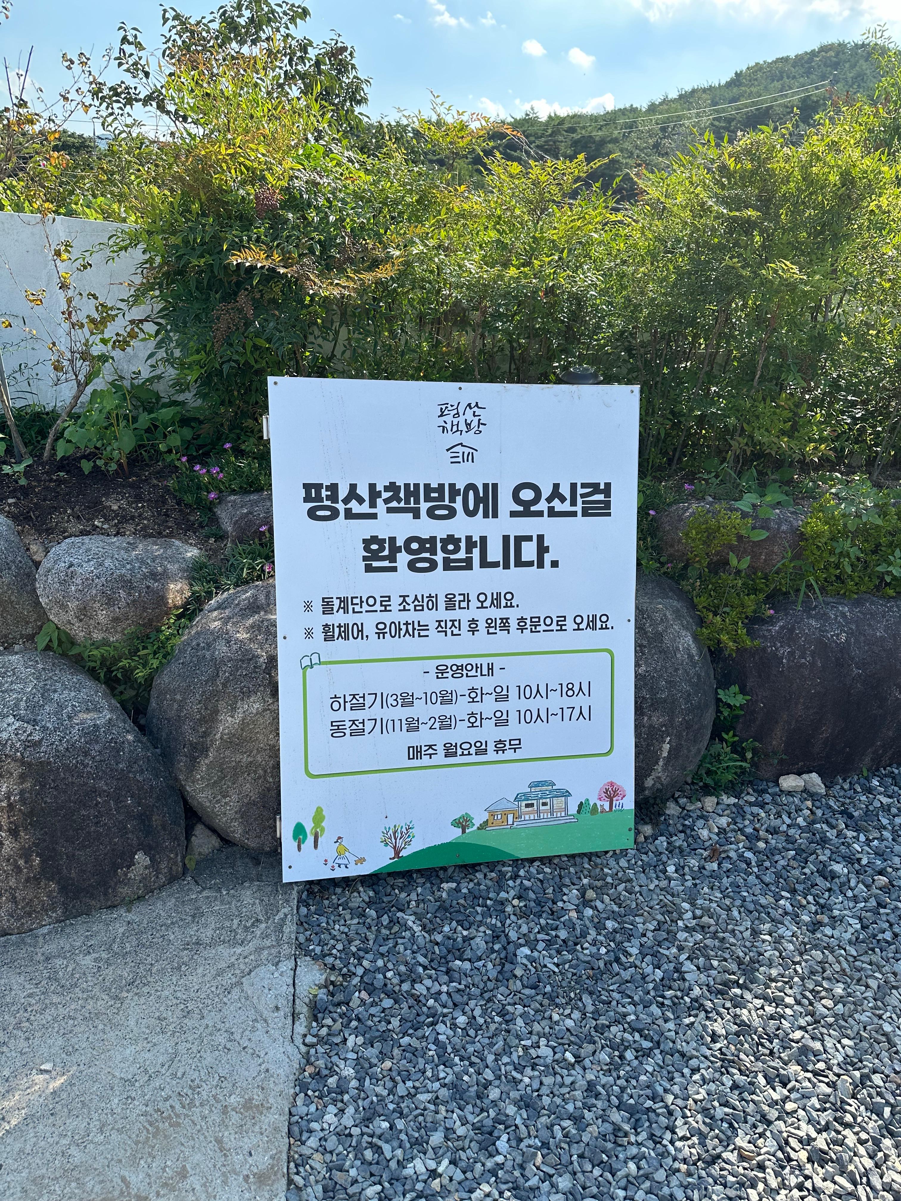 - 평산책방은 관광지보다는 평산마을 주민들이 사는 지역으로 주차가 어려울 수 있습니다. 특히 대통령님 사저가 있는 곳으로 도로변 및 경호에 방해가 될 경우 경호처의 제지를 받을 수 있습니다.