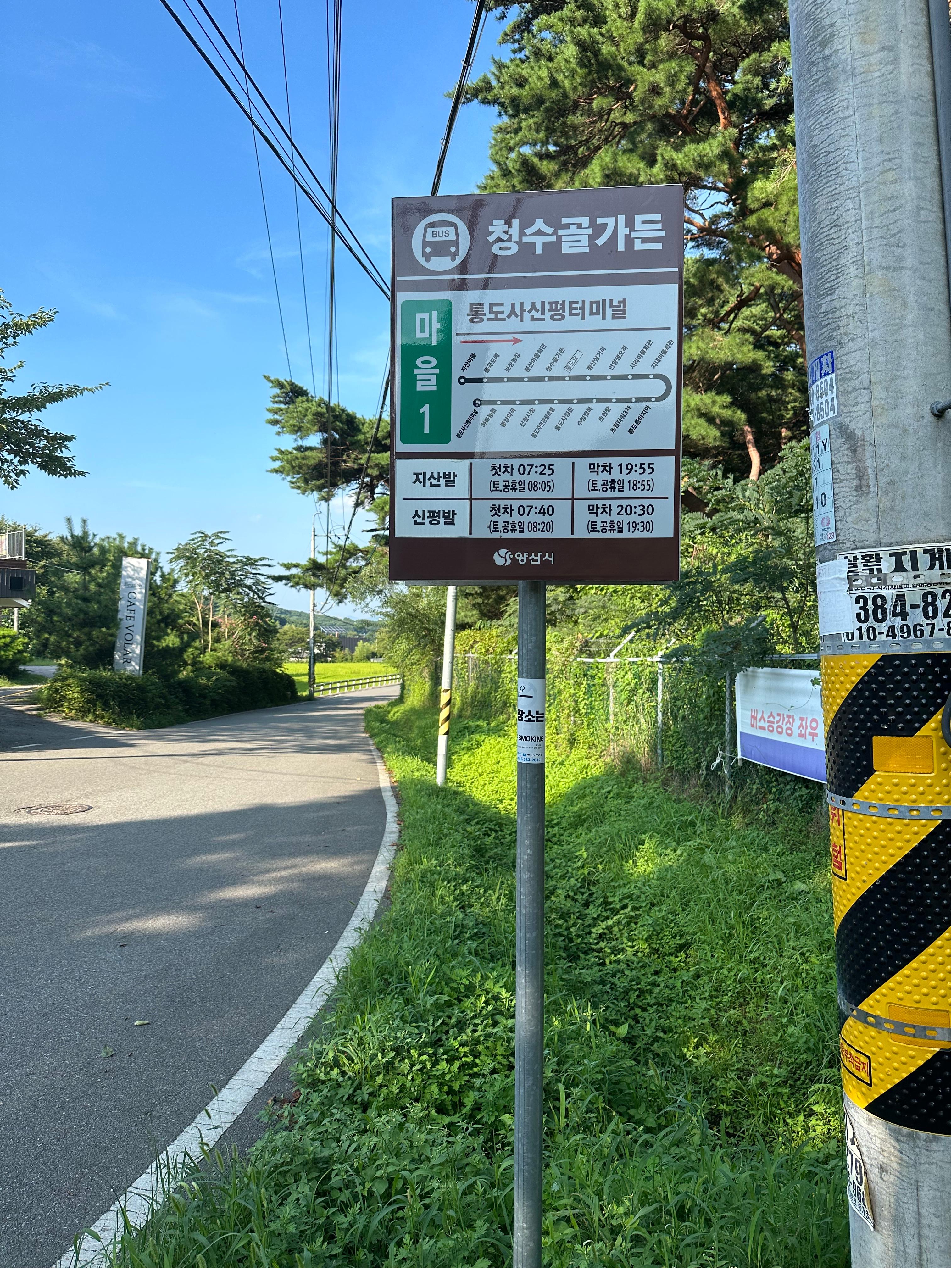 평산책방에서 아쉬운 마음을 뒤로 한채 이제 집으로 돌아가기 위해 평산마을을 걸었습니다. 집으로 갈 때는 평산마을회관이 아니라 회관보다 좀 더 가까운 곳에 청수골가든이라는 정류장이 있었습니다. 정류장에 내려오니까 15분 후에 지산마을에서 버스가 내려오는 것을 확인했습니다. 바로 이전 문재인대통령 사저 보러갈때 만난 할머니가 청수골가든 정류장까지 내려왔더라구요. 혼자온 여행이지만 마치 가이드를 만난것처럼 평산마을에 대한 역사와 문재인대통령이 오시고나서 다양한 일들에 대해 알게 되었습니다. 문재인대통령 오시고나서 사저 주변에서 보수세력 때문에 동네 주민들이 힘들어했다고 합니다. 오신지 얼마안되었을 때는 마을 바로 앞에서 떠들었는데 지금은 사저와 다소 떨어진 곳에서 시위를 하고 있다고 합니다. 그래서 마을버스를 타고가다보면 시위하는 것을 볼 수 있었습니다. 청수골 가든에는 약수터도 있었는데요. 과거에는 약수 옆에 통도사로 바로 가는 길목도 있었지만 지금은 막아놓았다고 합니다.