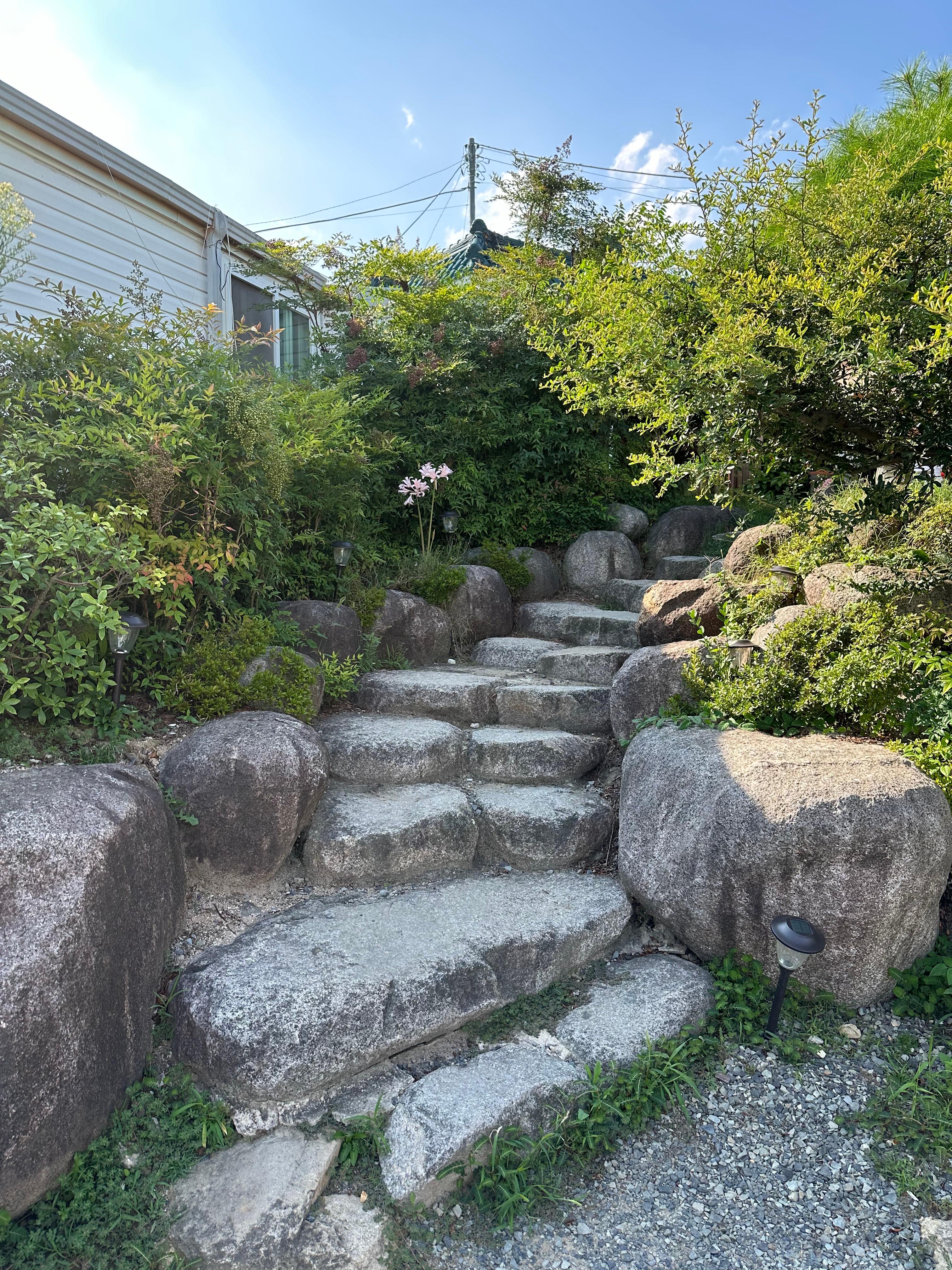 평산책방 입구에서 돌계단을 밟으며 올라오니까 넓지 않으면서 작지 않은 돌마당과 함께 카페가 함께 있는 평산 책방의 모습을 볼 수 있습니다. 평산책방 건물 밖에는 앉아서 쉴 수 있는 의자가 있었습니다. 특히 여름에는 평산책방 건물에 의해 가려지는 건물 바로 앞 의자에 앉아있으면 시원했습니다. 주말이라면 좀 더 사람이 많을 것 같습니다.
