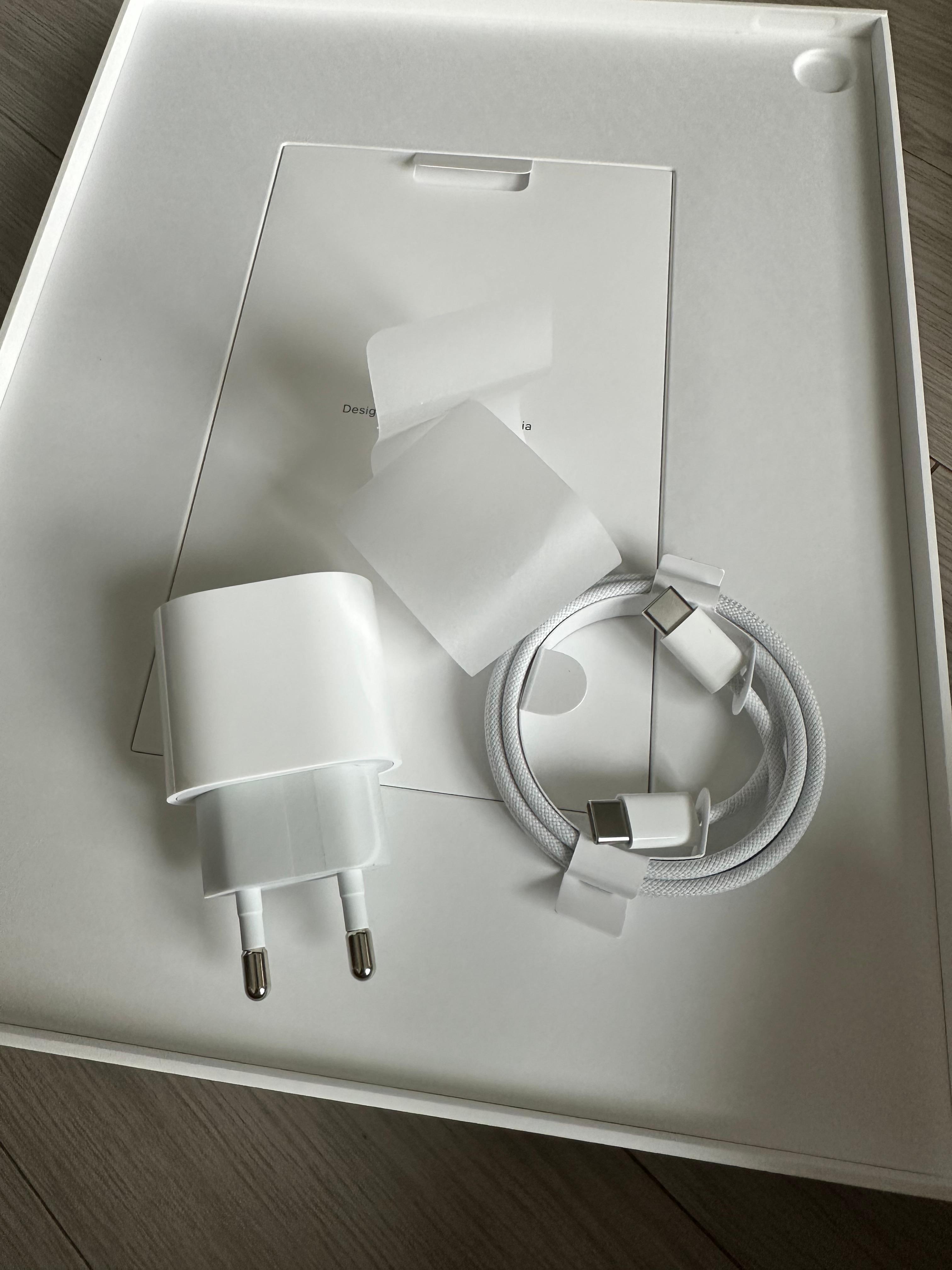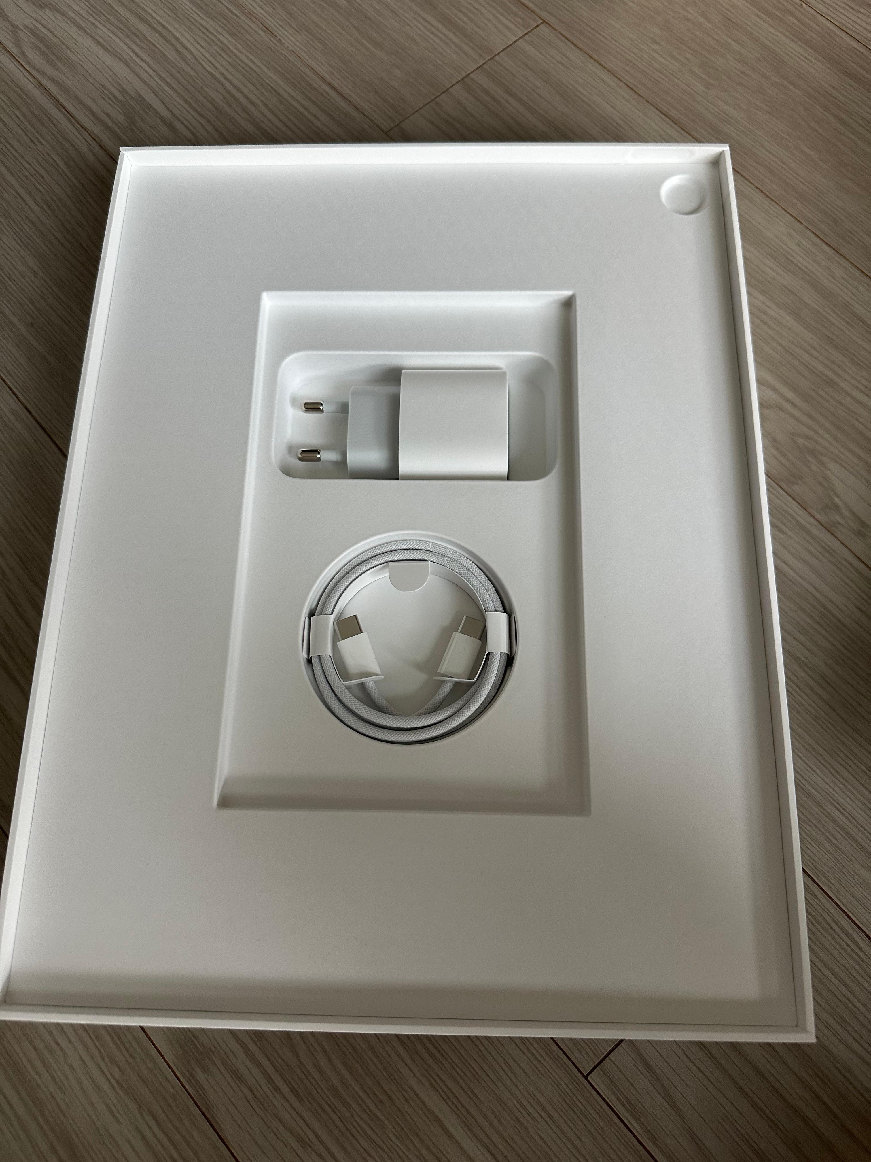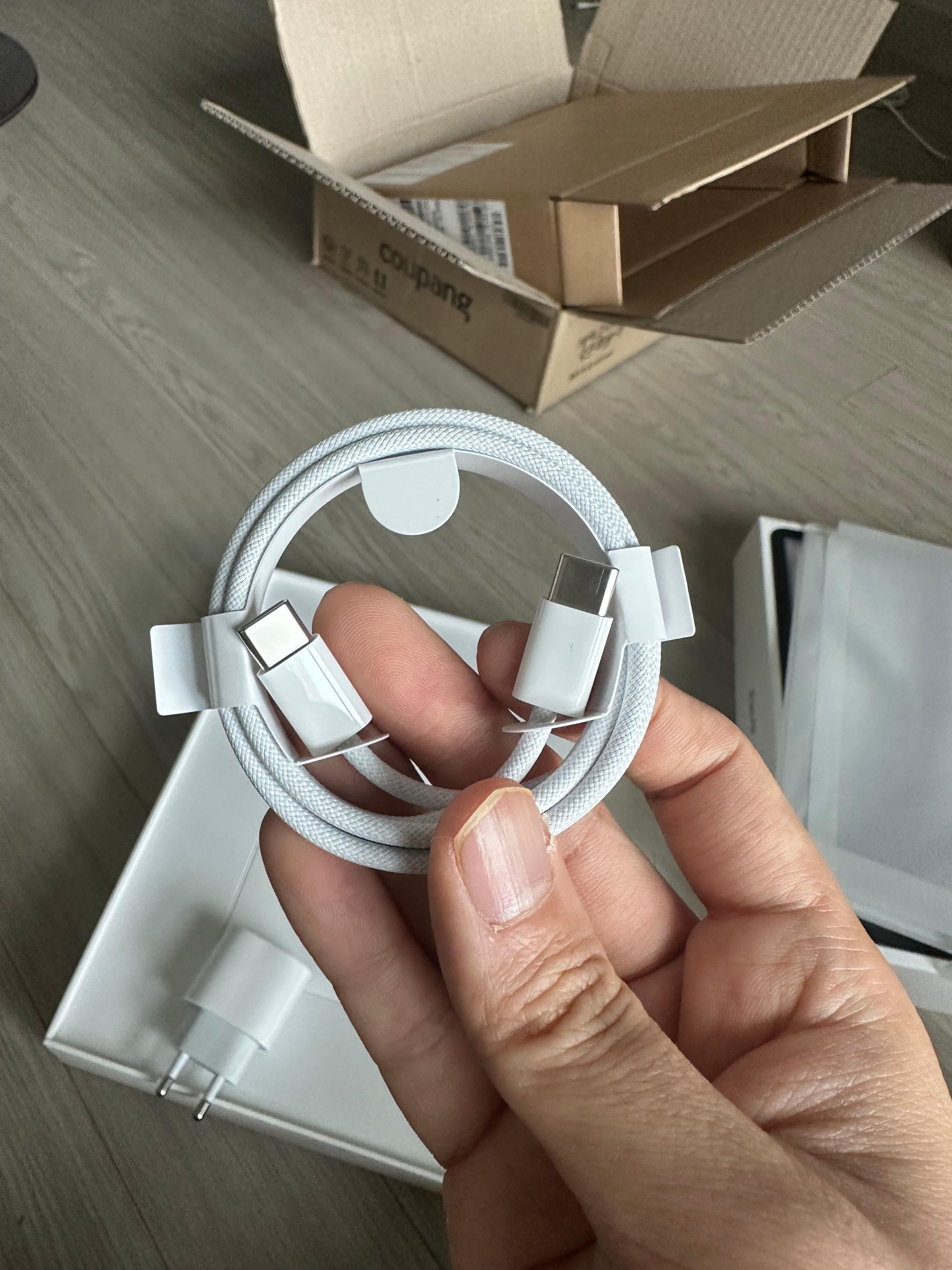 설명서 뒤쪽에는 충전기 어댑터와 충전 케이블이 있었습니다. 2024년에 출시된 아이패드 에어13과 프로13부터는 기존에 USB 방식에서 모두 C타입으로 변경되었는데요. 아이패드 뿐만 아니라 지난 2024년에 출시된 아이폰의 경우에도 C타입으로 출시가 되었습니다. 2024년부터 아이폰과 아이패드 등에서 모두 C타입으로 출시가 되고 있습니다.