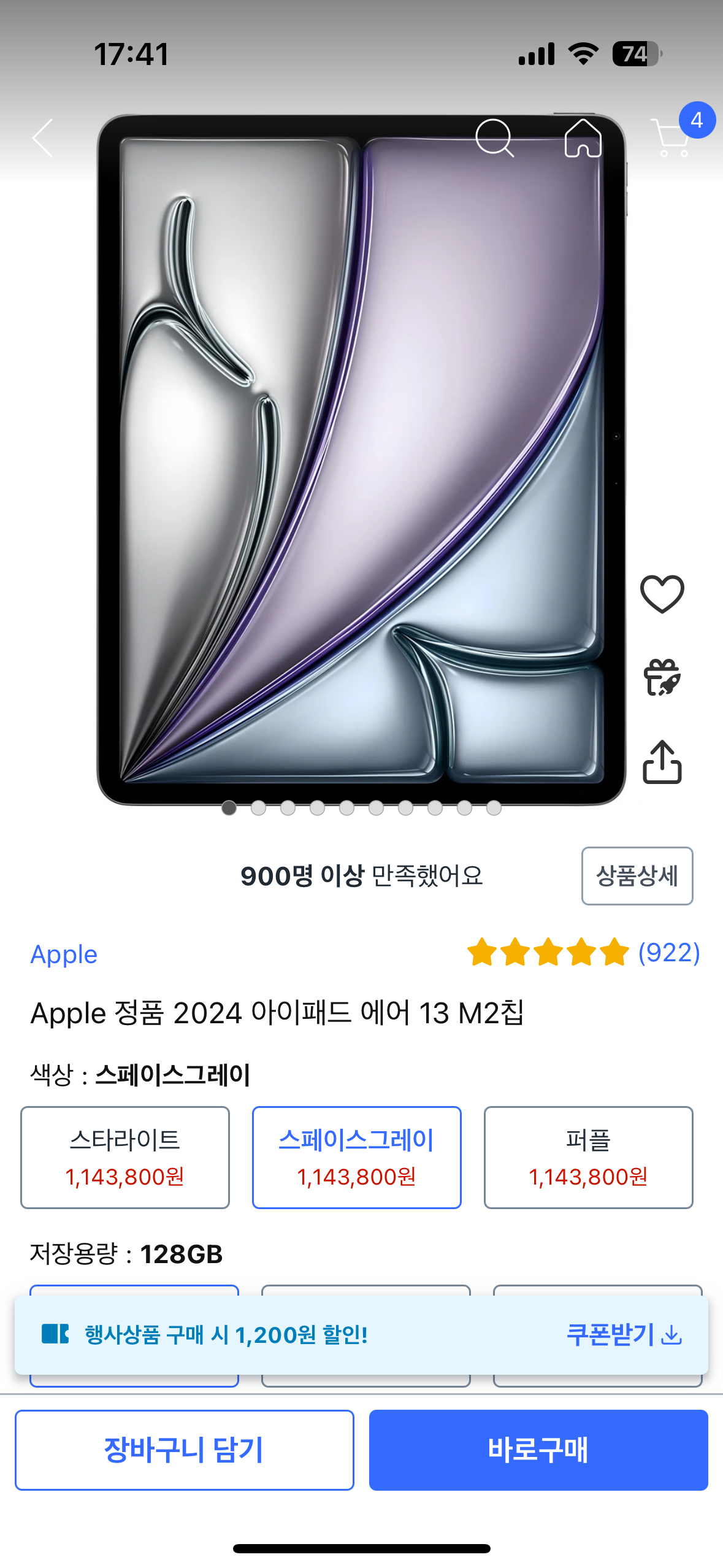블로그를 시작한지 2023년 하반기였는데요. 블로그 시작과 함께 맥북 프로를 구매했던 기억이 있습니다. 당시 사용하던 맥북이 고장나는 급하게 쿠팡을 통해 빠르게 배송받았었는데요. 쿠팡 로켓배송의 가장 장점은 하루만에 배송이 온다는 것인데요. 또한 맥북을 포함한 애플 제품은 고가라서 주문을 하여 배송까지 안전하게 오는 문제도 걱정이 되는데요. 이번에 오래된 아이패드 에어 또한 쿠팡을 통해서 구매하는 과정에서도 금요일 늦은 주문과 함께 다음날 토요일 점심먹을 때 도착했습니다. 과거 쿠팡이 생기기전까지만 해도 택배 배송은 최소한 하루정도는 걸렸지만 쿠팡은 반나절만에도 오기 때문에 로켓배송을 거절할 일이 없습니다. 저는 128GB에 WIFI만 지원 되는 2024 아이패드 에어13을 구매했습니다. 아이패드 에어13은 1,199,000원인데요. 당시 1월 중후반에 구매할 때는 1,139,090원으로 구매했습니다. 제가 아이패드 에어2를 구입할때만 해도 골드 색상이 있었지만 시간이 지나서는 골드색상은 나오지 않습니다. 이는 아이패드 뿐만 아니라 아이폰과 맥북에도 모두 적용되었습니다. 개인적으로 애플 제품은 골드 색상이 마음에 들었지만 그게 사라진 이후로는 아쉬운감이 있습니다. 아이패드에서는 스타라이트 색상이 골드색상과 가깝지만 당시 1월중후반에는 색상별로 가격 차이가 있었습니다. 그러나 지금은 모든 아이패드 에어13 가격이 동일하게 할인없이 1,143,800원에 판매되고 있었습니다.