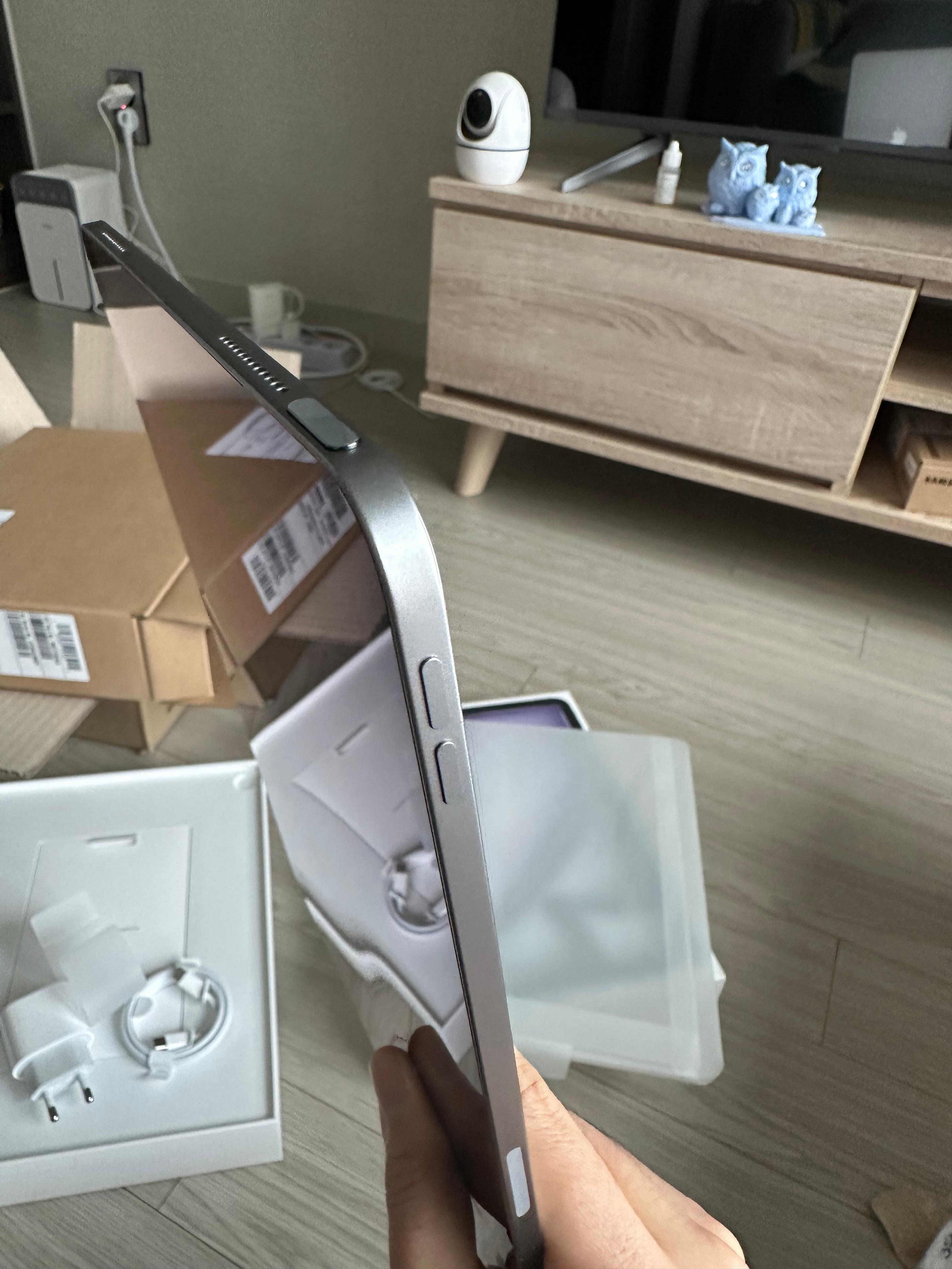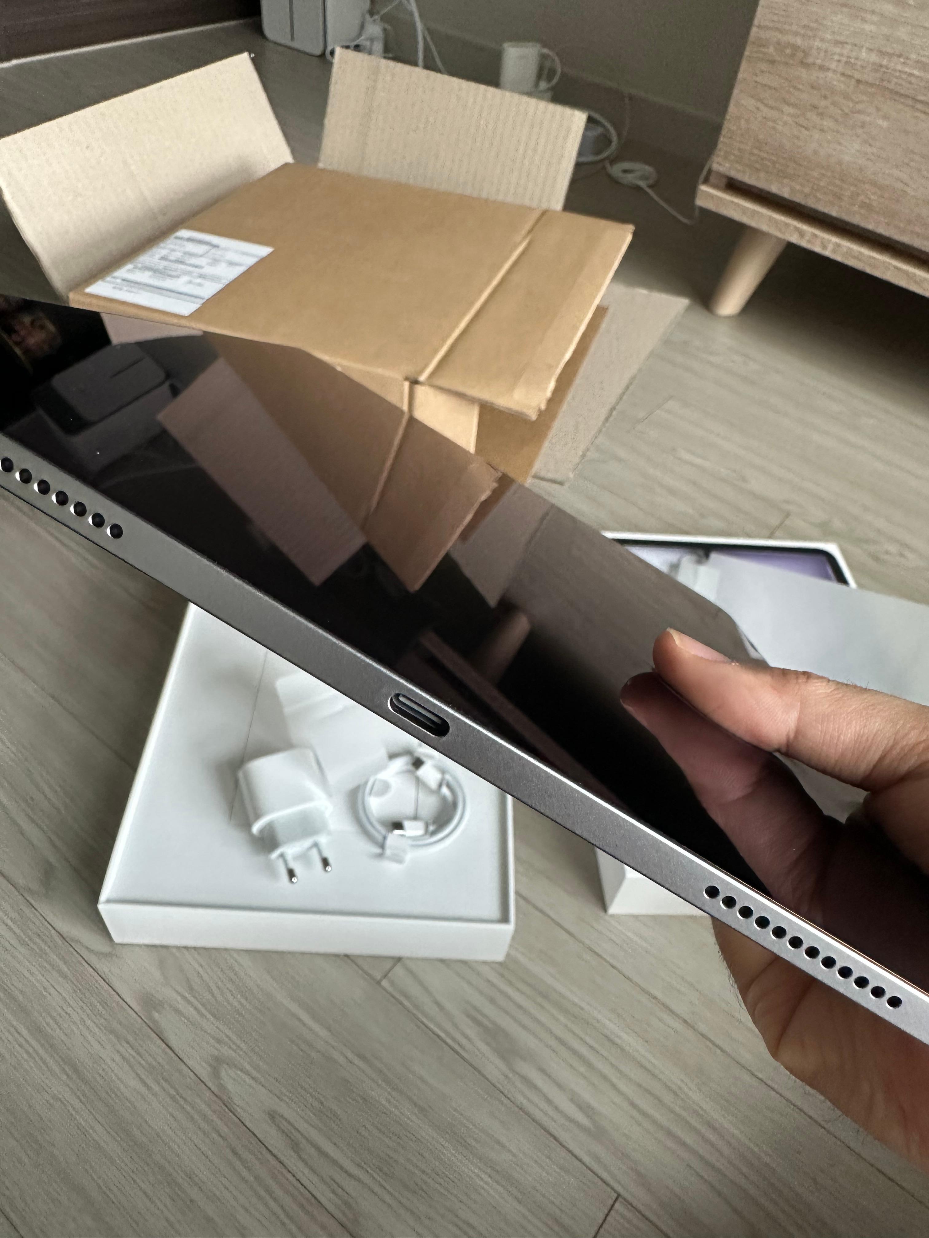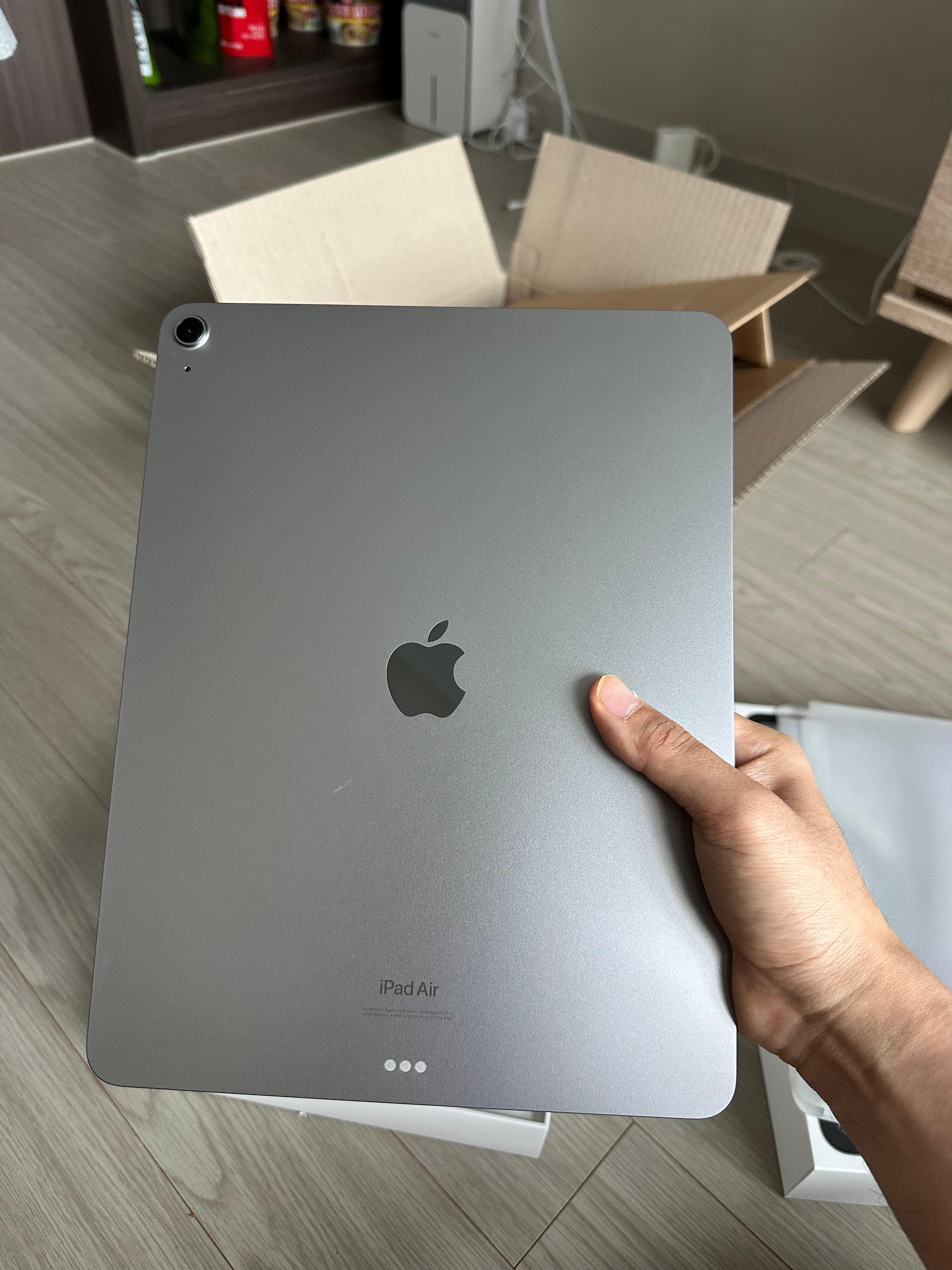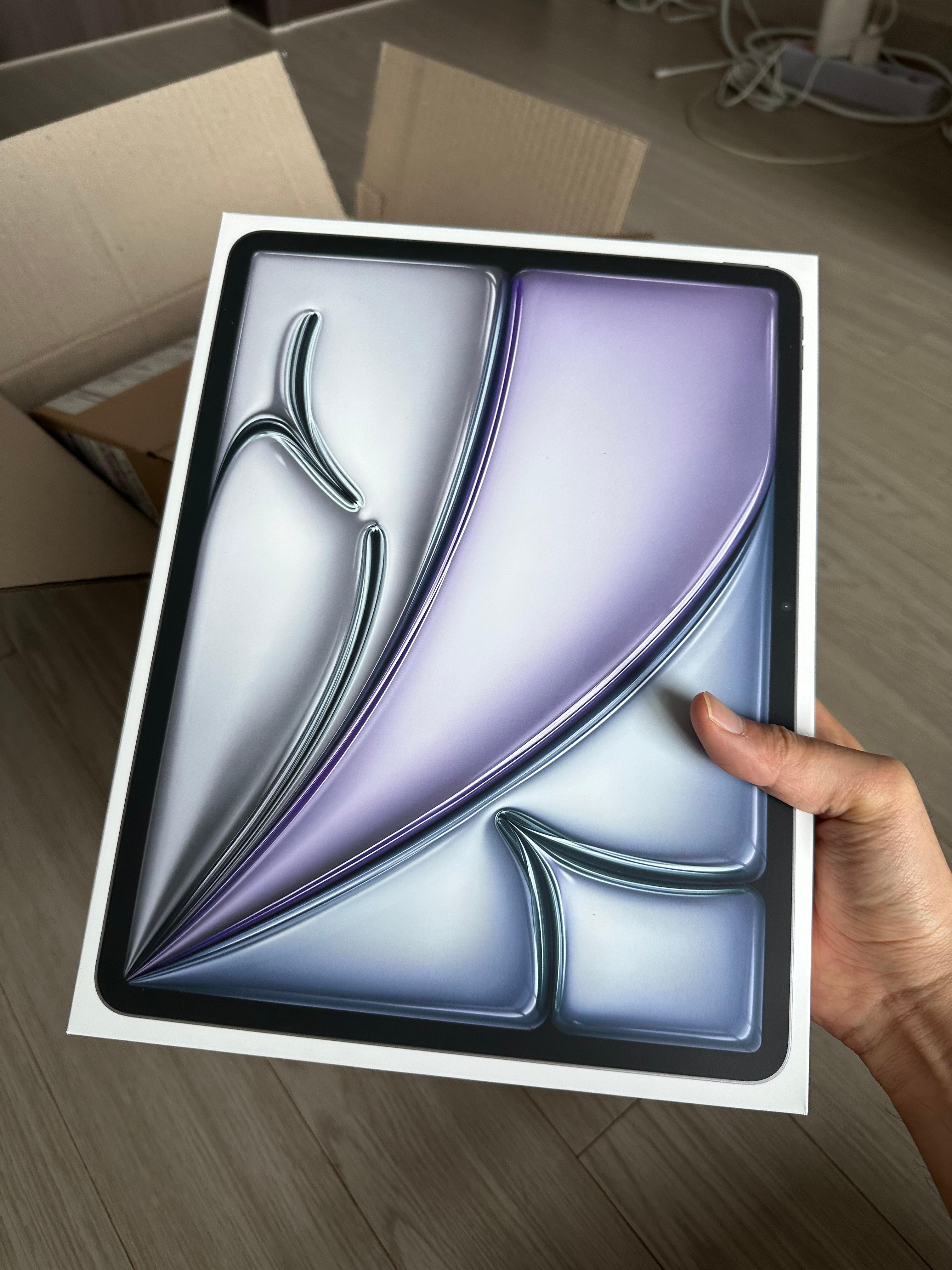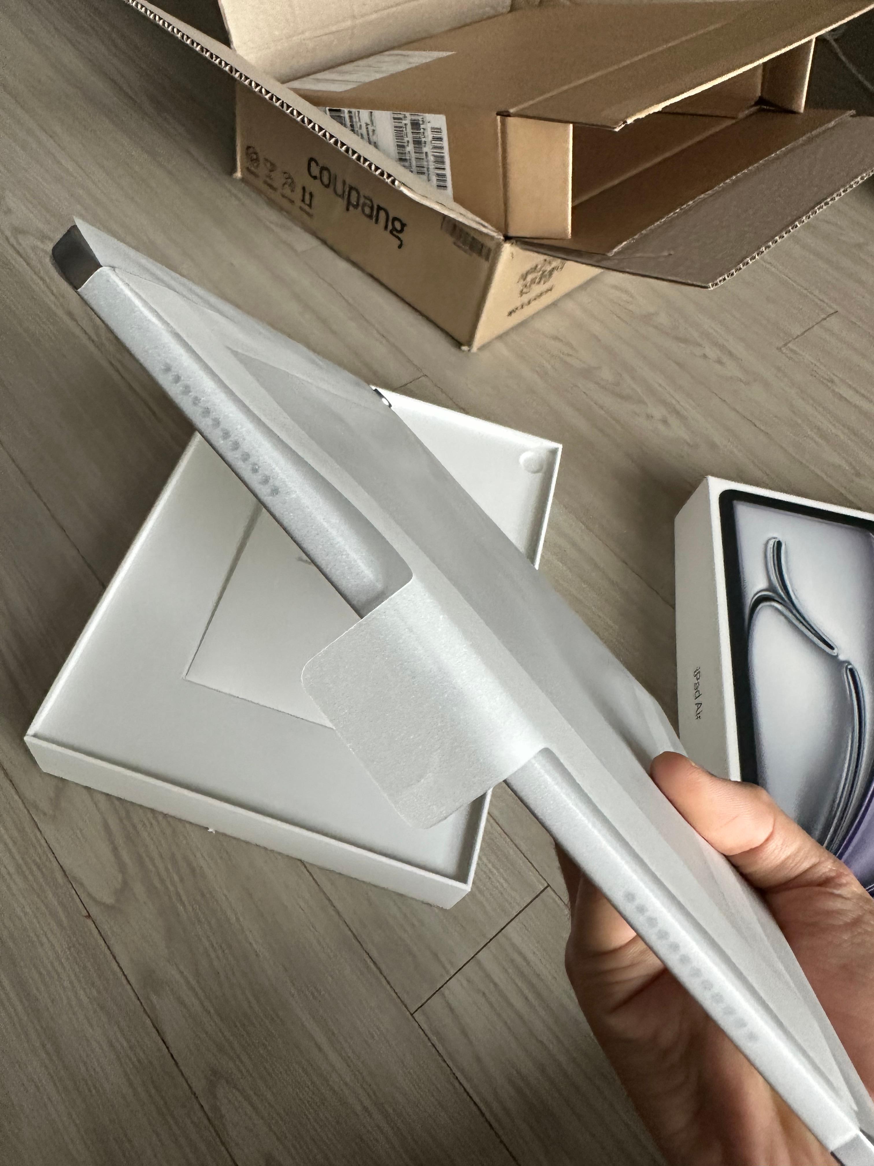 드디어 제품 박스 뚜겅을 열어였습니다. 워낙의 고가의 제품이다보니 포장도 정말 여러번 되어있었습니다. 특히 배송으로 전달받는거라서 제품 박스 위에 포장박스까지 정말 개봉하는데 힘들었습니다. 아이패드에어13 속필름종이를 벗기기전인데요. 제품을 손으로 들어올렸는데 정말 슬림한것을 볼 수 있습니다. 아이패드 에어13의 경우 사진으로 보면 그렇게 크다는 것을 느낄 수없지만 실제로 제품을 보면 정말 크고요. 화면이 크면서 가볍다는 것을 볼 수 있습니다. 10년전 2014년에 구매한 아이패드 에어2의 경우 에어13에 비하면 화면이 작지만 무거운 감이 있었지만 기술의 발달과 함께 가벼우면서 화면이 커진 것을 볼 수 있습니다. 2014년에는 아이패드 에어13과 아이패드 프로 13이 동시에 출시했습니다. 크기는 에어13과 프로13이 크게 차이는 없습니다. 그러나 에어13은 M2칩이며, 프로13의 경우 M4칩으로 성능이 더 좋으며 가격이 더 비싼 것을 볼 수 있습니다.