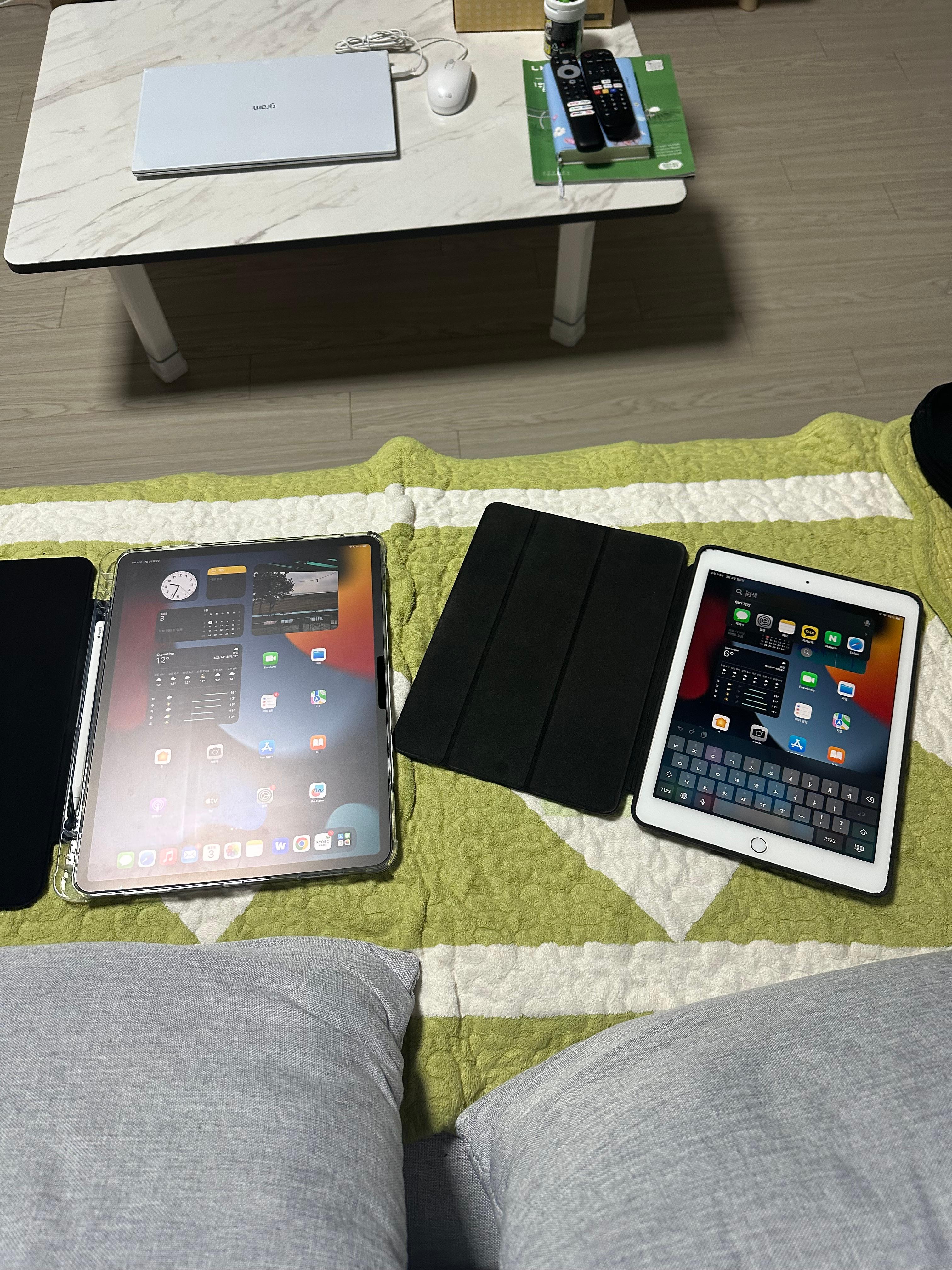 제가 10년전에 구매하여 사용중이었던 아이패드 에어2(우측)과 이번에 새로 구매한 아이패드 에어13(좌측)의 모습입니다. 확실히 이번에 구매한 아이패드 화면이 더 큰 것을 볼 수 있습니다.