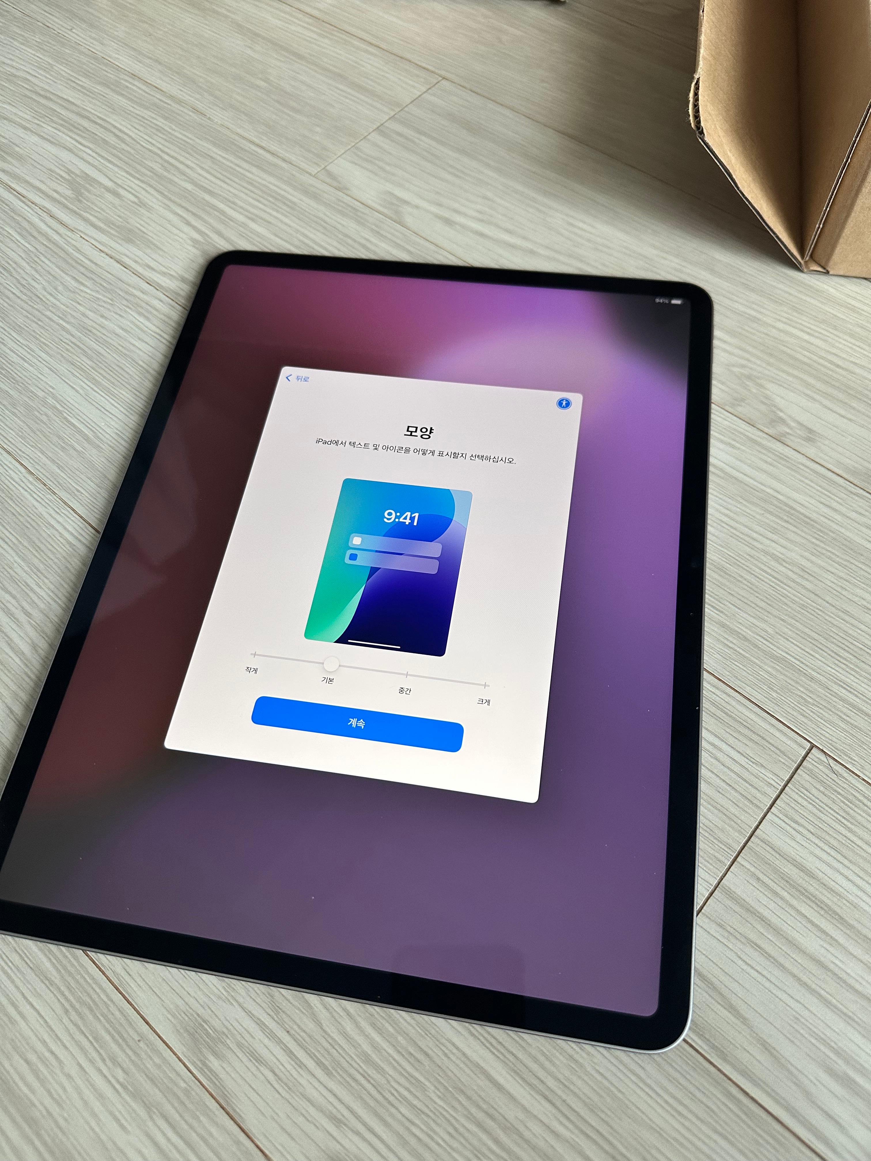 이제 본격적으로 아이패드 에어 13을 사용하기 위해 상단에 터치 부분을 길게 눌러서 전원을 나오게 했습니다. 익숙한 애플의 로고인 사과모양이 떴습니다. 아이폰과 동일하게 순차적으로 계속 버튼을 눌러가며 아이패드를 설치하기 시작했습니다. 애플을 사용하는 경우 아이클라우드를 통해 사용하는 앱과 다양한 설정을 백업하기 때문에 과거처럼 사진을 옮길 필요없이 자동으로 백업을 받을 수 있는 특징이 있습니다. 제가 20살때만 하더라도 기존 핸드폰을 바꾸고 나면 사진과 연락처를 옮겨야 하는 번거로움이 있었습니다. 그래서 개통 후 대리점에서 오랫동안 기다리던 추억이 있는데요. 그런데 아이폰 사용하면서는 아이클라우드를 통해서 연락처와 사진, 기존에 사용하던 어플까지 모두 백업이 가능해서 정말 좋았습니다.