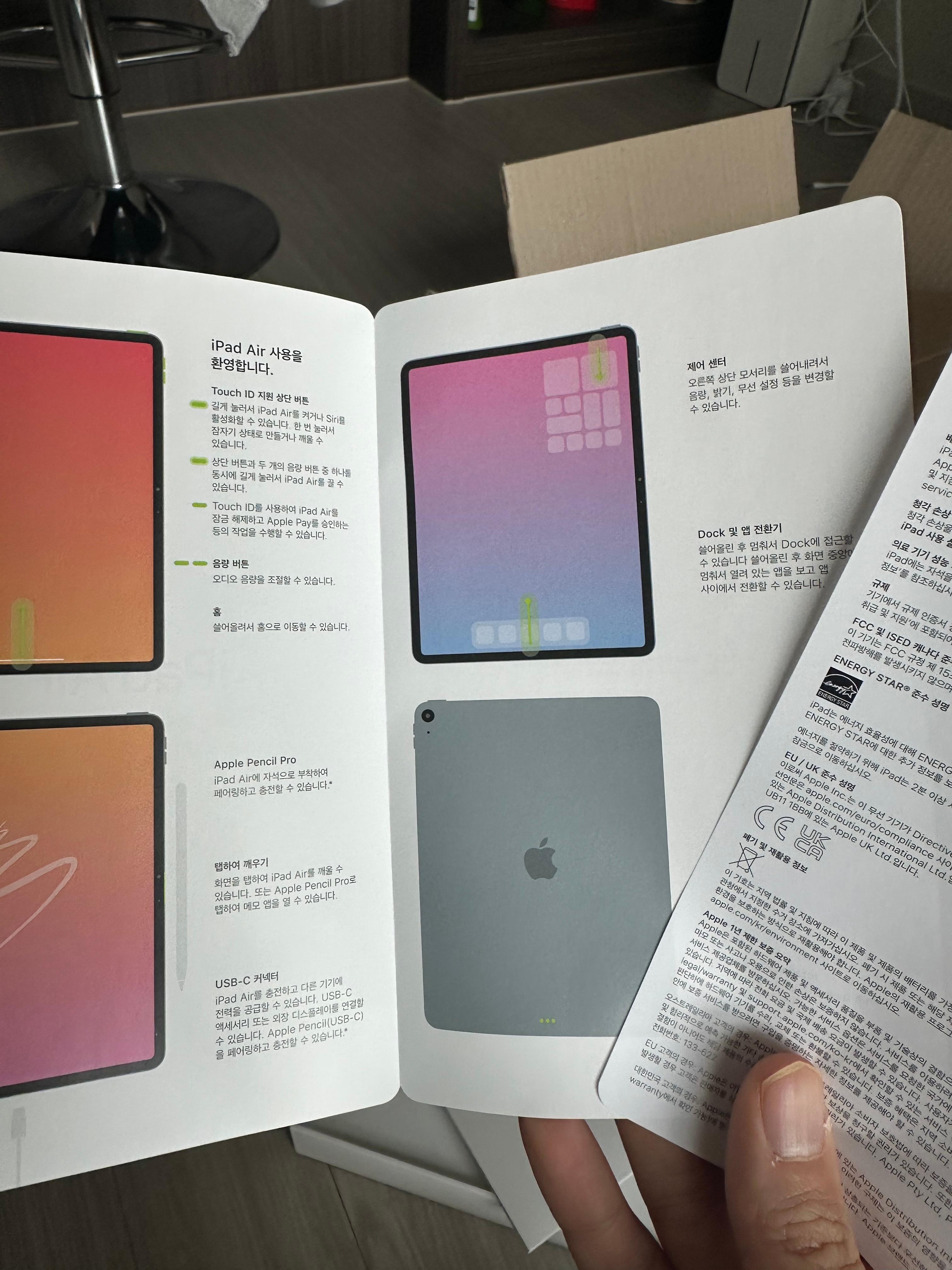 아이패드 에어13 제품 박스에서 아이패드를 꺼내니까 안쪽에는 아이패드 에어13에 대한에 대한 제품 설명서와 제품 정보에 해당하는 핸드북이 있었습니다.