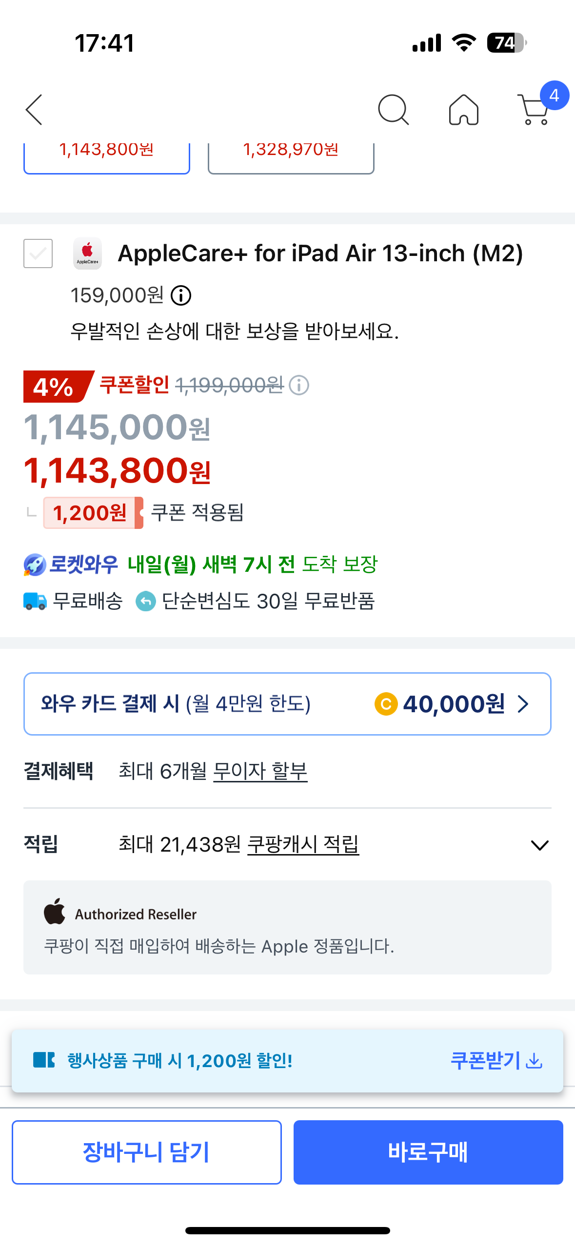 - 쿠팡에서 구매 시 애플 케어도 함께 구매가 가능합니다. 아이패드 에어13 모델을 기준으로 애플케어는 159,000원에 구매 신청 할 수 있습니다.