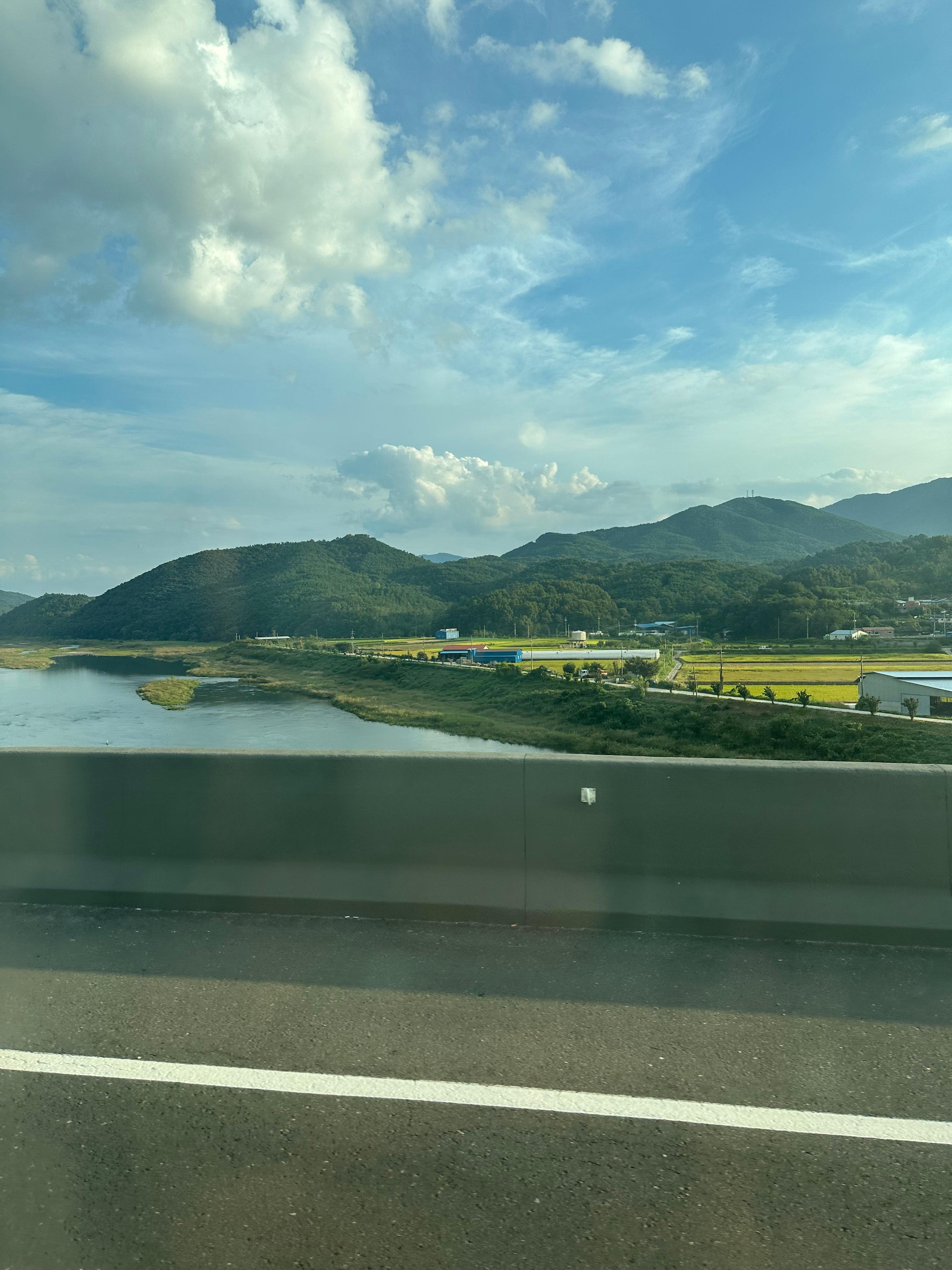 금산 인삼랜드 휴게소는 대전을 지나서 나오는 휴게소이고 그이후부터는 이렇게 시골 모습을 그대로 볼 수 있는 풍경이 드러납니다. 금산 인삼랜드 휴게소를 지나서 진주와 통영가는 길에는 덕유산 있어서 특히 덕유산 주변의 자연을 그대로 느낄 수 있는 모습이었습니다.