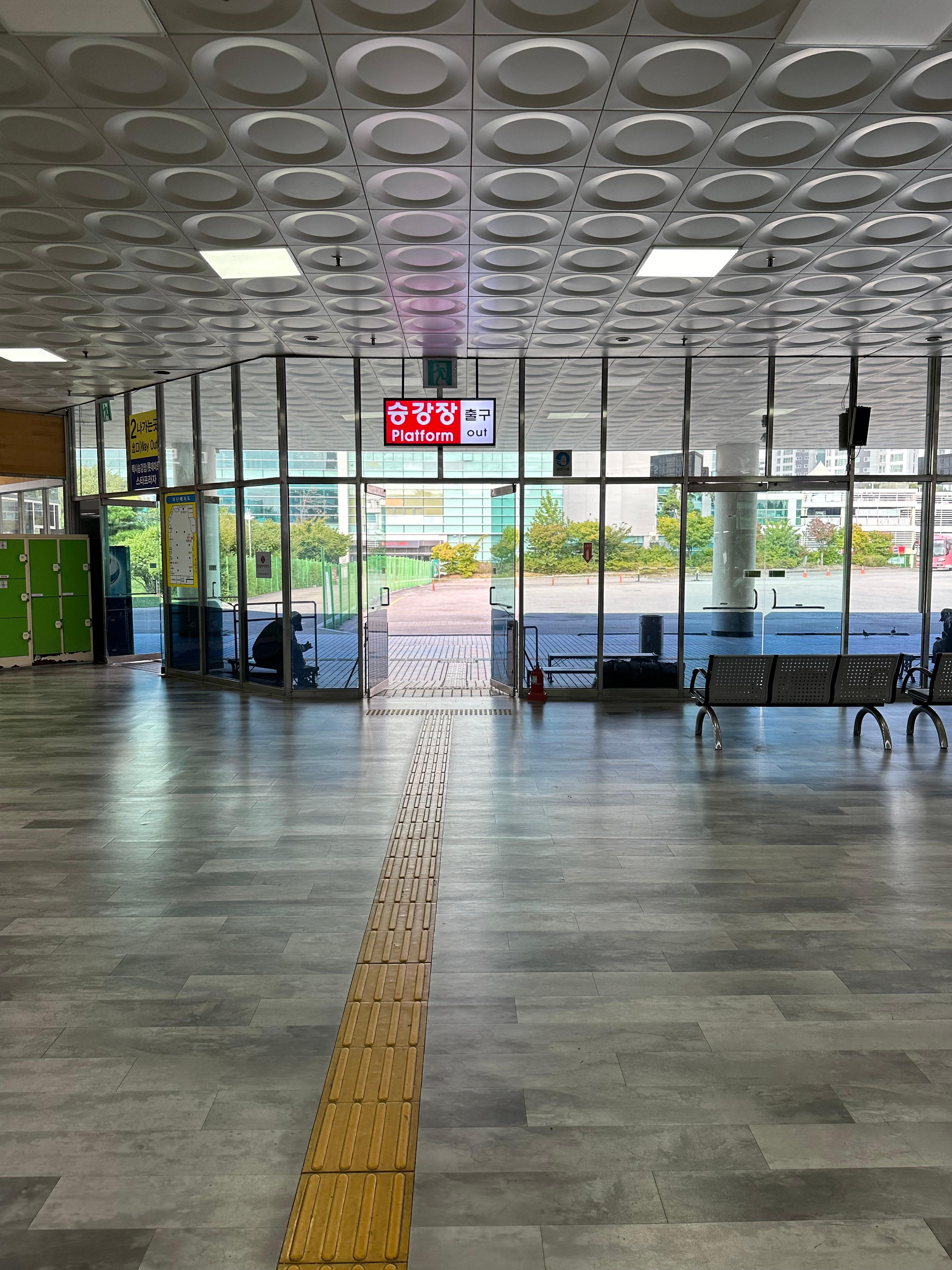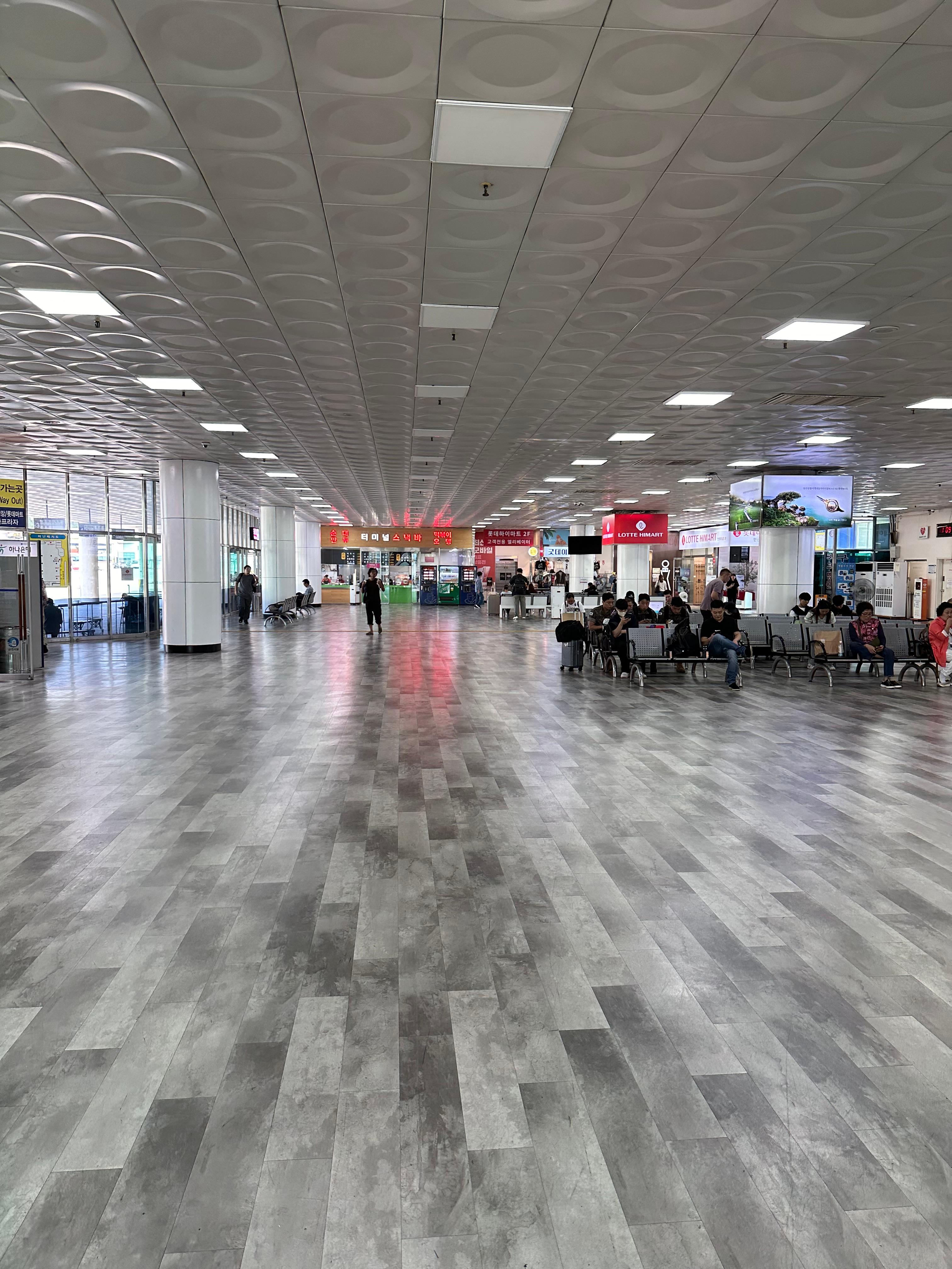안산시외버스터미널 건물 1층은 넓은 공간으로 대합실과 매표소 그리고 승강장으로 나갈 수 있는 출구가 있습니다. 승강장 출구를 통해서 인근 롯데마트로도 바로 갈 수 있습니다. 과거에 무인 매표소가 생겨나기 전에는 직원 창구가 많은 것을 볼 수 있지만 지금은 직원 창구가 줄어들고 무인 단말기가 더 늘어난 것을 많이 볼 수 있습니다.