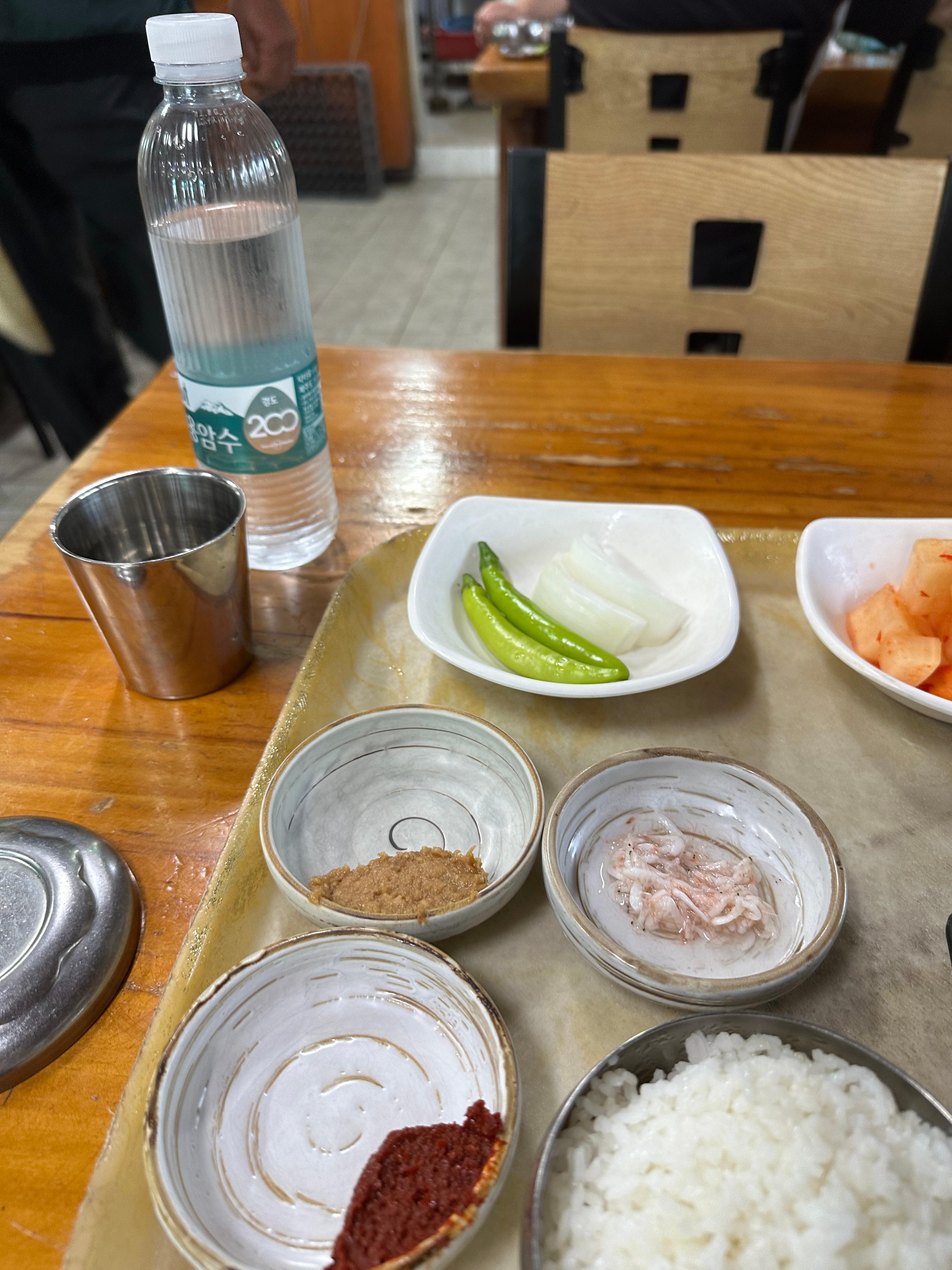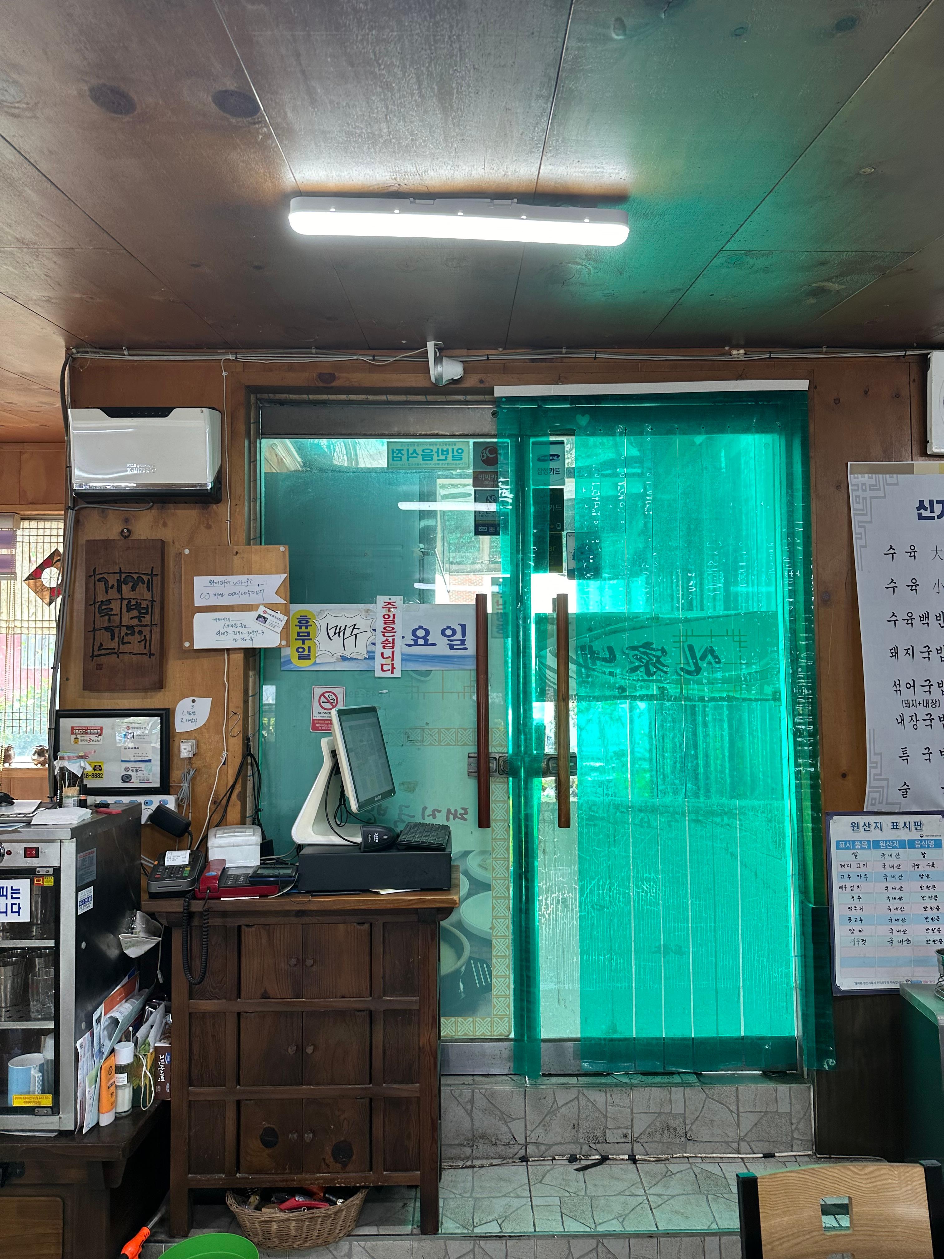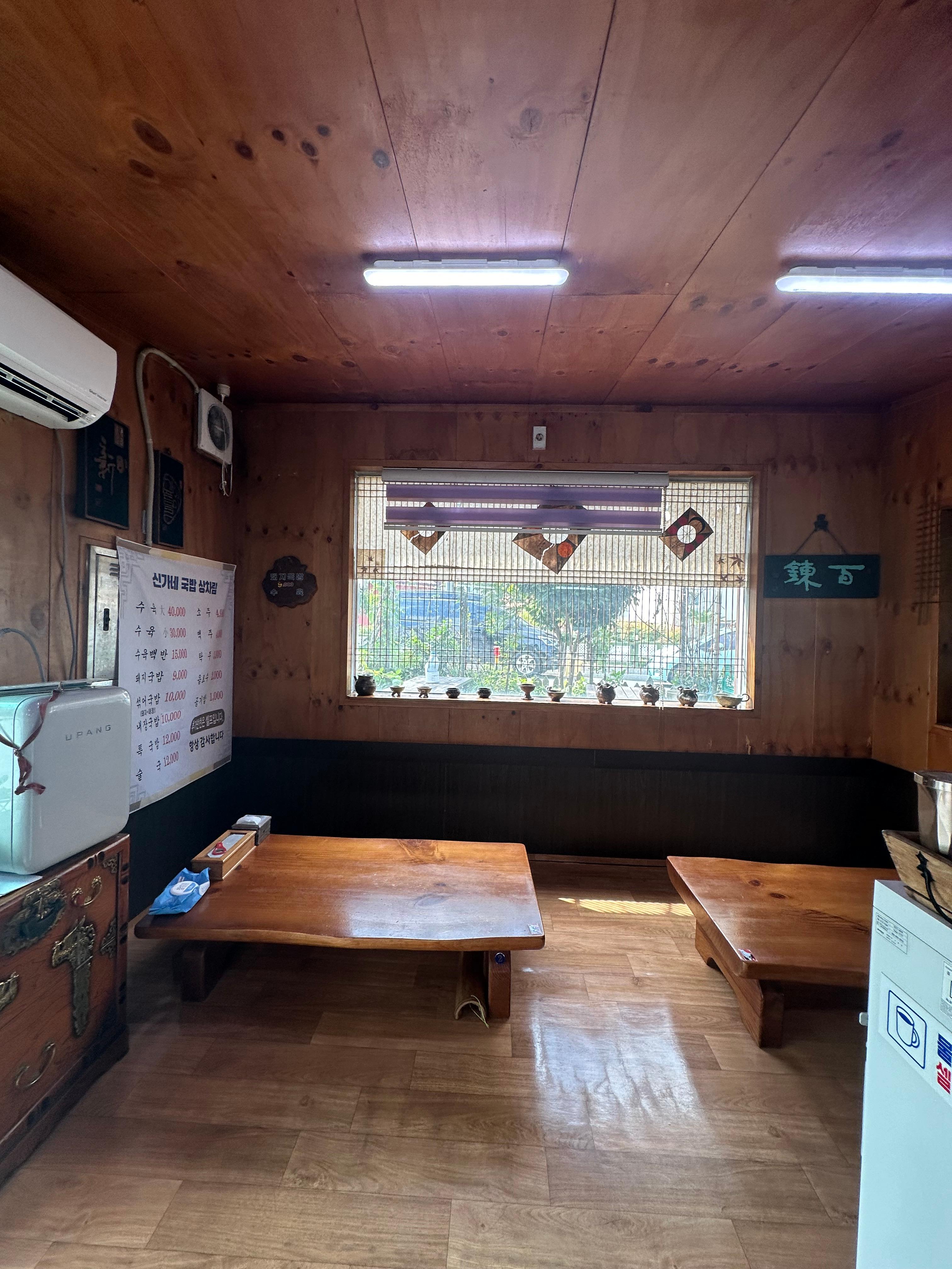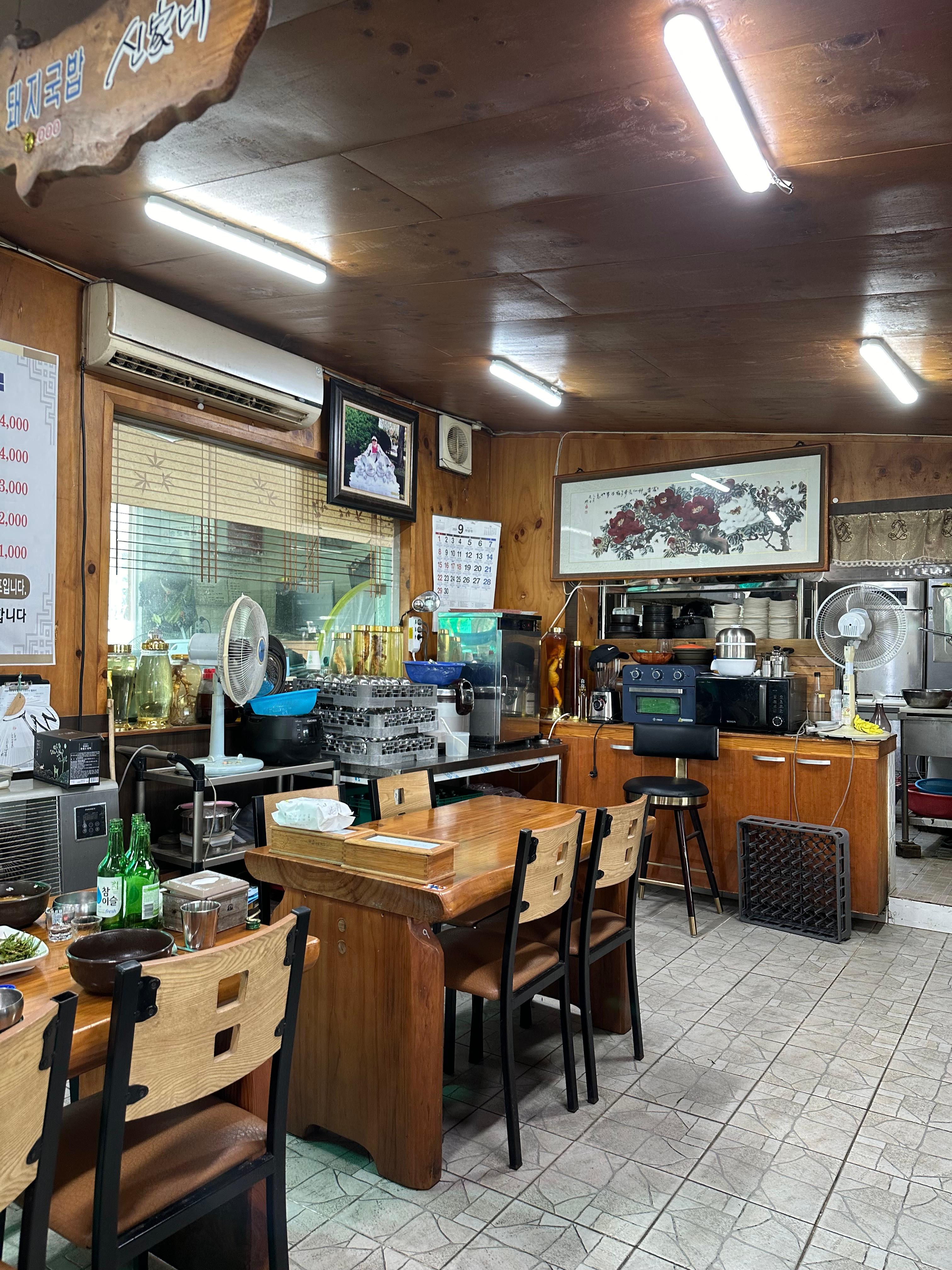 금요일에 슬로비 게스트하우스에 도착하였을 때는 주말이 아니라서 그런지 숙박하는 게스트들이 많이 없었습니다. 그래서 조식은 제공되지 않고 슬로비 1층 카페에서 판매되는 음료 서비스만 제공되었습니다. 원래는 슬로비게스트에서 도보로 조금 걸어가면 보리밥 집이 있는데요. 하필이면 조식도 제공되지 않는데 보리밥집마저 문을 닫았습니다. 그래서 음료만 먹고 아침도 먹지 못한채 점심까지 숙소에서 바다와 산을 보며 휴식을 취하다가 점심시간이 조금 지난 시간에 오게 되었습니다. 점심시간이 조금 지난 시간이라 그런지 신가네 국밥은 손님들이 많지 않은 모습이었습니다. 겉에서 보았을 때 작지 않은 규모의 식당이라는 것처럼 느낀것처럼 내부도 조금은 낡아보이지만 통영에서 오랫동안 장사한 흔적이 그대로 보여지는 모습이었습니다.