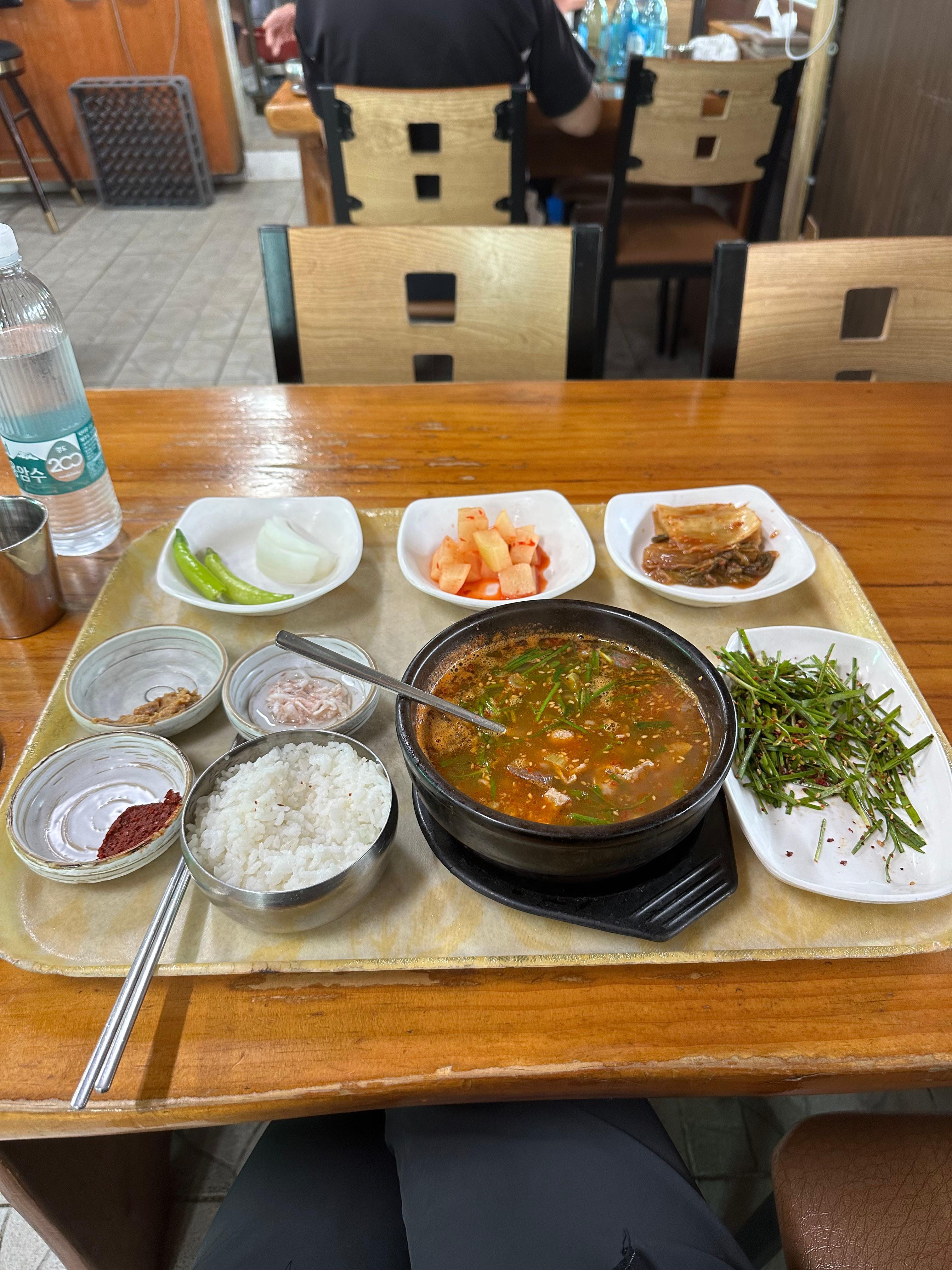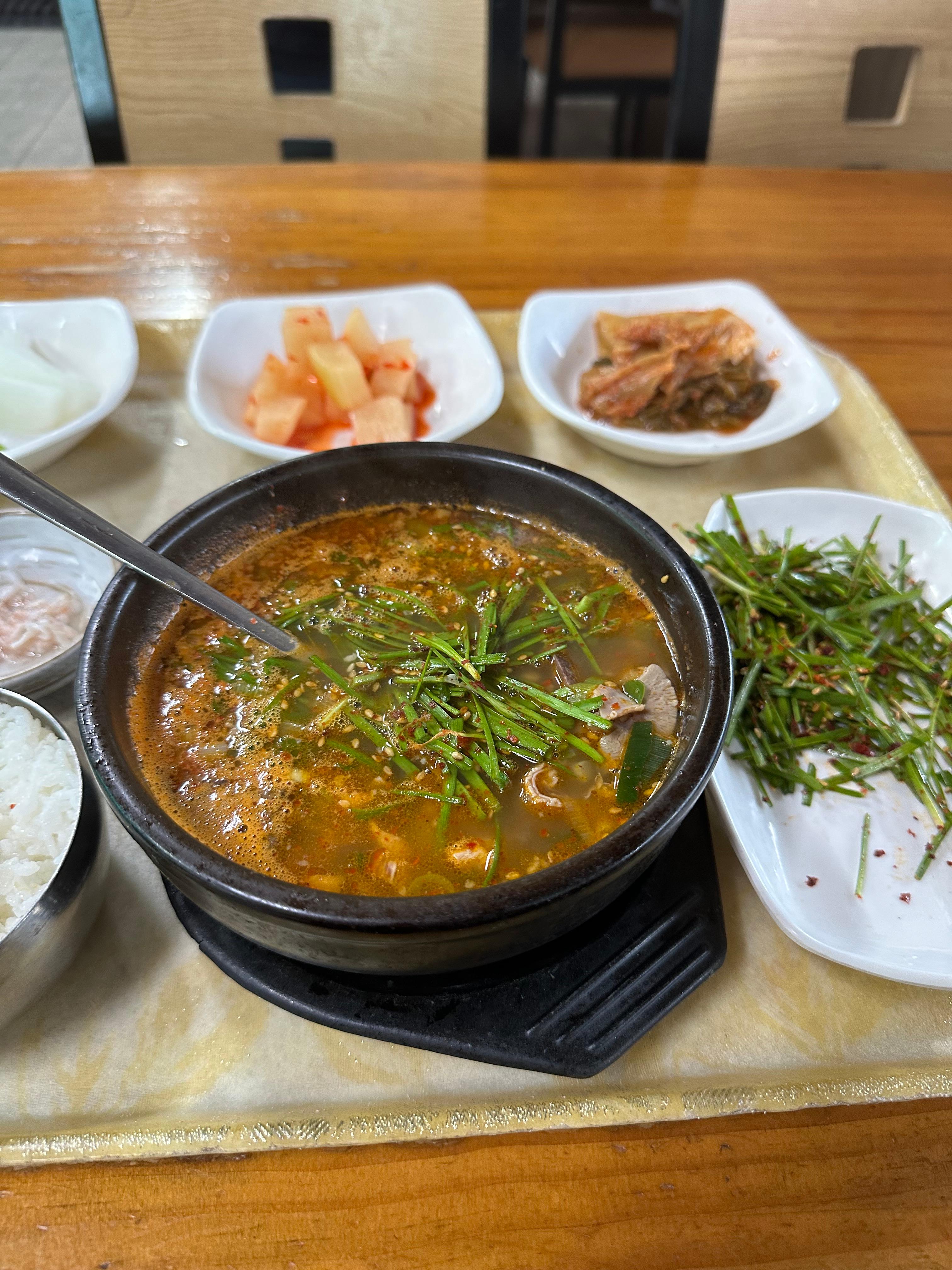 내장국밥 위에 부추무침을 먹을만큼 먼저 넣어서 먹어보았습니다. 사실 부추무침 다 넣어서 먹어도 괜찮은데요. 특히 통영 심가네국밥은 처음왔지만 이미 슬로비게스트하우스에서 추천하는 맛집이고 오래된 맛집의 경우 간은 다 맞쳐서 나오기 때문에 뭘 어떻게 먹든 맛있기는 합니다. 하지만 혹시라는게 있을 수 있습니다. 막상 믿고 넣었는데 입맛이 아닐 수 있기 때문에 한번은 의심하면서 적정량 넣어가면서 본인에게 맞추는 습관이 더 안전하고 좋은 것 같습니다.