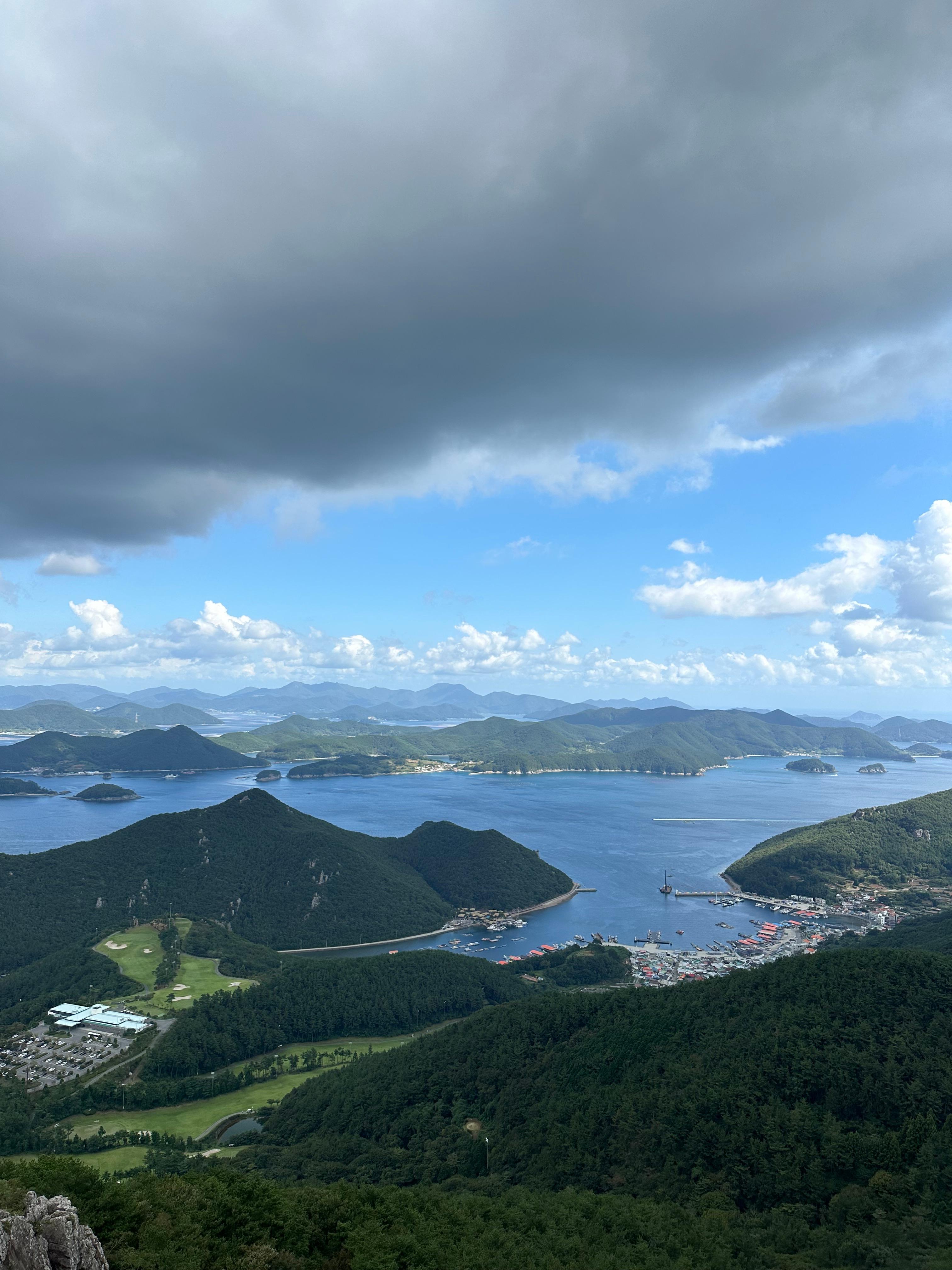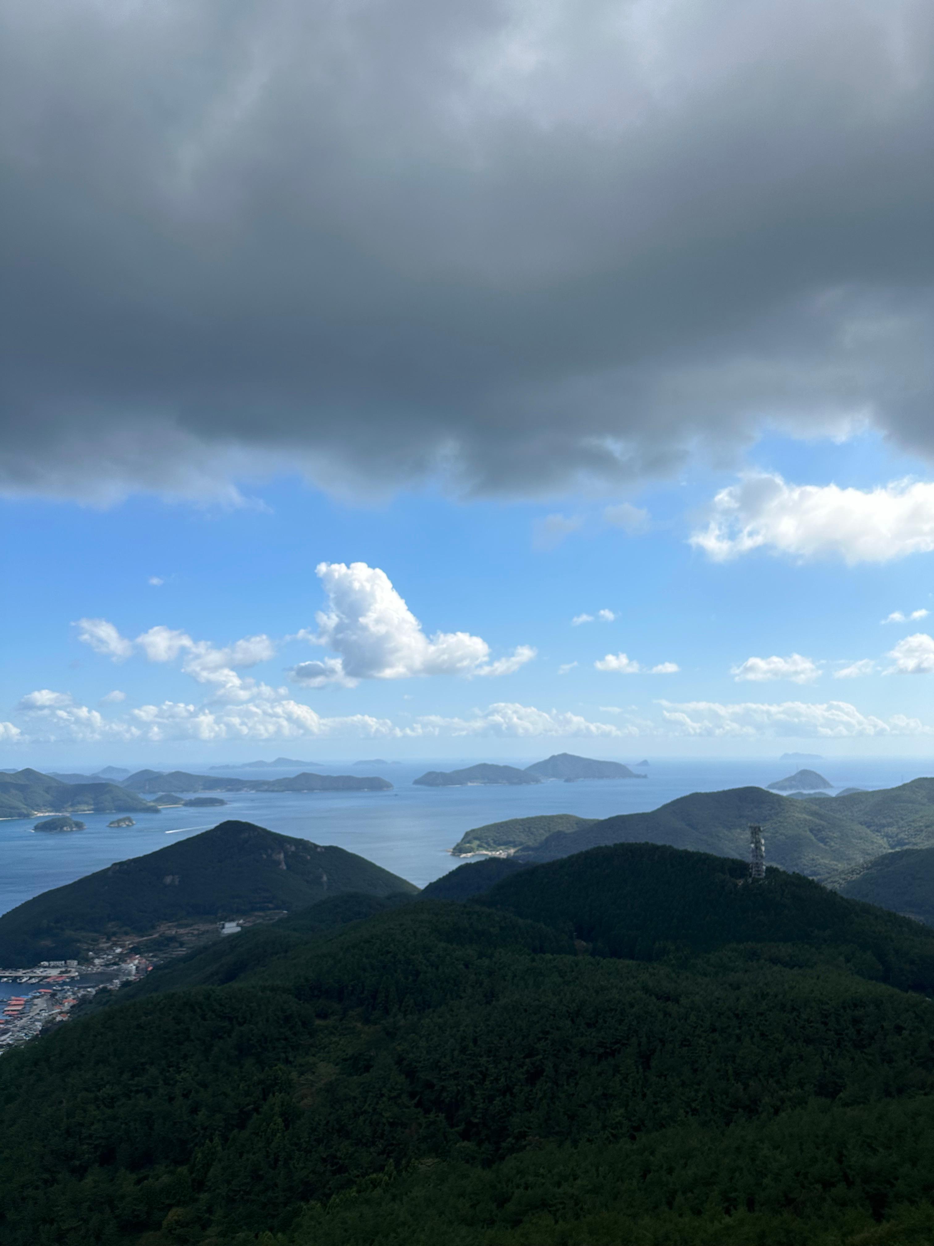 통영은 지역 전체가 섬으로써 통영 시내 역시 섬으로 볼 수 있습니다. 통영 시내인 통영항에서 배로 한산도, 연화도, 만지도, 연대도, 욕지도, 소매물도, 장사도 등 작은 섬들이 있습니다. 한산도가 가장 가까운 섬으로 네이버지도나 카카오맵으로 비교하면 어디가 한산도인지도 케이블카를 타고가면서도 알 수는 있습니다. 가을날씨로 바다와 푸른 산과 자연의 모습이 정말 아름다운 통영의 모습이었습니다.