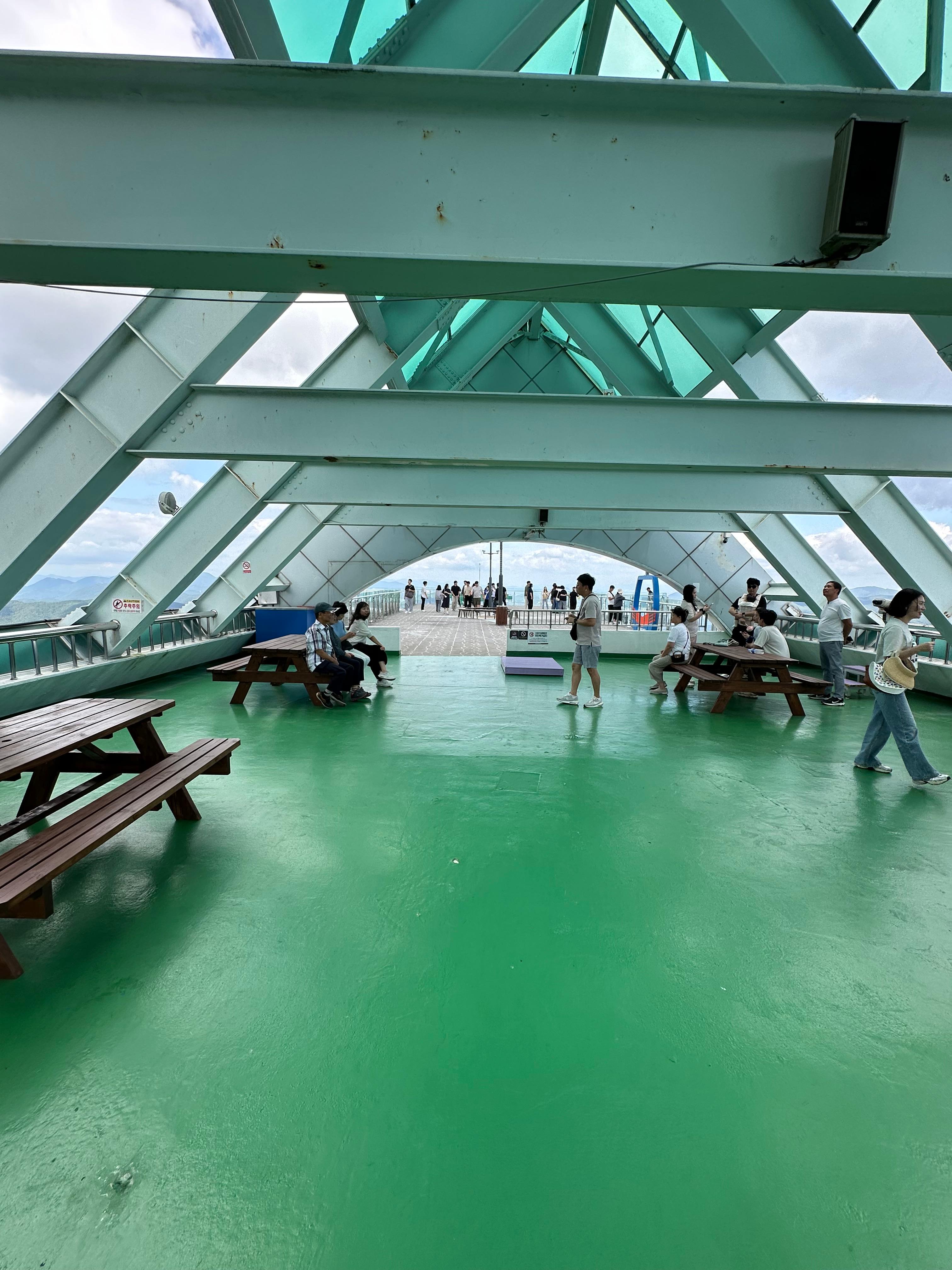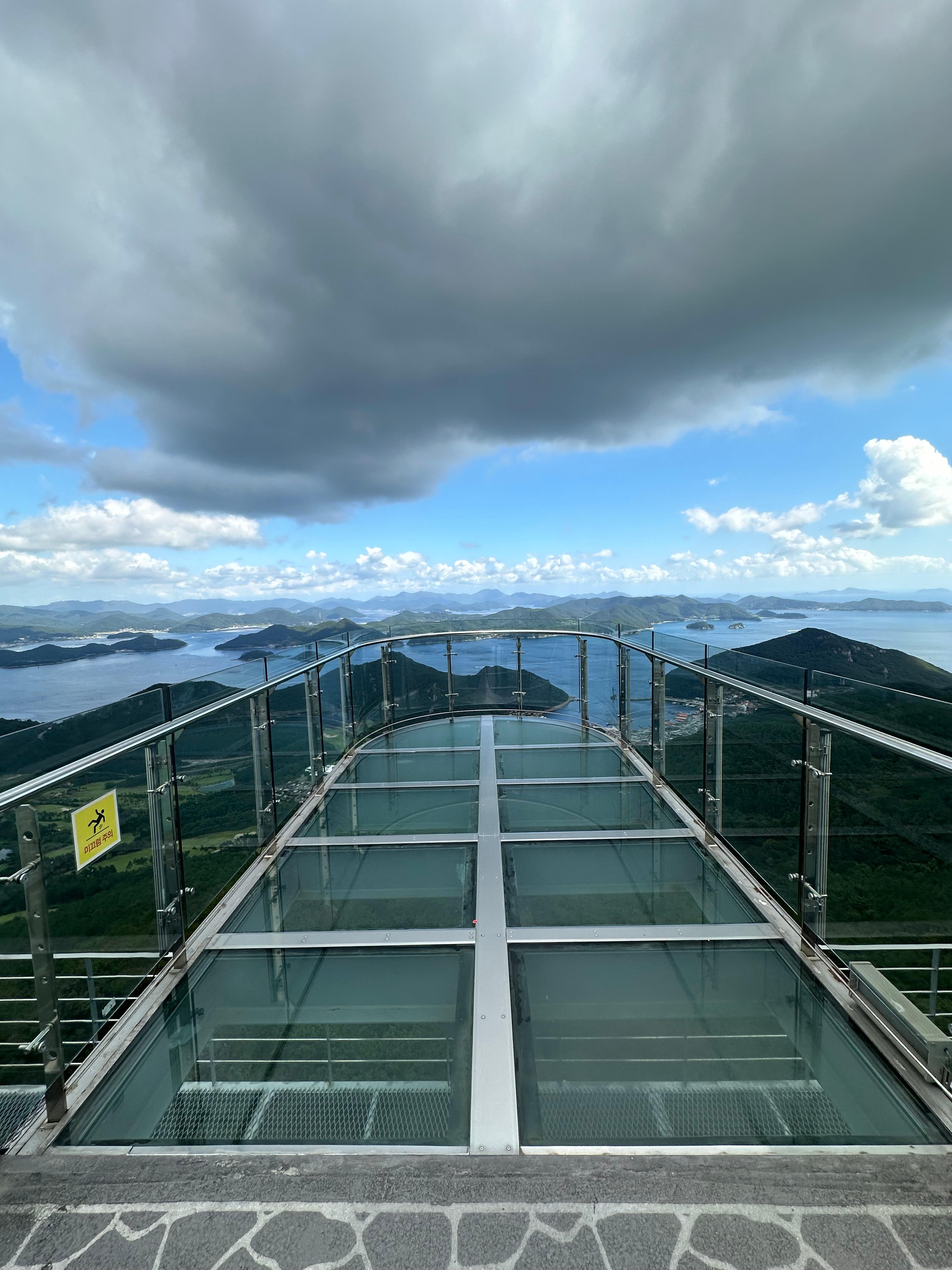 스카이워크는 이번이 처음이었던 것 같습니다. 원래 사람들이 상부정류장에 도착하면 바로 미륵산 정상방향으로 해서 폭포광장과 매점방향으로 가기 바빴는데 이번에는 대부분 사람들이 옥상으로 올라가는게 보이길래 올라가니까 전망대가 있었고 스카이워크가 있어서 그것도 사람들이 사진 찍기 바빴습니다. 스카이워크가 언제부터 있었는데는 모르지만 이렇게 전망대로 바로 올라와서 보니 통영이 있는 남해안 바다에 빽빽히 모여있는 섬들과 푸른 바다가 정말 아름답고 시원한 느낌이었습니다.