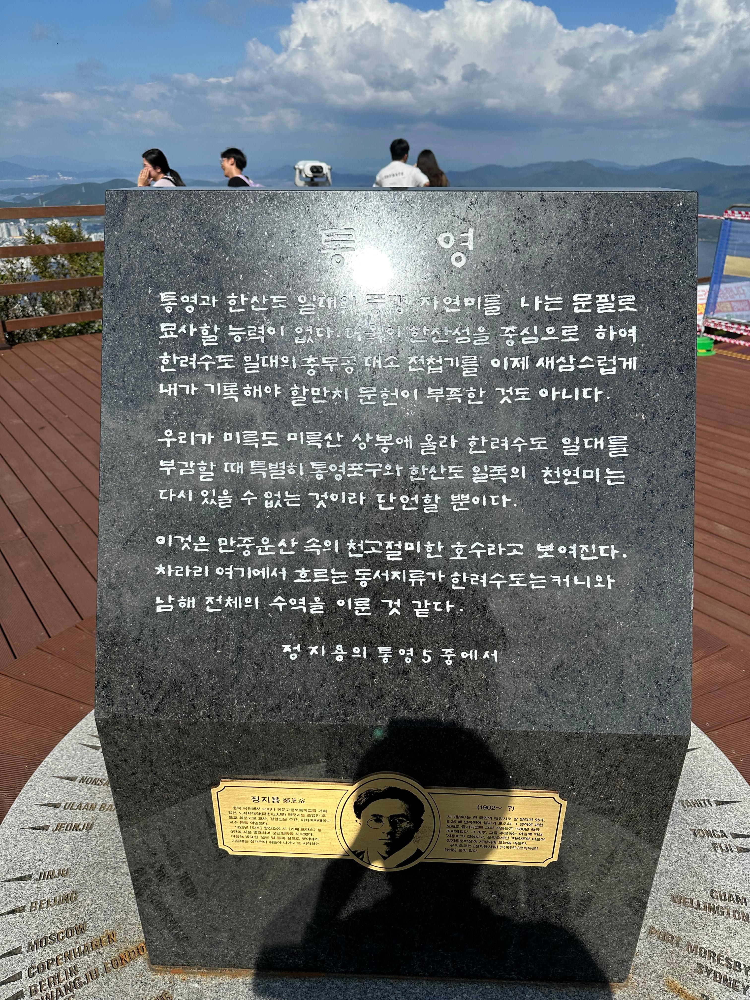 신선대 전망대 한가운데는 정지용이이라는 시인이 통영에 방문했을 때 통영 미륵산까지 돌아보고 통영1부에서 6부까지 기행문을 작성한거라고 합니다. 그리고 그 일부를 신선대 전망대 비석에 새겨놓은 것이라고 합니다. 저는 내일로 기차여행때부터 줄곧 미륵산을 자주 찾긴 합니다. 하지만 지루하지 않고 바다 사이에 통영의 작은섬과 통영시내를 바라보면 정말 멋있다는 생각만 들뿐입니다.
