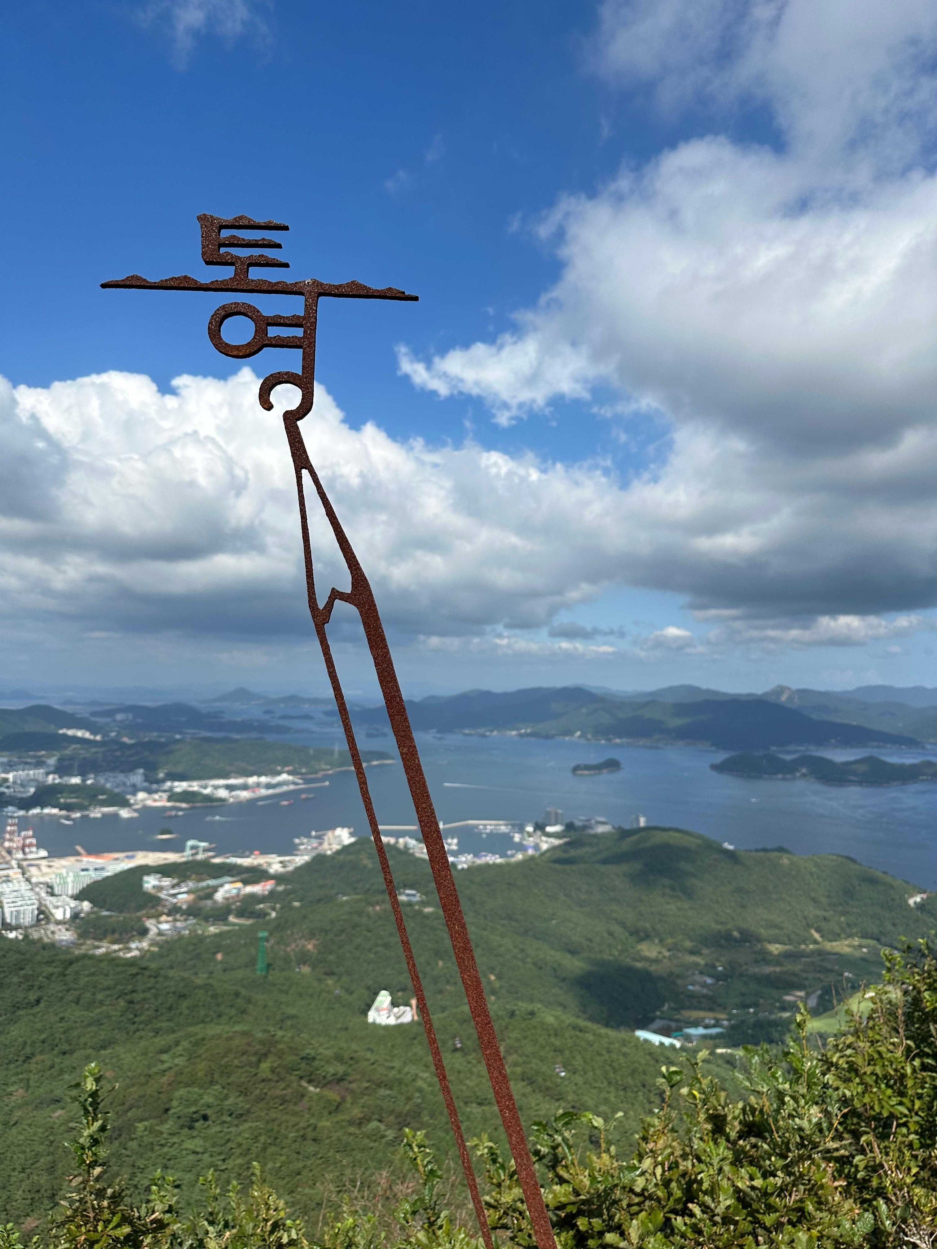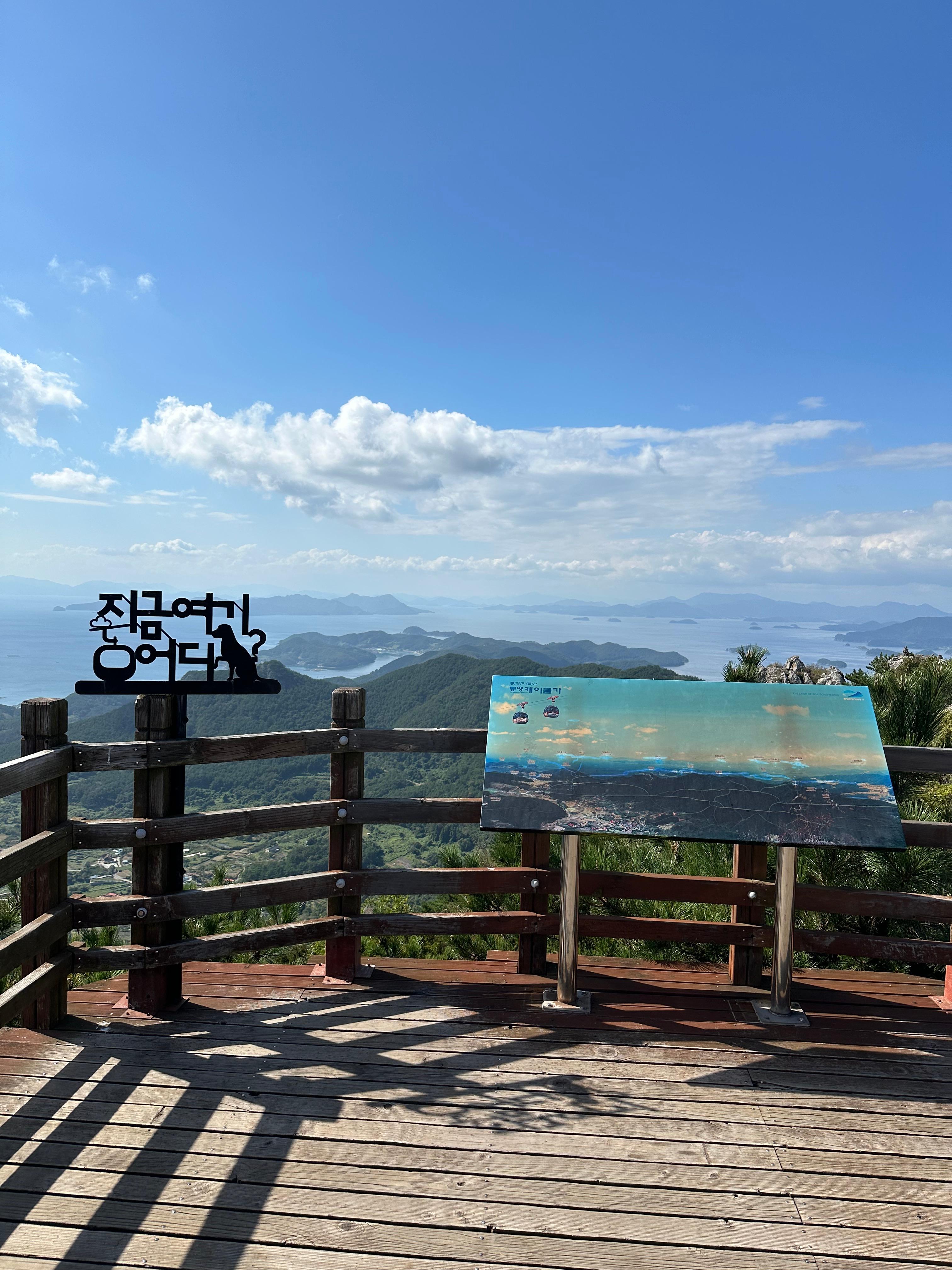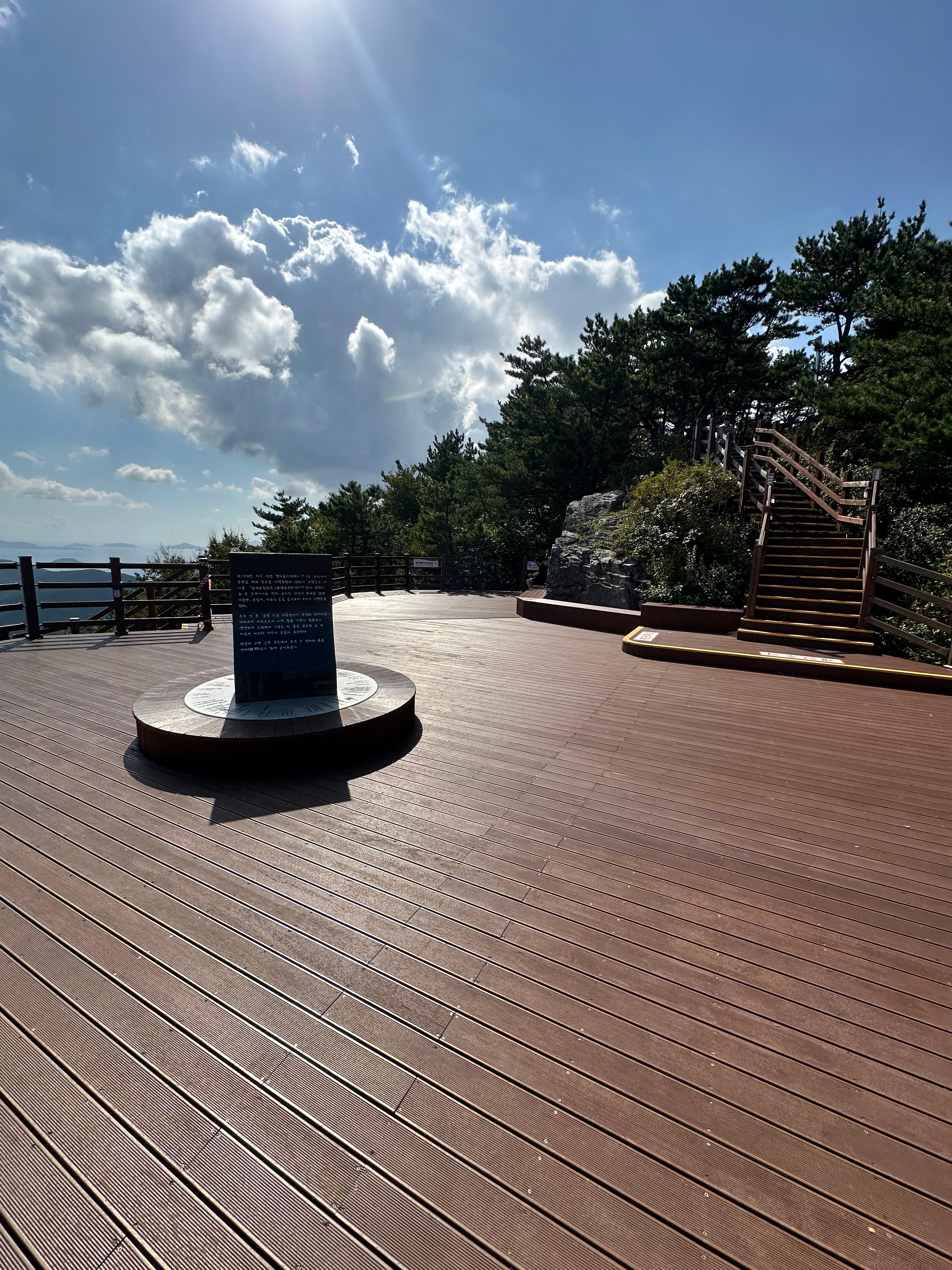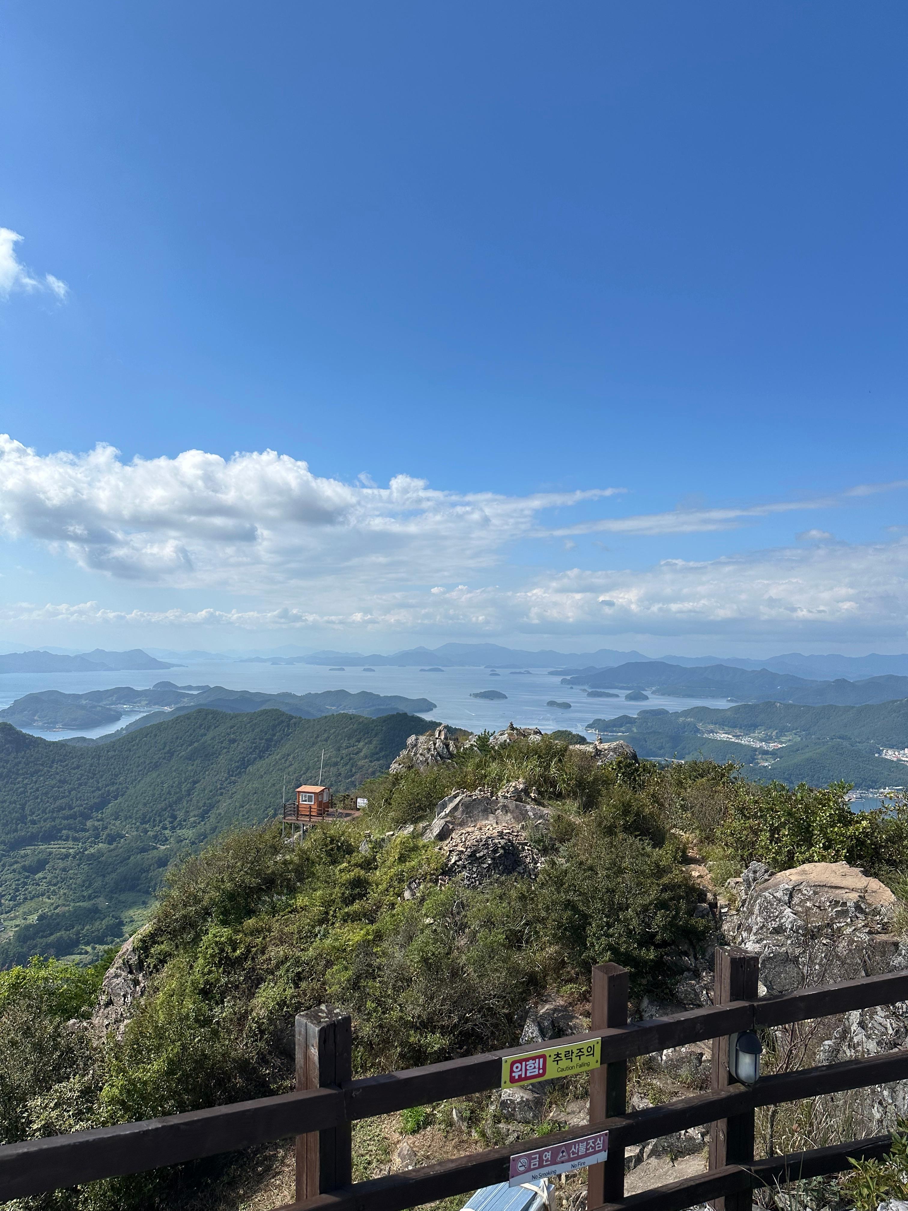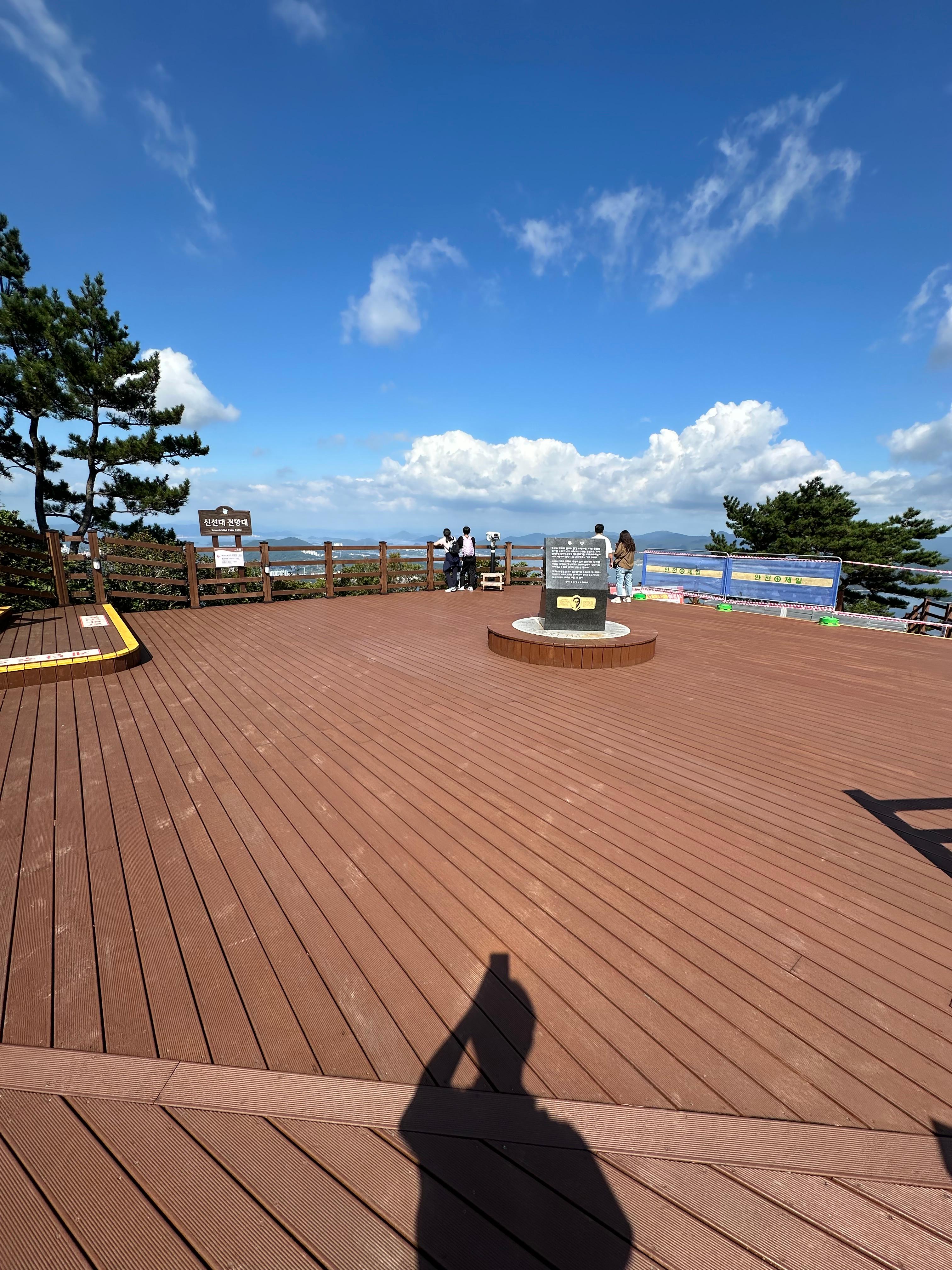 갈림길에서 신선대전망대와 한산대첩 전망대를 따라서 가장 먼저 신선대 전망대에 도착했습니다. 한산대첩전망대는 사실 갈수는 없었습니다. 신선대전망대 역시 주변 공사를 하는지 공사 자재가 주위에 있었습니다. 추석이 지난 본격적인 가을을 알리는 날씨라 그런지 구름도 멋있었습니다. 비록 완전 정상위는 아니더라도 바다와 작은 섬이 보이는 한가운데 통영 시내가 아름다웠습니다.