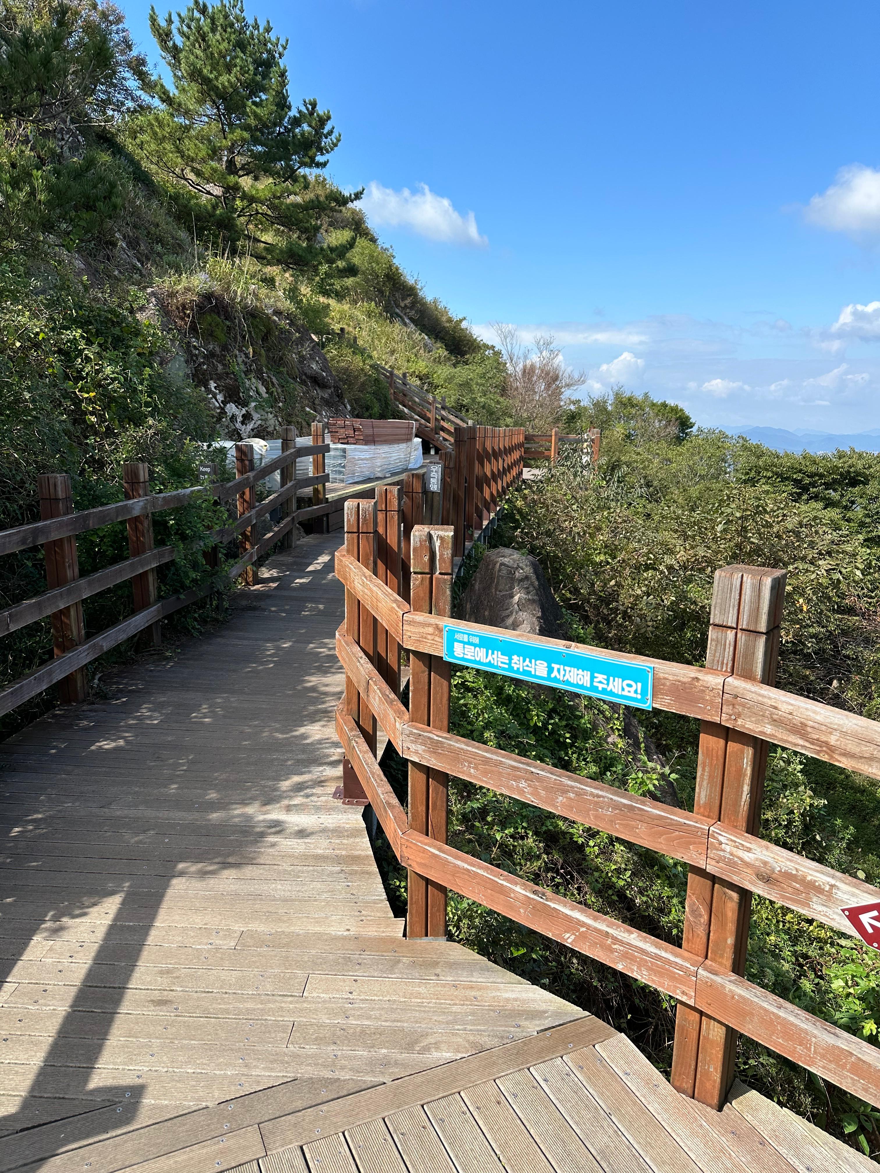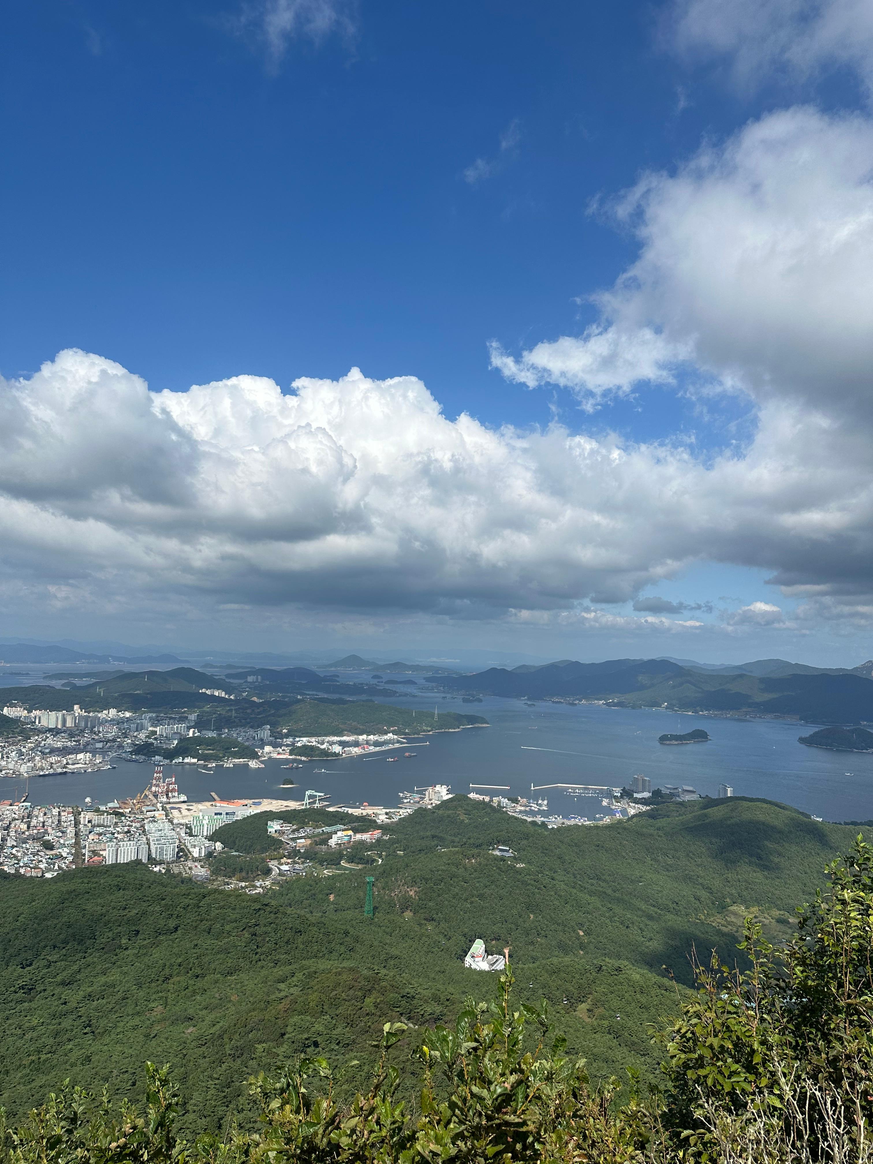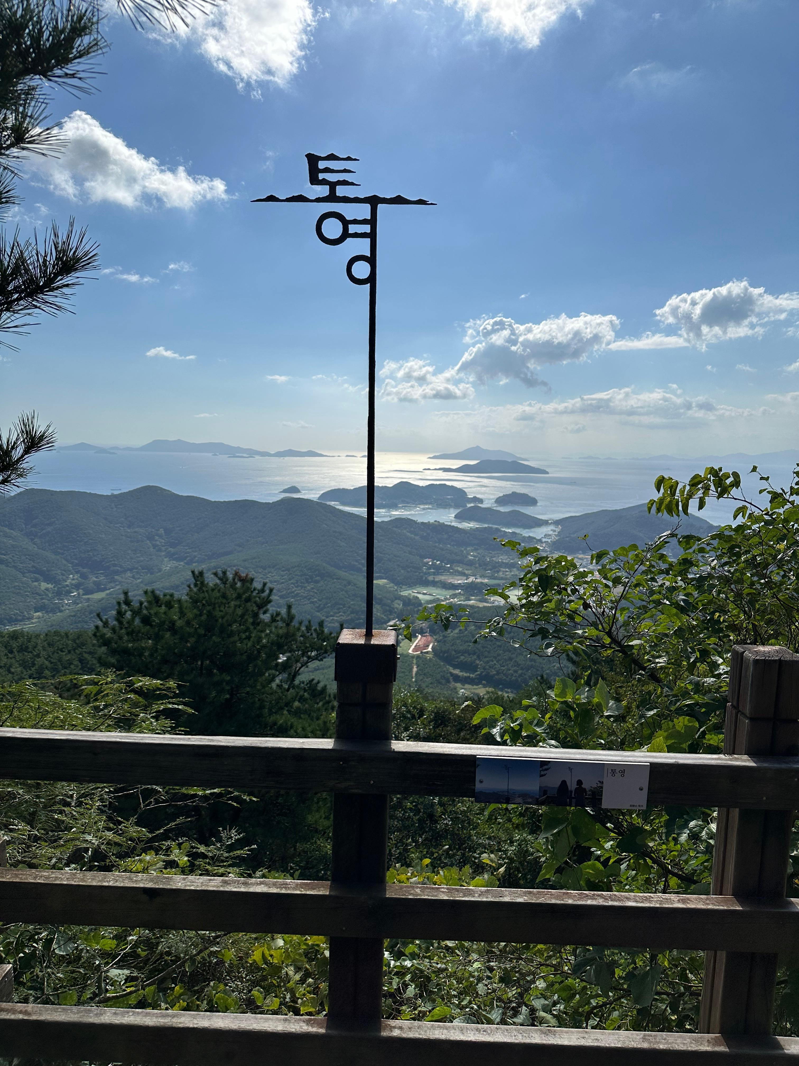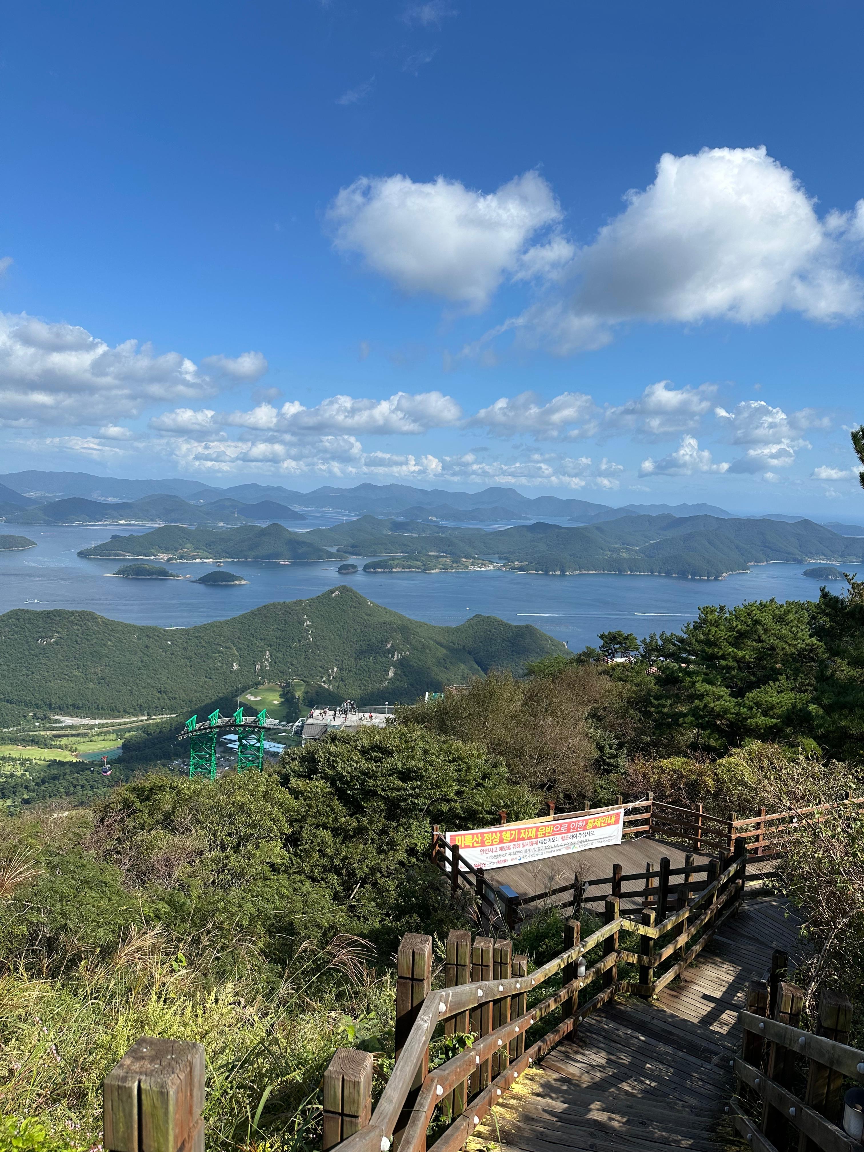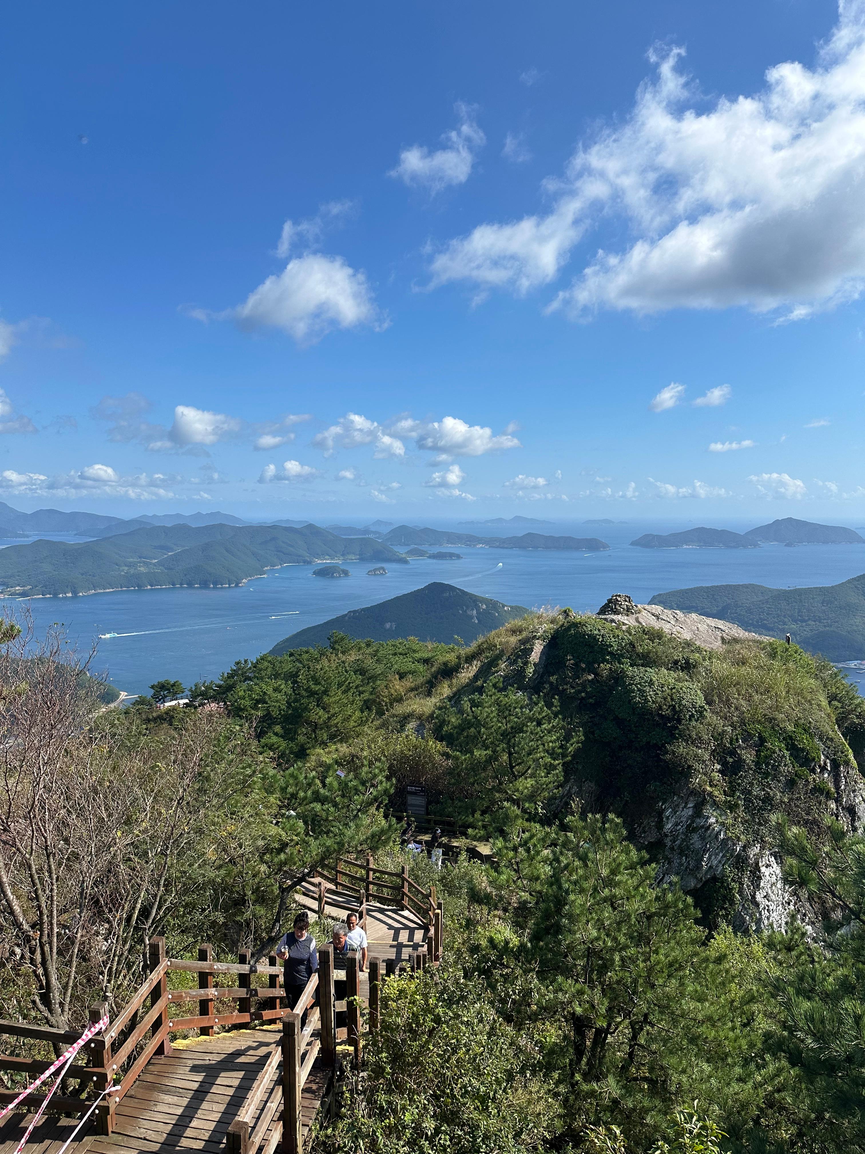 갈림길에서 신선대전망대와 한산대첩 전망대를 따라서 가장 먼저 신선대 전망대에 도착했습니다. 한산대첩전망대는 사실 갈수는 없었습니다. 신선대전망대 역시 주변 공사를 하는지 공사 자재가 주위에 있었습니다. 추석이 지난 본격적인 가을을 알리는 날씨라 그런지 구름도 멋있었습니다. 비록 완전 정상위는 아니더라도 바다와 작은 섬이 보이는 한가운데 통영 시내가 아름다웠습니다.