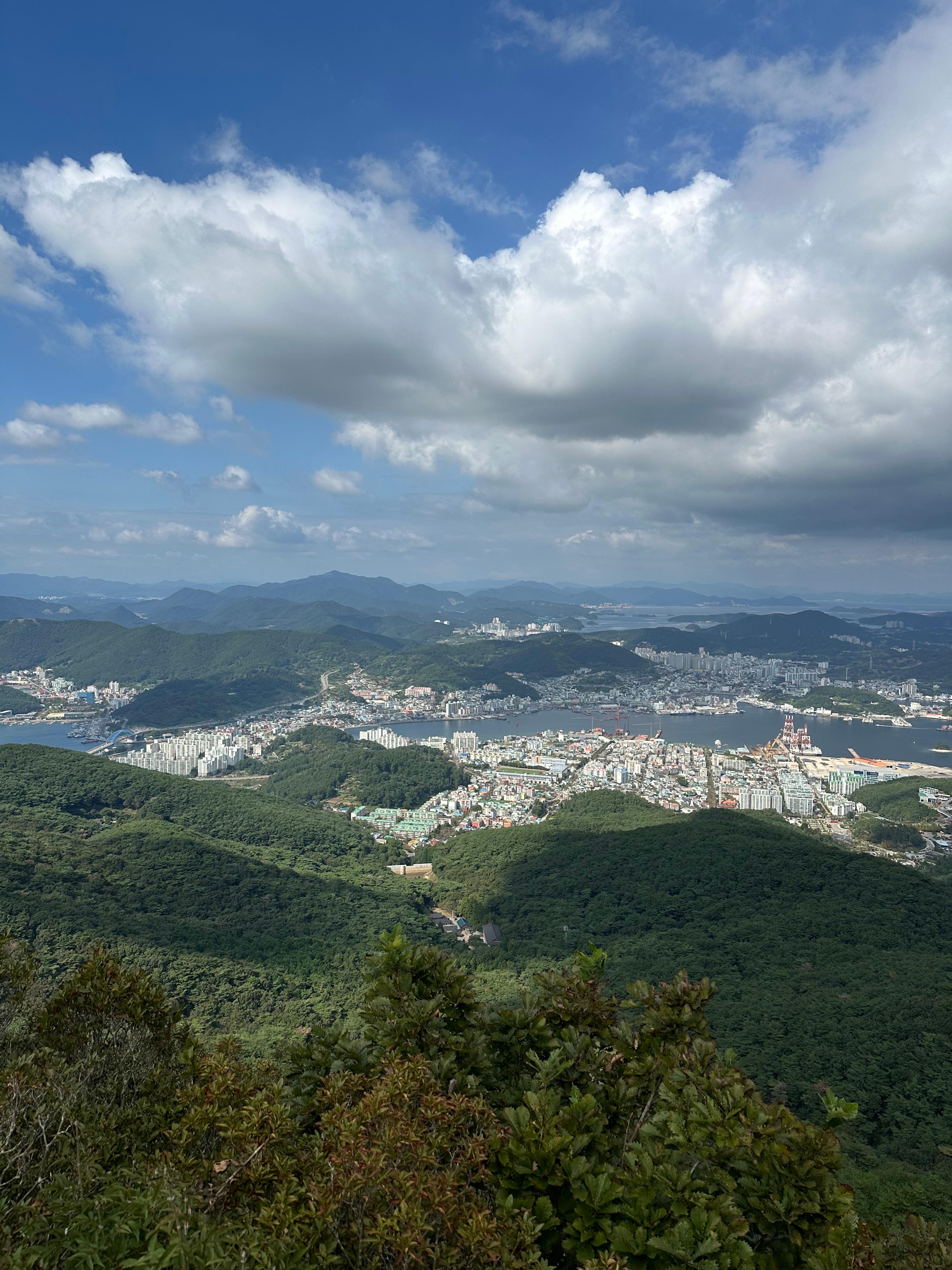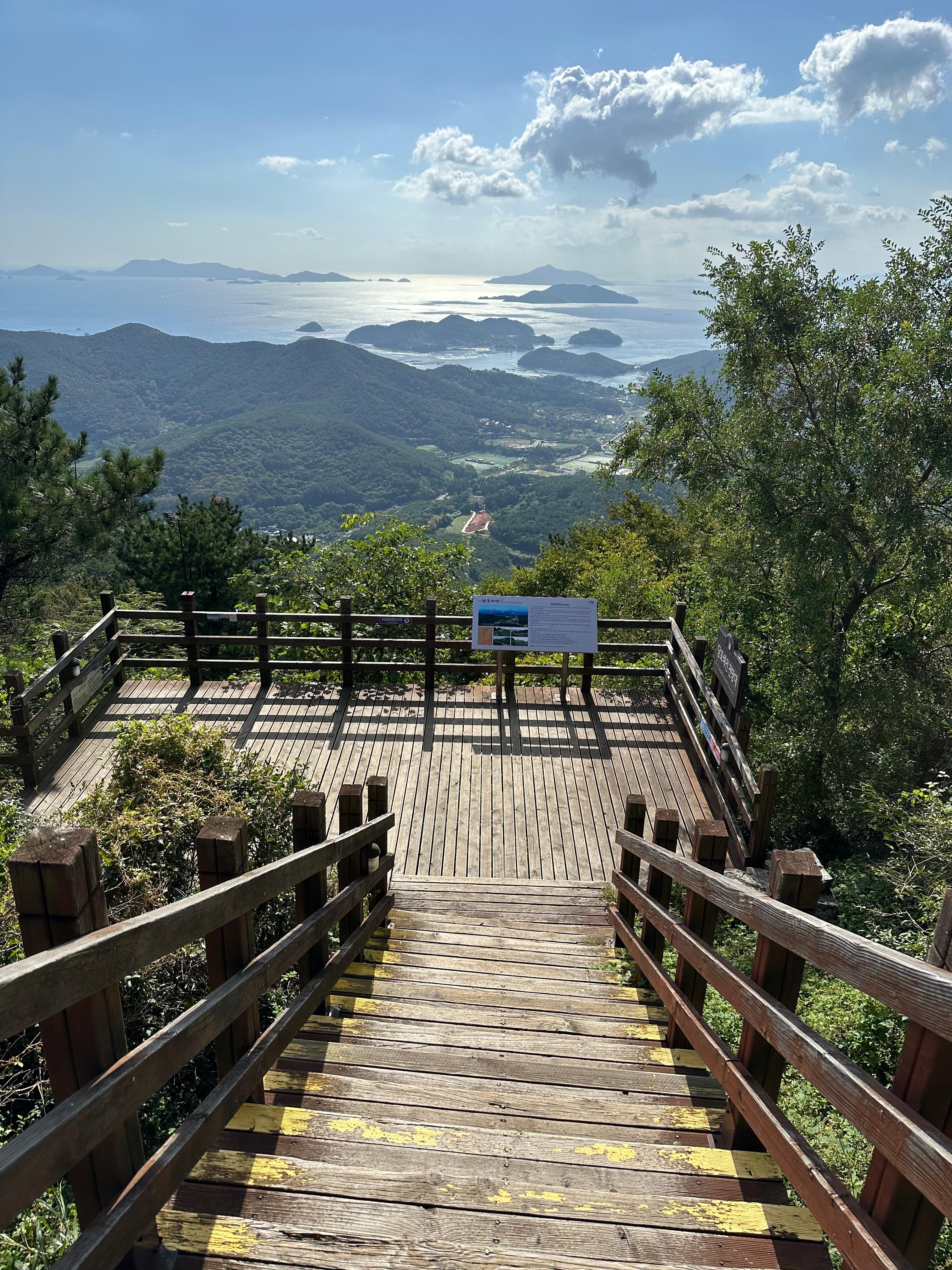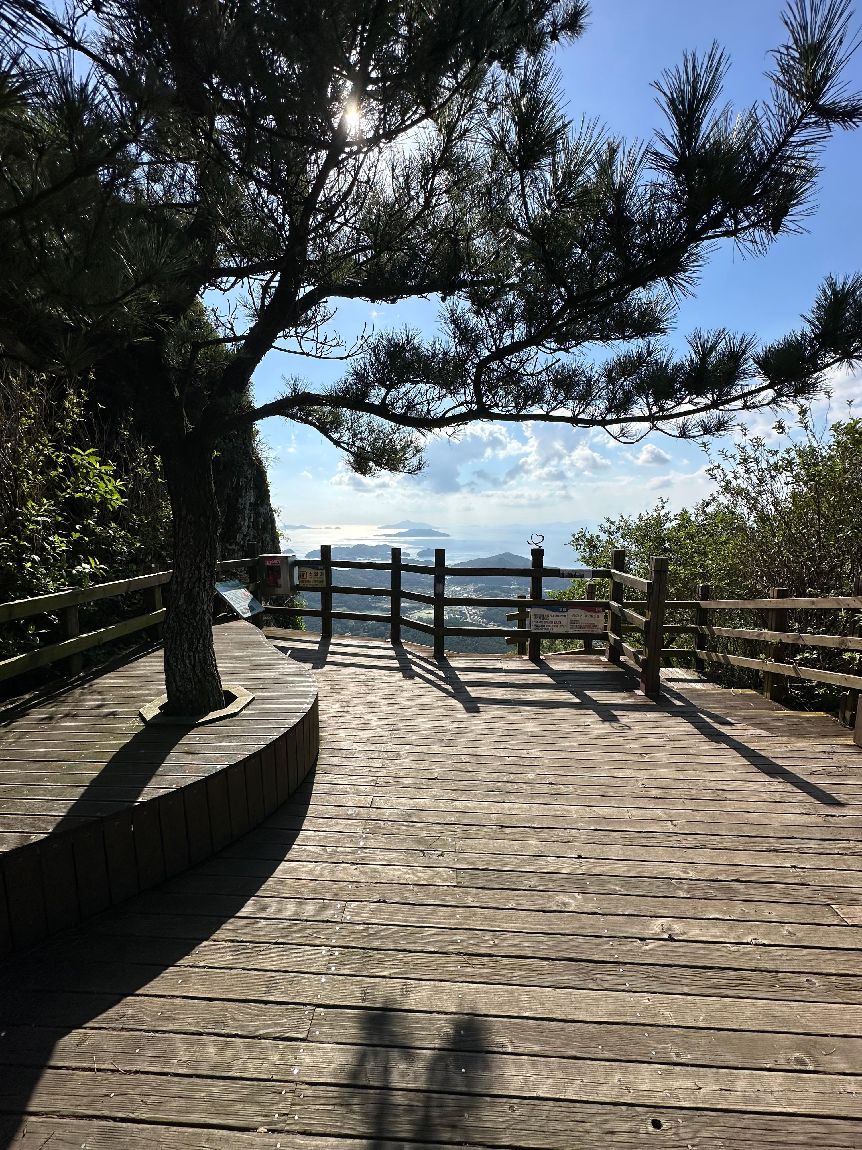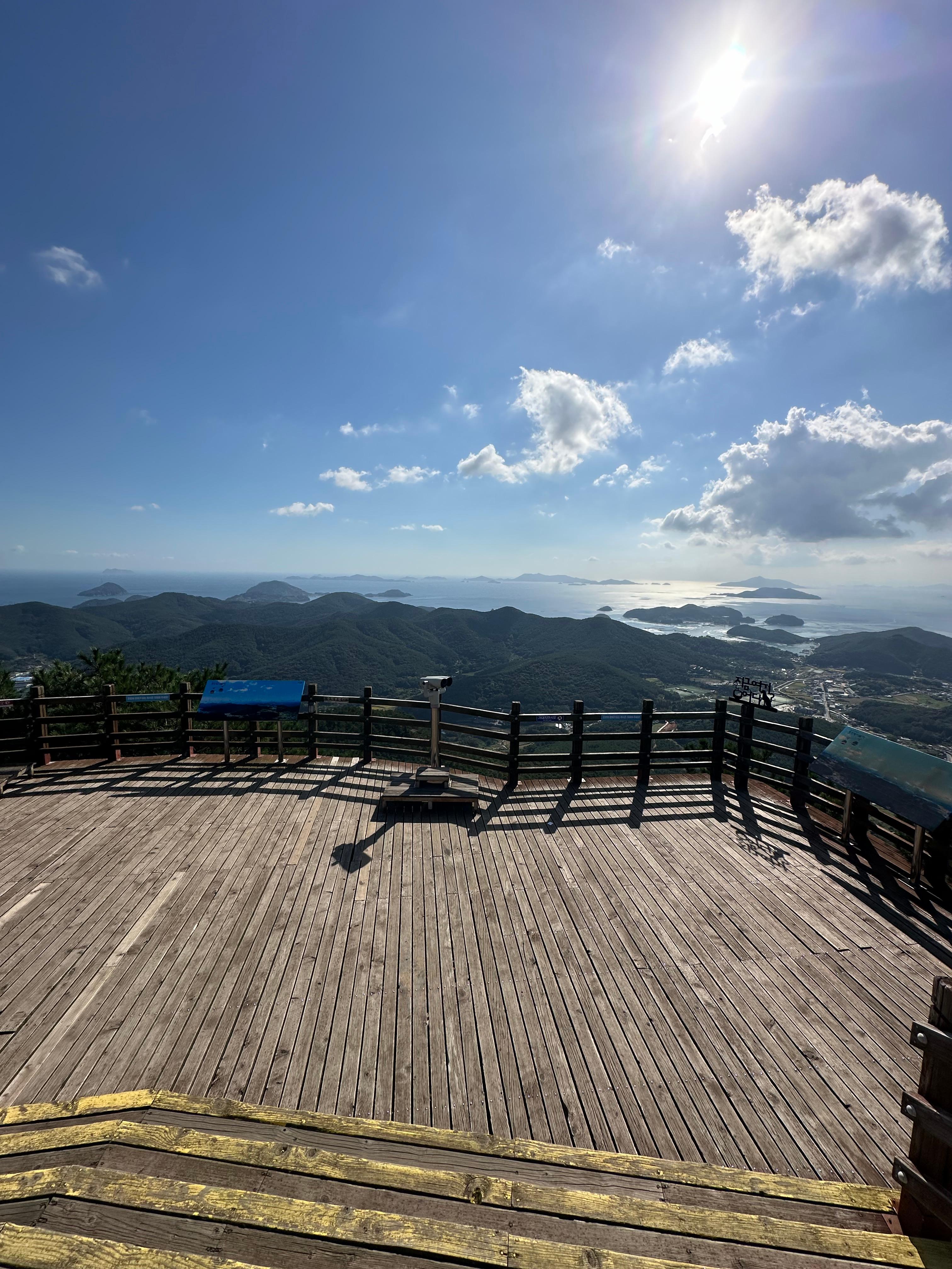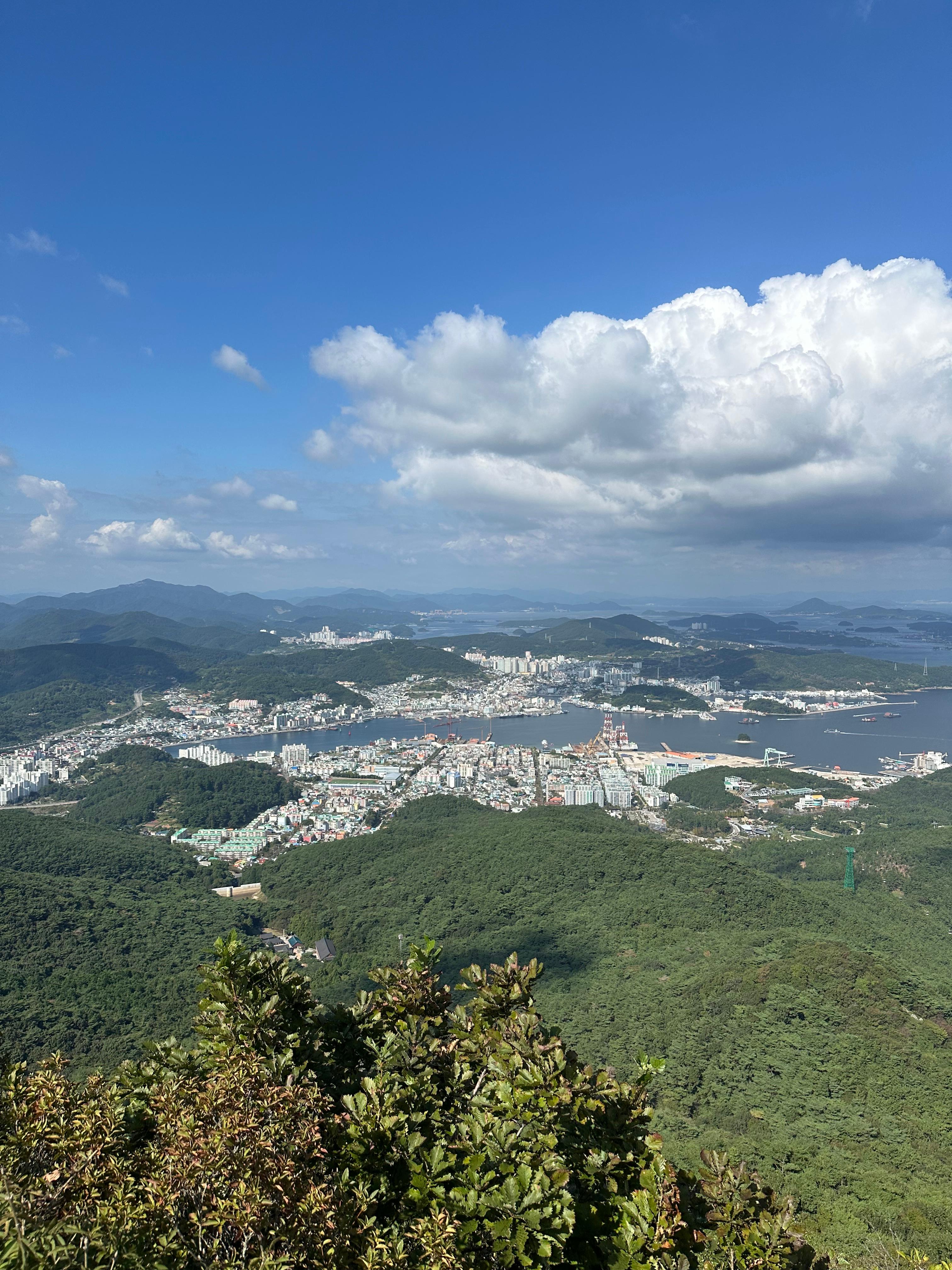 갈림길에서 신선대전망대와 한산대첩 전망대를 따라서 가장 먼저 신선대 전망대에 도착했습니다. 한산대첩전망대는 사실 갈수는 없었습니다. 신선대전망대 역시 주변 공사를 하는지 공사 자재가 주위에 있었습니다. 추석이 지난 본격적인 가을을 알리는 날씨라 그런지 구름도 멋있었습니다. 비록 완전 정상위는 아니더라도 바다와 작은 섬이 보이는 한가운데 통영 시내가 아름다웠습니다.