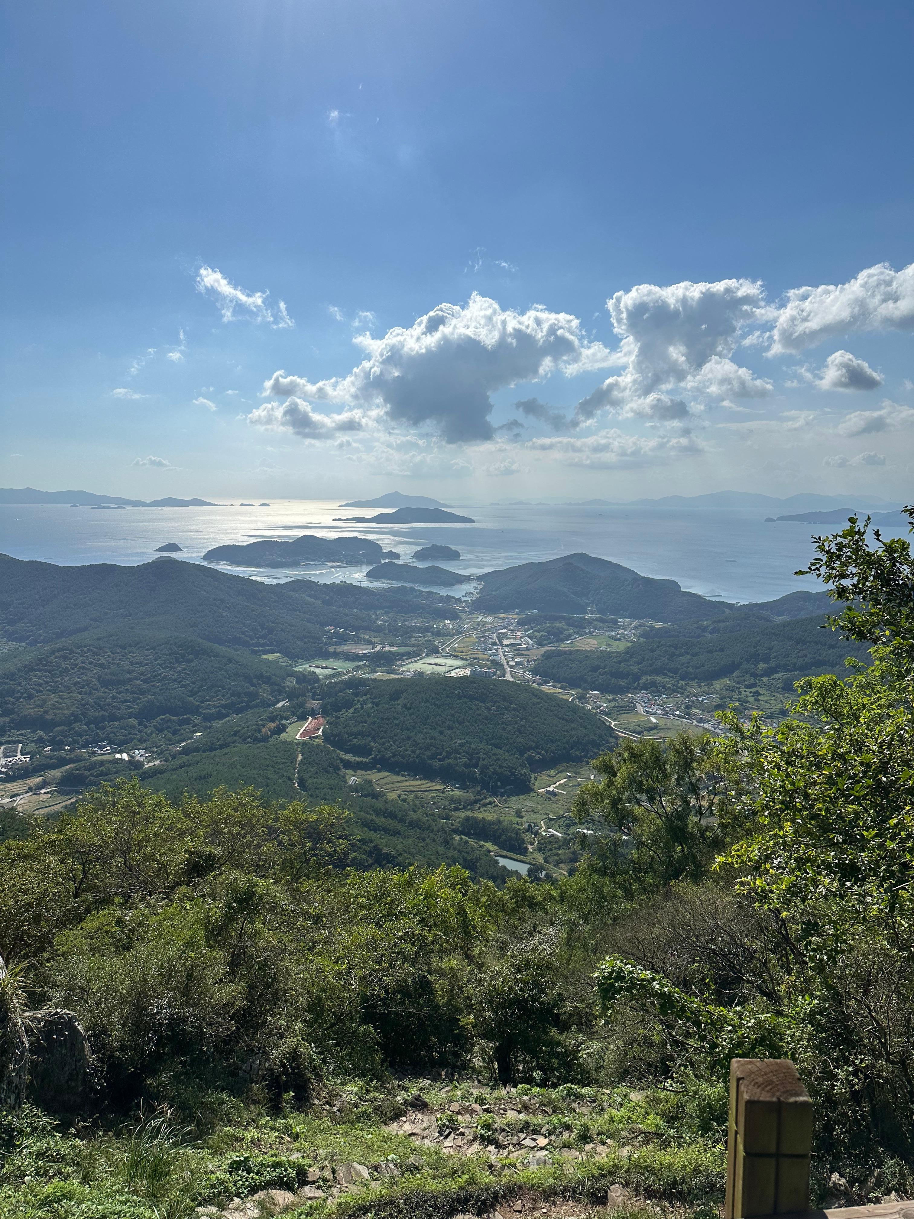 제가 올라온 계단 아래 내려보았습니다. 미륵산까지 올라오는 과정은 힘듭니다. 하지만 올라오고나서는 이렇게 아름다운 통영 바다와 통영의 작은 산들이 보이는데 정말 멋졌습니다. 그만큼 인생 역시 높은 곳까지 오르는 과정은 힘들지만 열심히 살면 그만큼 편해지는 것 같습니다. 또한 낮은 위치에서 기초부터 차곡차곡 쌓은 사람과 그렇지 못한 사람 역시 차이가 나게 됩니다. 처음 올라 왔을 때는 통영 시내 방향이 아니라 통영시내 반대방향이었는데요 통영의 작은 섬들과 시골 마을의 모습을 볼 수 있었습니다.