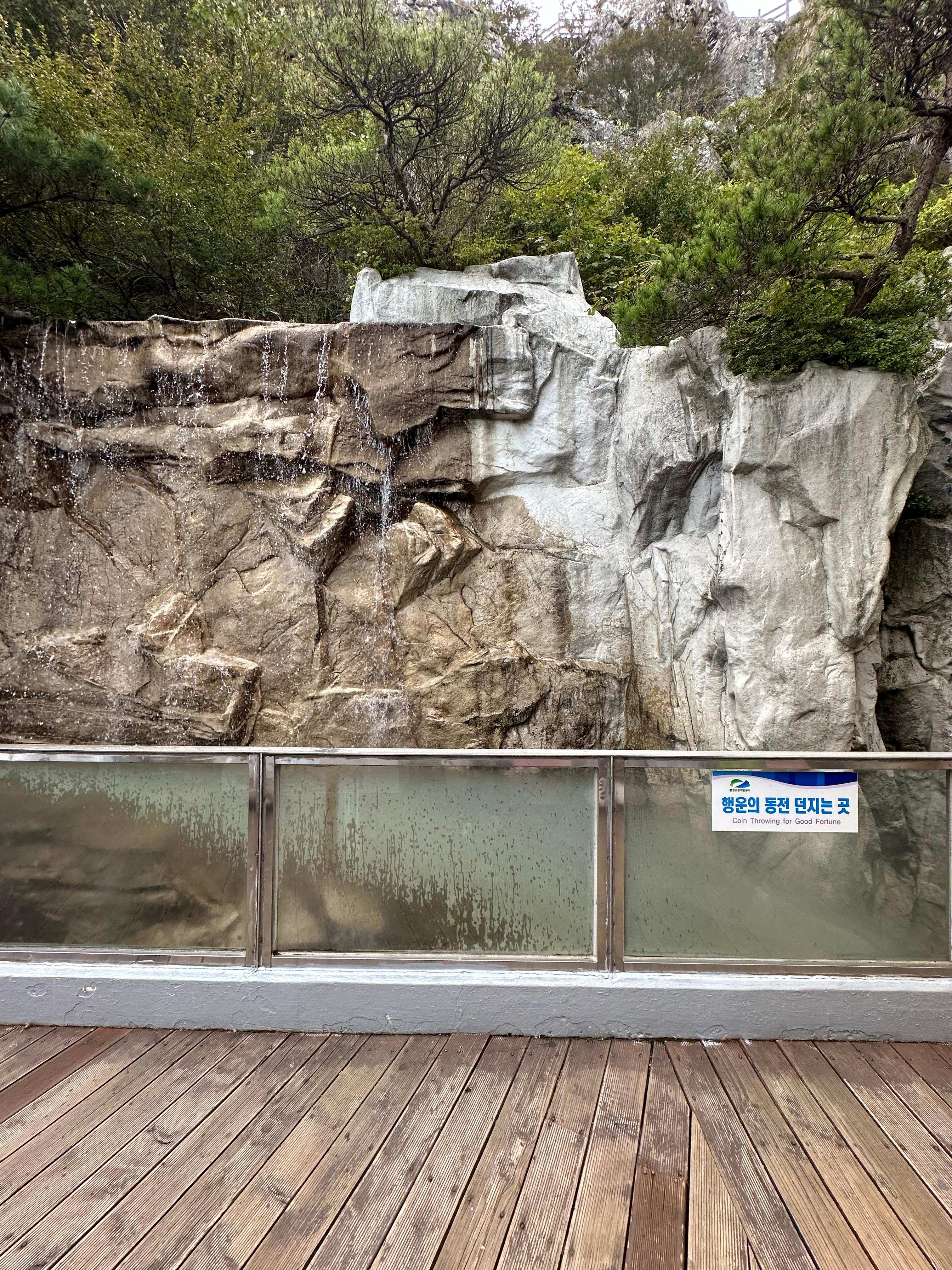 통영케이블카를 타고 하부정류장에서 상부정류장까지 10여분 정도 타고 올라오면 바로 앞에 행운의 동전 던지는 곳이라고 있습니다. 실제로 폭포수 처럼 보이는 계곡 아래로는 이곳 통영 케이블카를 타고 미륵산까지 오는 사람들의 흔적을 볼 수 있는데요. 수많은 동전들을 볼 수 있습니다. 아무래도 이렇게 많은 동전은 통영시와 통영케이블카나 불우이웃을 위해 사용되지 않을까 싶습니다.