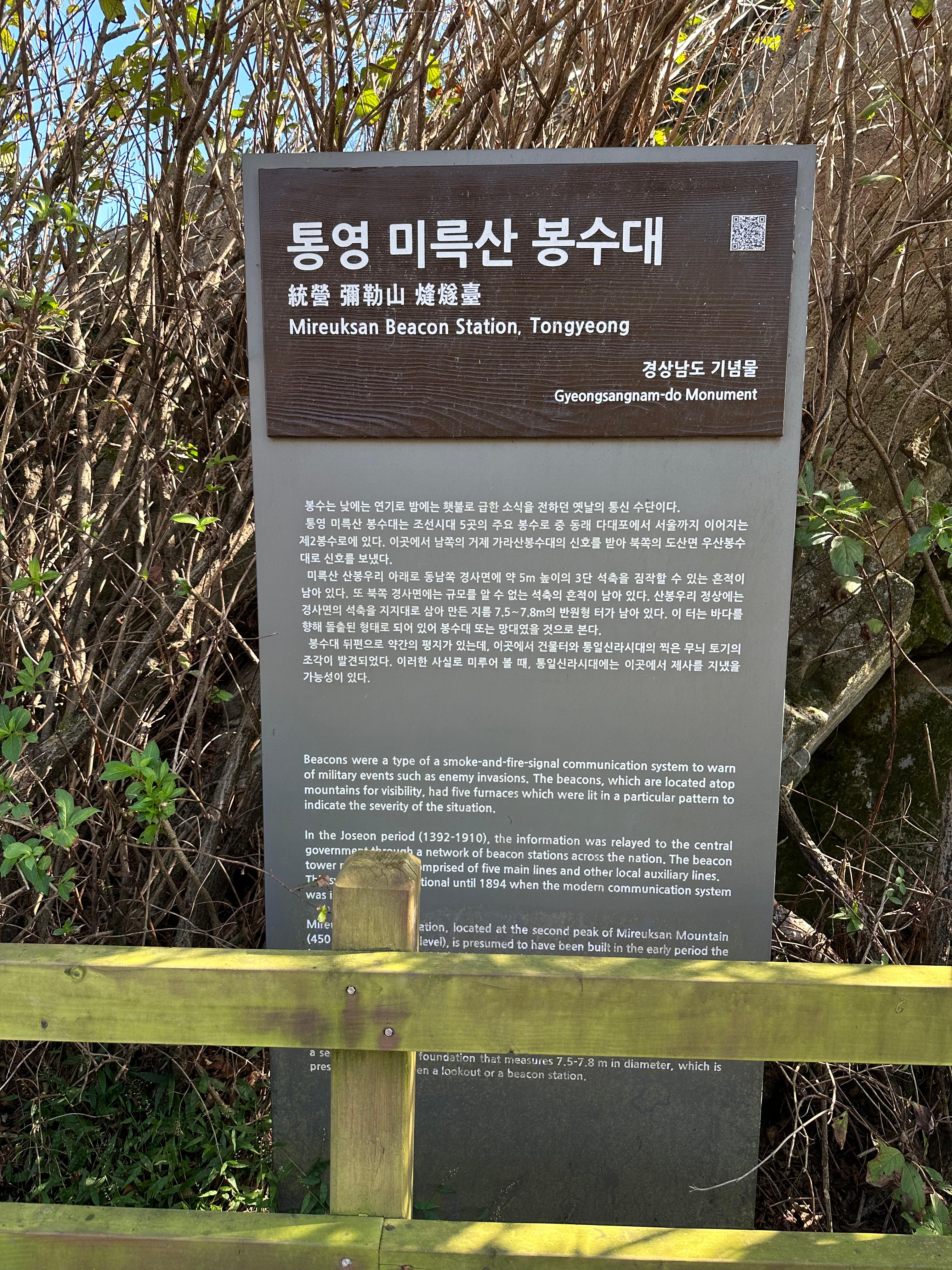 통영 시내 반대편 전망대는 1-2분 좀 더 올라가면 미륵산 정상에서 볼 수 있습니다. 봉수는 낮에는 연기로 밤에는 횃불로 급한 소식을 전하던 옛날의 통신 수단이라고 합니다. 지금처럼 인터넷과 전화가 없던 조선시대에서도 지금으로써는 불편한 수단입니다. 하지만 통영 미륵산 봉수대는 조선시대 5곳의 주요 봉수로 중 동래 다대포에서 서울까지 이어지는 제2봉수로에 있다고 합니다. 이곳에서 남쪽의 거제, 가라산봉수대의 신호를 받아 북쪽의 도산면 우산봉수대로 신호를 보냈다고 해요.