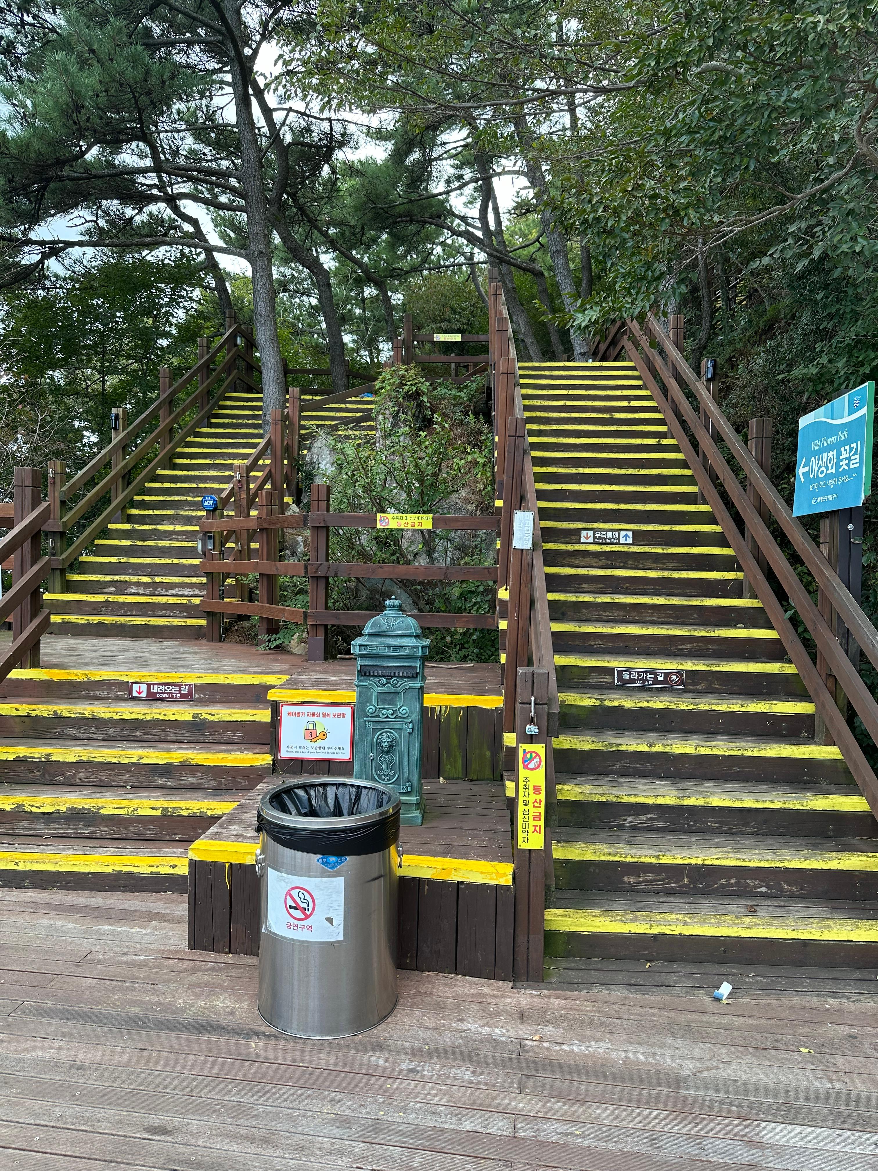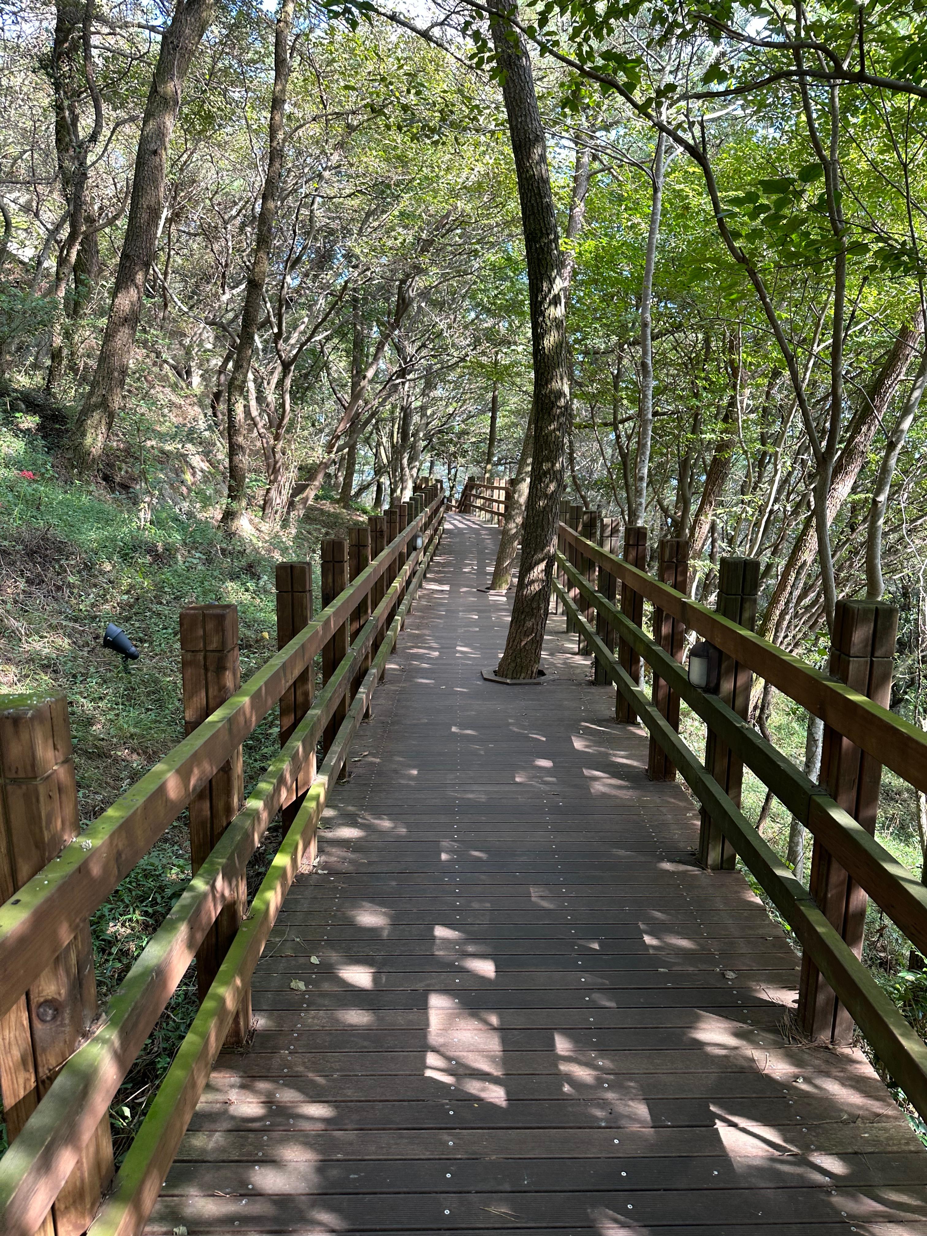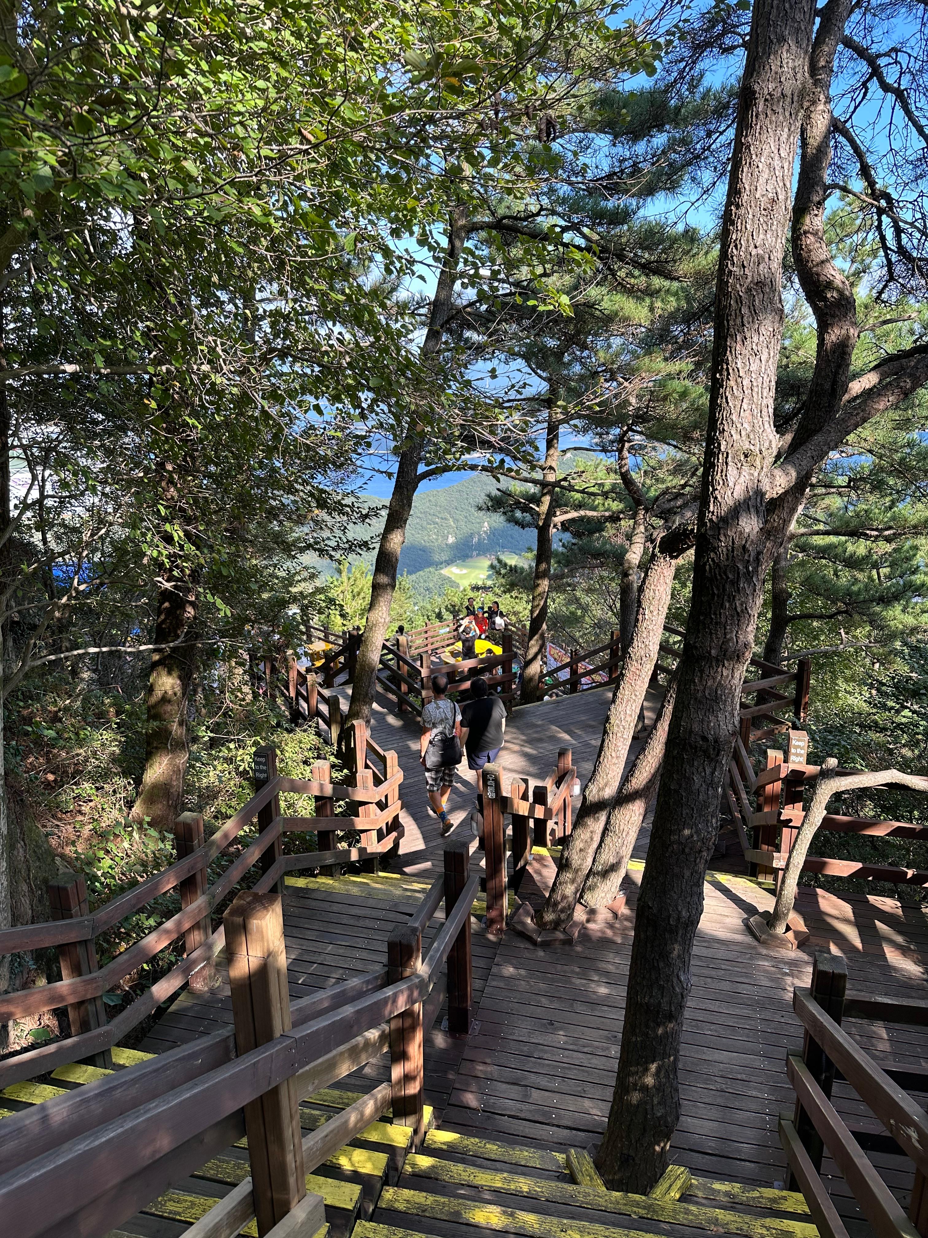 내려가는길은 올라가는 길에 비해 더 빨리 케이블카 상부정류장까지 빨리 도착할 수 있었습니다. 박경리묘소 전망쉼터와 당포해전 전망대를 지나니까 처음 보았던 숲길 계단을 다시 마주하게되었습니다. 1년에 한두번은 꼭 찾는 통영이지만 여전히 하부 승강장으로 내려가기 싫었습니다. 추석이 지난 가을에 도입하는 계절이라 선선했습니다. 숲길 사이에서 가만히 서서 자연을 그대로 보고 느끼는데 너무 좋았습니다.