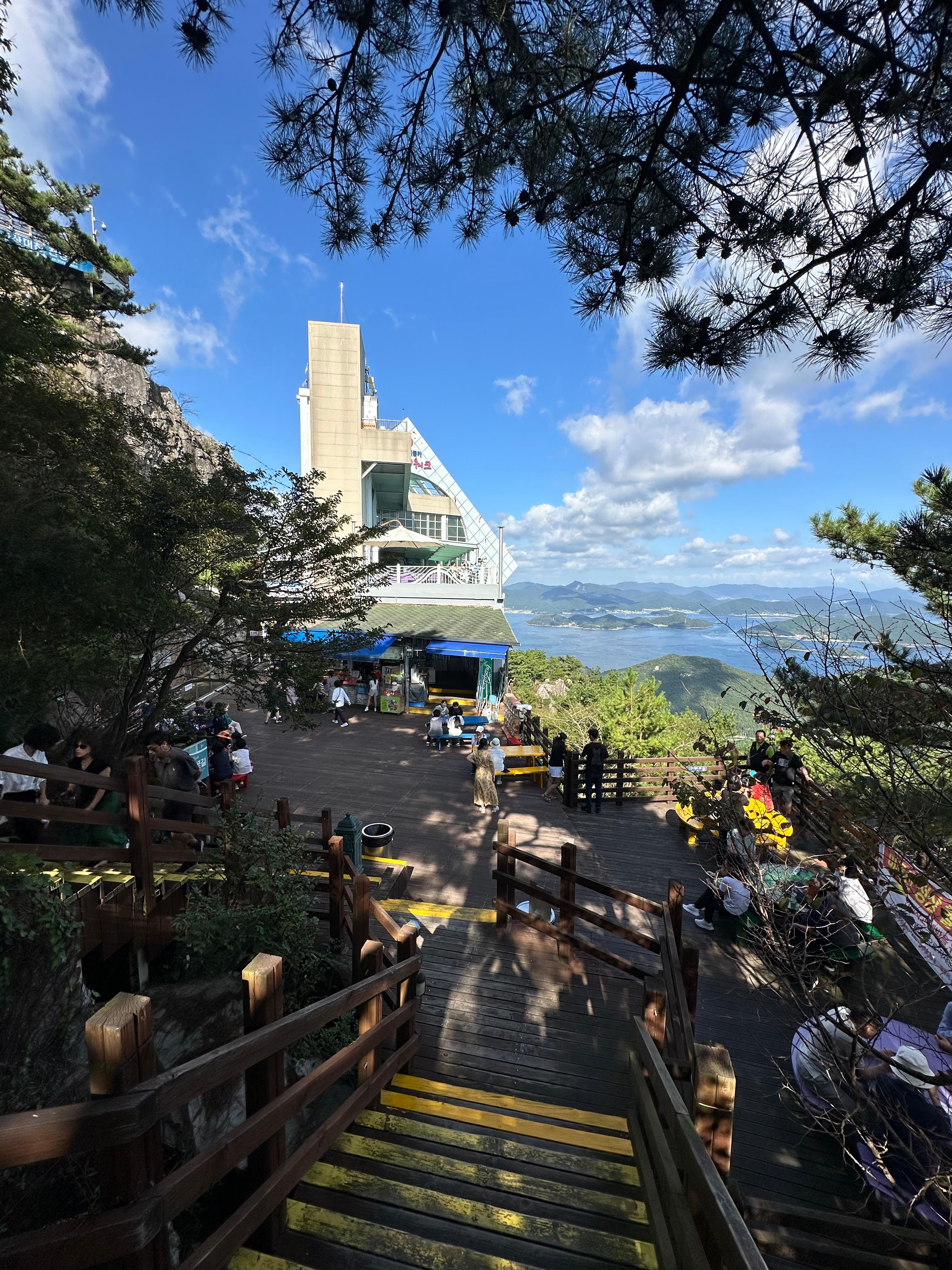 당포해전 지나서 10분정도 여유롭게 걷고 쉬며 내려오니 아쉽지만 미륵산에서의 여정이 다 끝나고 하부승강장으로 내려가기 위한 일만 남았습니다. 통영케이블카 상부정류장 건물 뒤편으로 아름다운 남해안 통영 바다와 작은 섬들의 모습이 너무 인상적이었습니다. 그리고 통영 케이블카 상부정류장이 있는 바로 앞 광장에서는 후아유 촬영 장소 였는데요.
