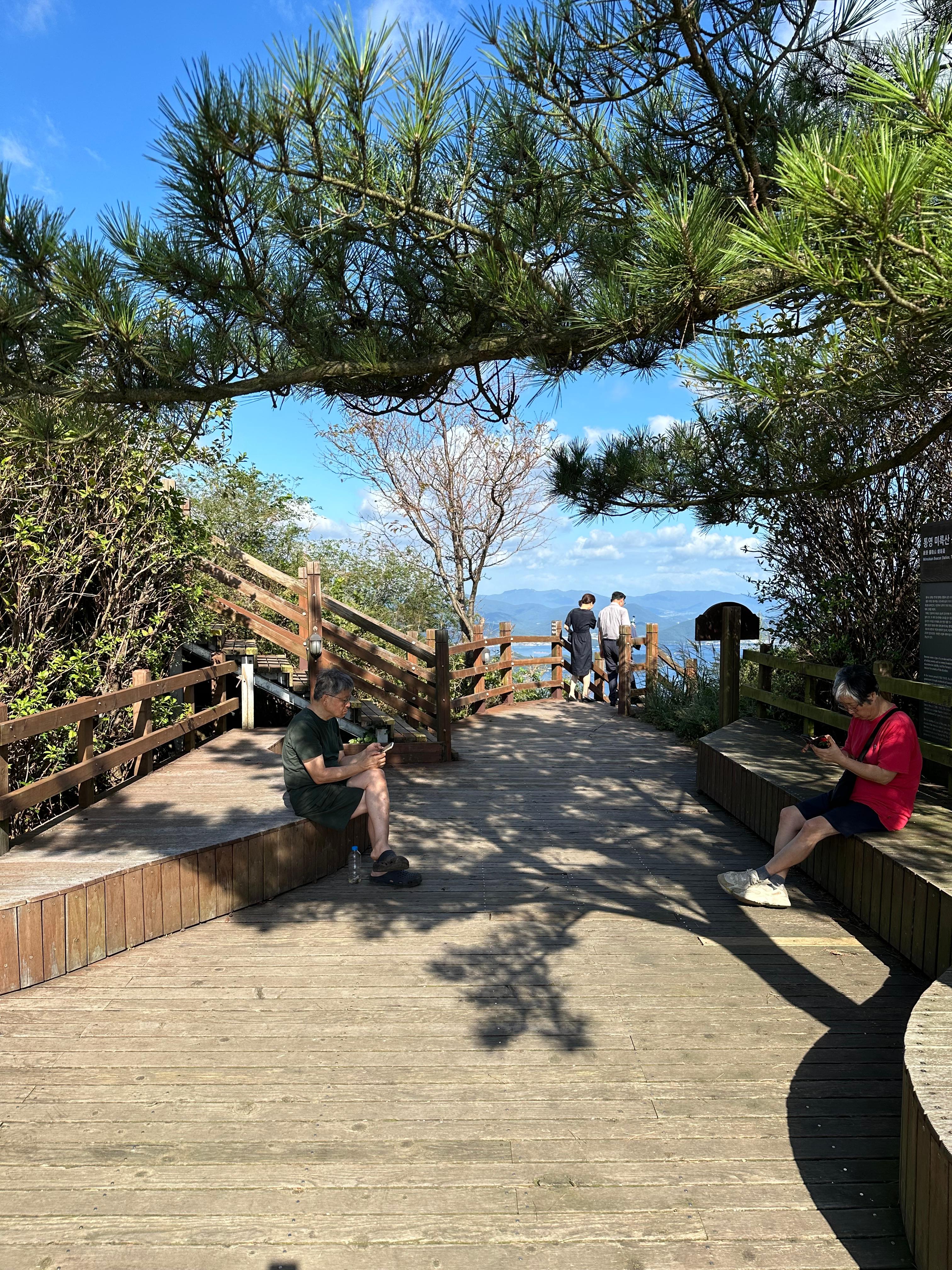 미륵산 정상 위에서 시원한 바람과 선선함을 뒤로 한채 올라왔던 길을 따라 천천히 내려갑니다. 하산할 때는 올라왔던 길 반대로 내려갔는데요. 소설 작가 박경리 묘소 전망쉼터를 따라내려갔습니다. 박경리묘소는 아마 미륵산 아래 어디에 있을 것입니다. 박경리 묘소 전망쉽터라고 해서 통영 시내 반대방향으로 통영의 섬과 조용한 시골마을이 보이는 전망대였습니다.