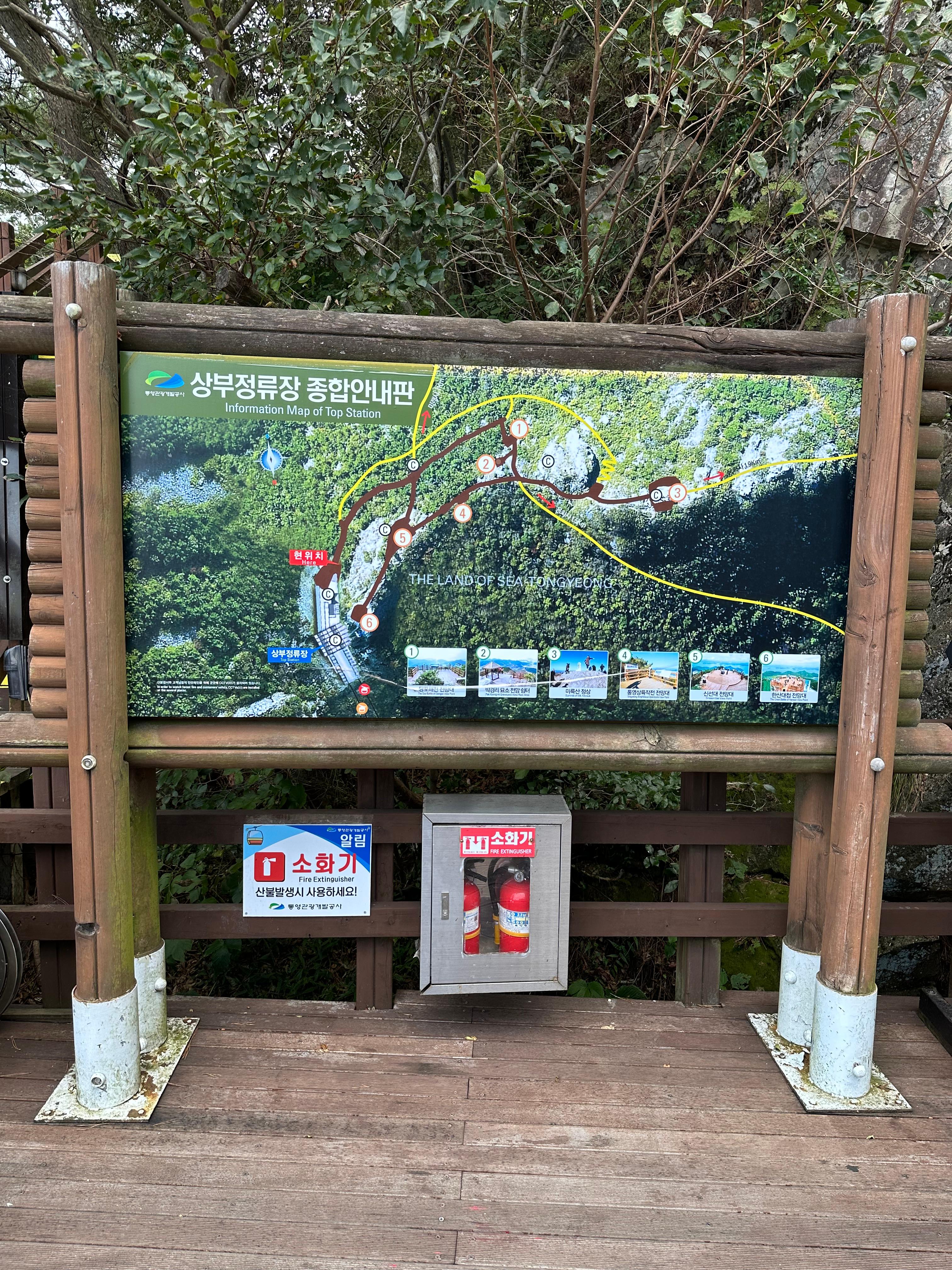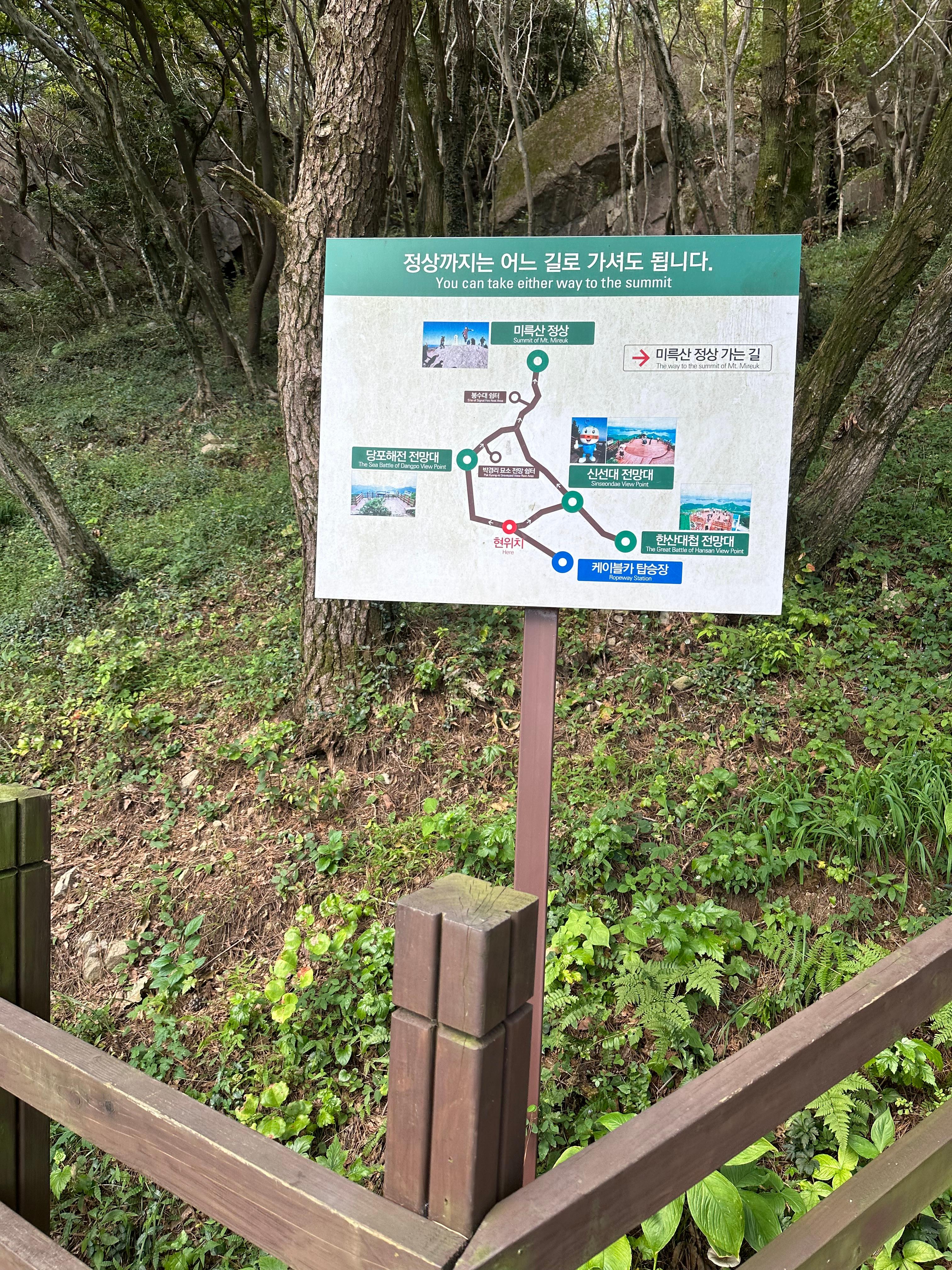 케이블카 탑승장에서 내려서 계단을 따라 조금 올라가다보면 정상으로 가는 안내판을 볼 수 있습니다. 등산을 하다보면 어느길로 가면 좀 더 빠른길인지 일종의 지름길 안내를 종종 볼 수 있습니다 미륵산 정상으로 올라가는 길에도 지름길 안내를 볼 수 있습니다. 하지만 미륵산의 경우에는 어느 길로 가나 큰 차이는 없었습니다. 저는 미륵산 정상으로 올라갈 때는 신선대 전망대와 한산대첩 전망대로 해서 전망대로 올라갔습니다. 그리고 하산할때는 반대쪽 박경리 묘소 전망대 쉼터를 따라 당포해전 전망대를 따라 케이블카 탑승장으로 내려왔습니다.