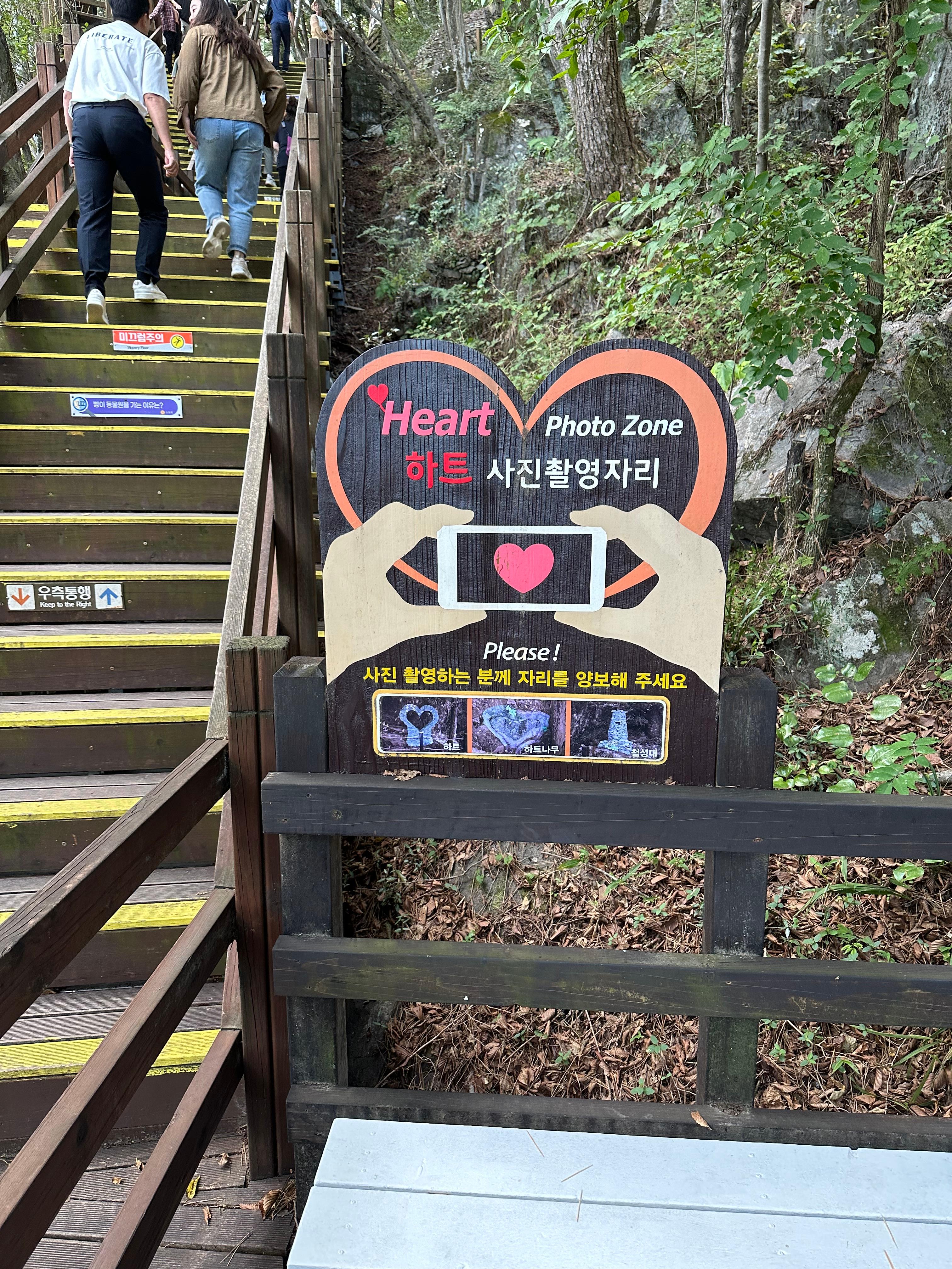 계단을 따라 걷다보면 볼거리도 심심찮게 보였습니다. 그중에서 돌로 쌓은 첨성대와 하트 모양으로 만든 하트 돌탑과 하트나무를 볼 수 있습니다. 어렸을적 아버지와 함께 등산을 가면 우리나라의 풍속이라고 할까요 예로부터 산에 오르면서 돌맹이 하나씩 올리면서 소원을 빌었습니다. 그것이 떠오르긴 했습니다.