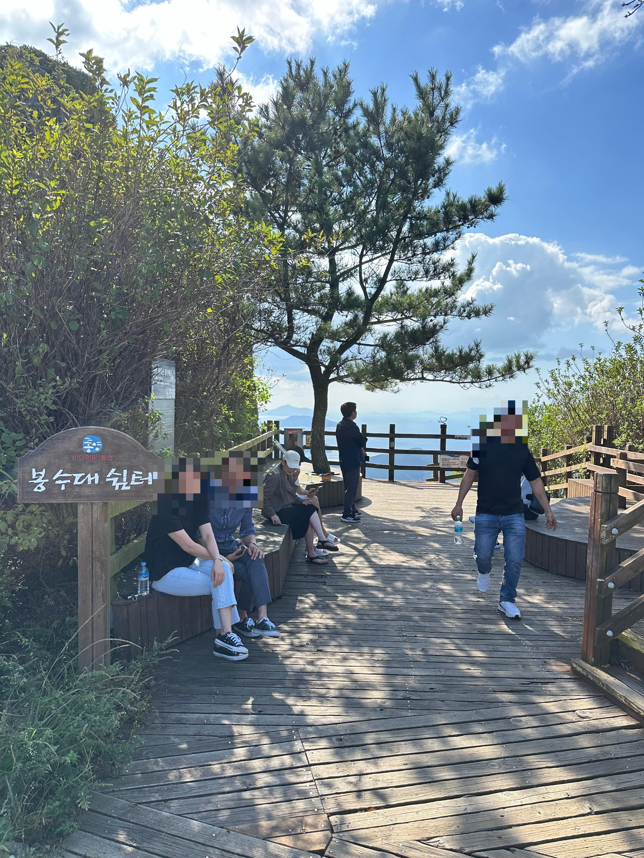 미륵산 정상으로 올라가는 마지막 쉼터이자 작은 전망대라고 볼 수 있는 봉수대 쉼터입니다. 전망대라는 느낌이 애매한데요. 통영시내쪽이 아니라 통영 시내 반대 방향으로 도시의 모습보다 시골의 모습을 바라볼 수 있는 작은 전망대입니다.