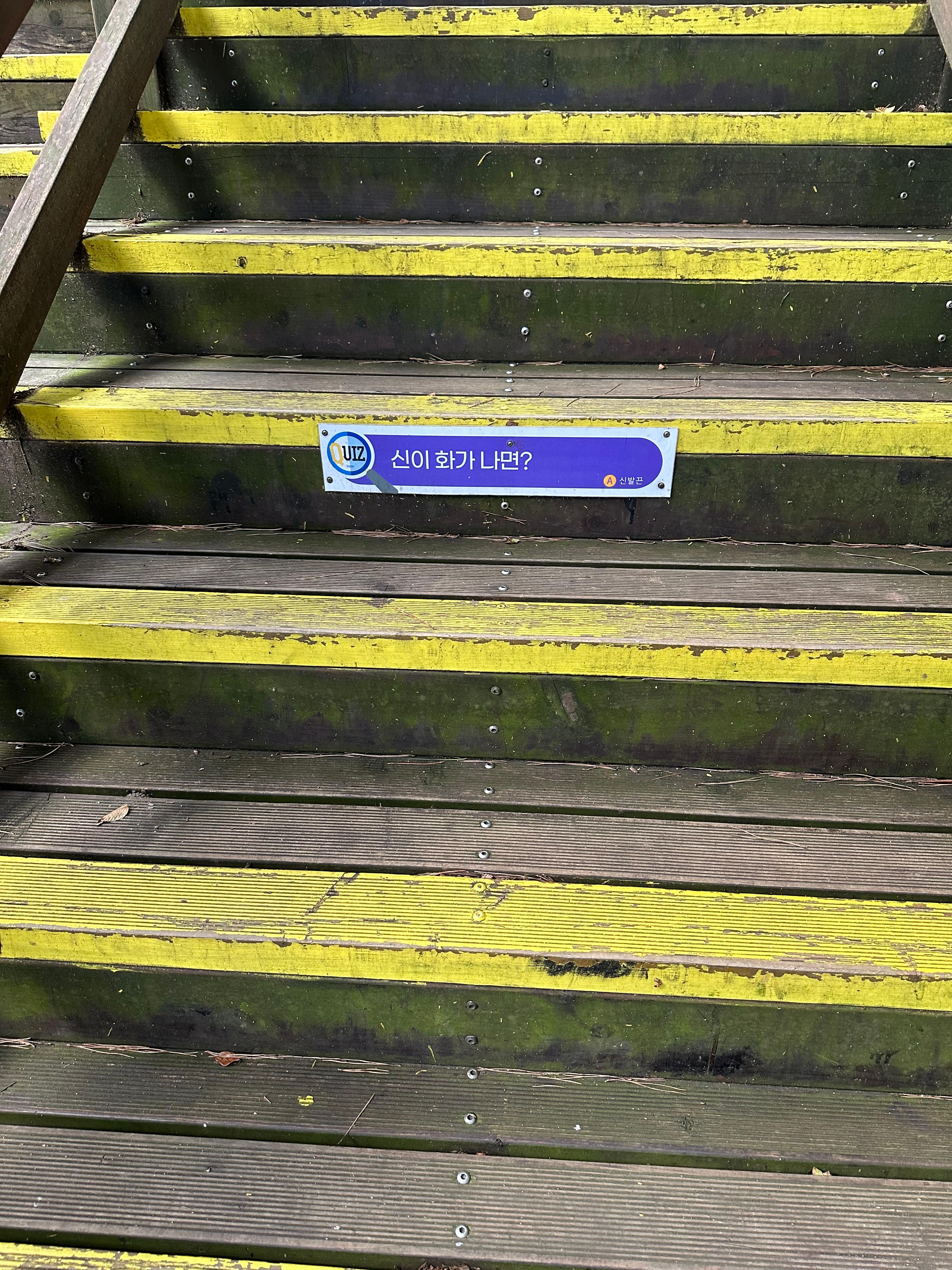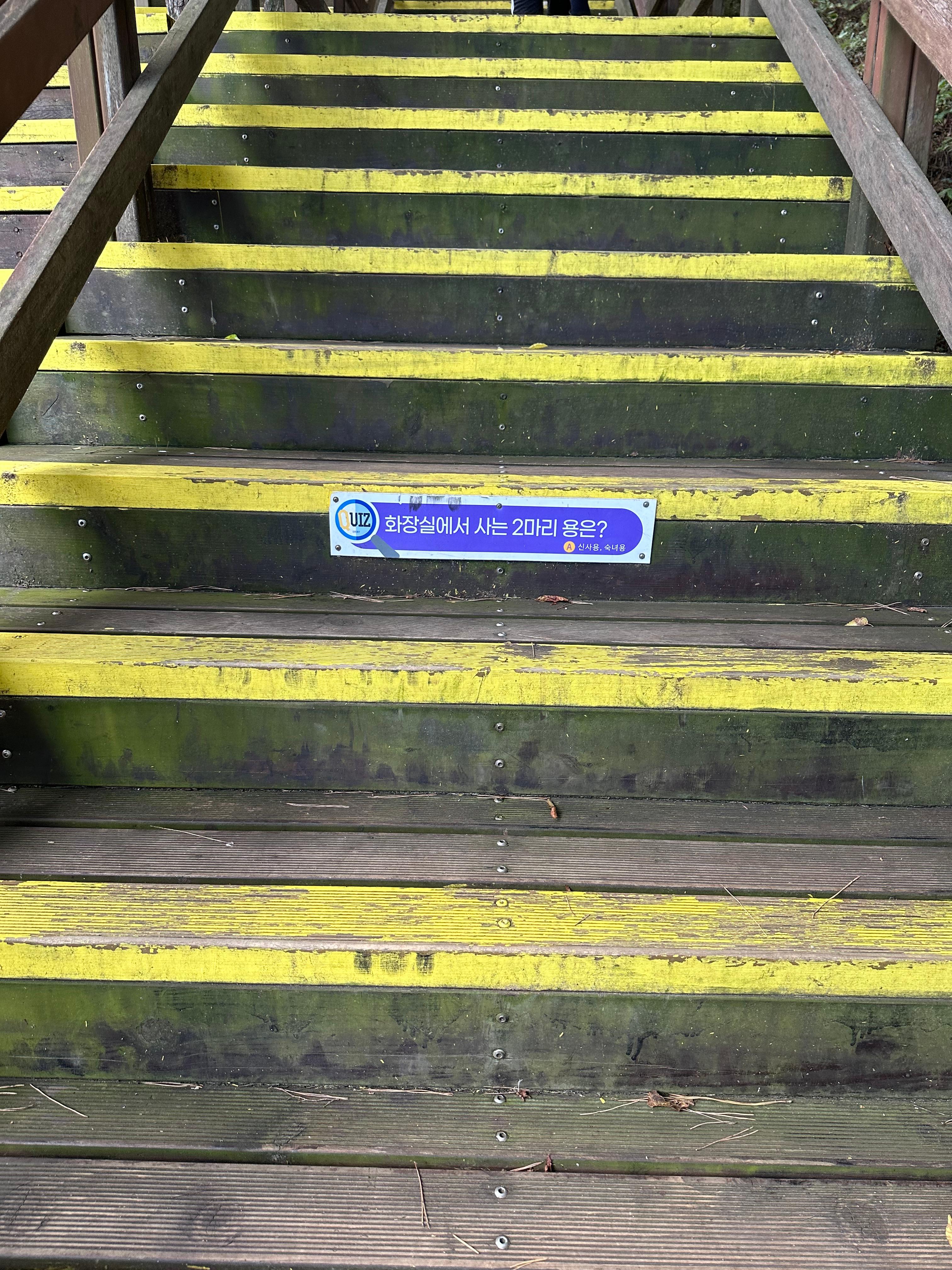 계곡 바로 앞에는 중소규모의 큰 광장과 함께 미륵산으로 올라가는 높은 계단이 보입니다. 미륵산 정상까지는 일반 산길이 아니라 오르기 쉽도록 계단으로 구성되어있어서 남녀노소 부담되지 않은 산이었습니다. 물론 나이가 많은 노인분들에게는 높은 계단이 부담될 수 있습니다. 케이블카를 많이 타고 다녀셨다면 케이블카가 있는 등산로 계단이 미륵산처럼 높지 않은 경우도 있습니다. 미륵산은 계단이 높고 힘이듭니다. 그래서 더운 여름에는 비록 20-30분 걸리긴 하지만 생수가 필요합니다. 이날도 추석이 지난 가을이었지만 정상에서는 시원한 바람과 함께 햇빛이 강해서 물이 필요하긴 했습니다. 높은 계단이기는 하지만 계단마다 재미있는 수수께기가 붙어있는데요. 신이 화가나면 무엇일가요 신발끈이라고 합니다. 또 하나는 화장실에 사는 두마리의 용은 신사용 숙녀용 이라는 재미있는 수수께기들을 여러곳에서 볼 수 있습니다.