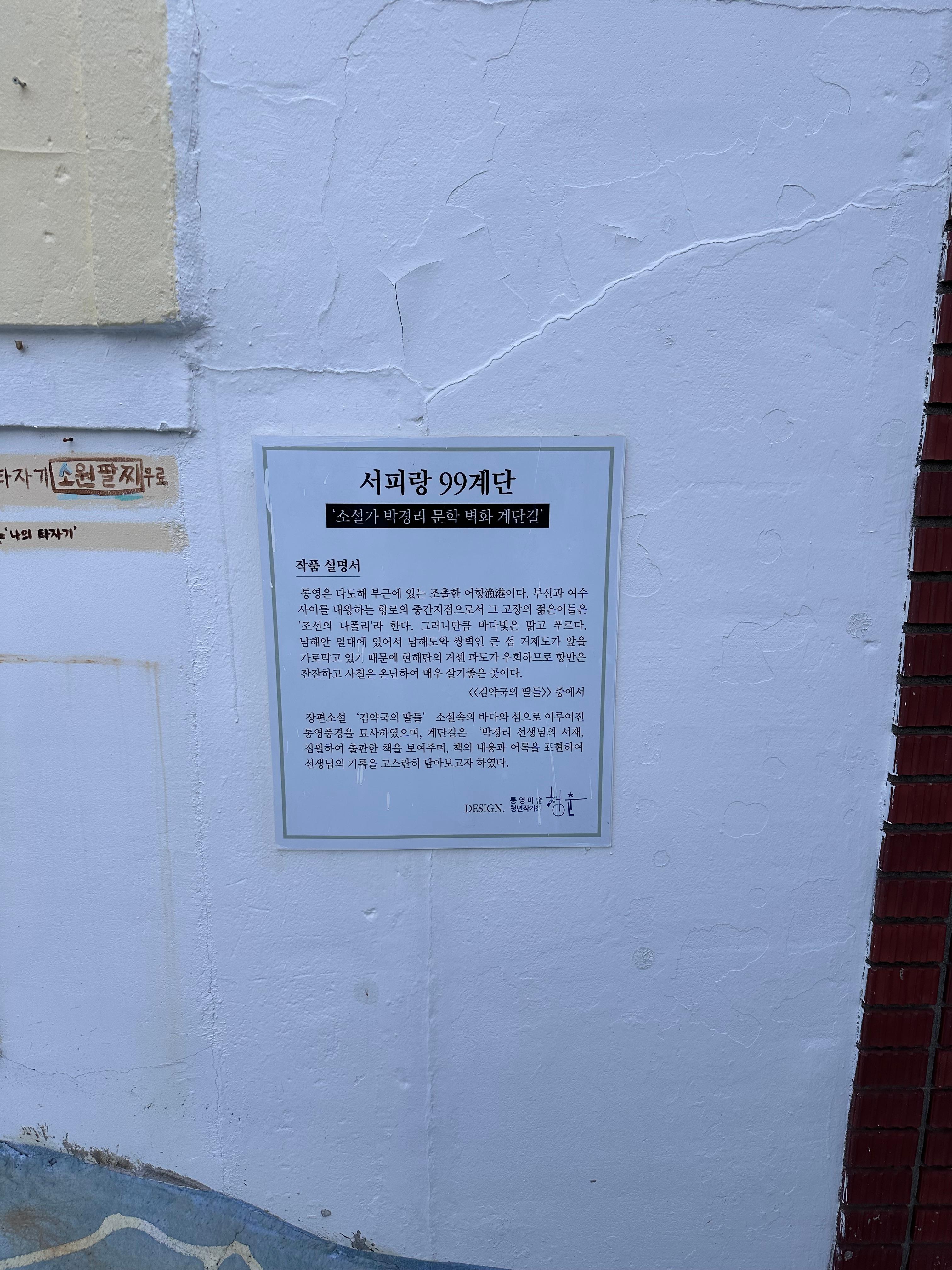 결국 통영 서피랑 마을 역시 작품으로 볼 수 있습니다. 99계단 오르는 입구에는 서피랑 99계단에 대한 설명서가 벽에 붙어있었습니다. 소설가 박경리 문화 벽화 계단길이라는 소제목을 볼 수 있었습니다. 그러고보면 그동안 블로그를 하기전에는 벽화마을을 걸을 때 그냥 아무런 생각없이 걸었던것 같습니다. 하지만 이렇게 잘 꾸며놓은 것 역시 작품이었습니다. 이곳 서피랑 마을은 박경리 작가의 작품인 김약국의 딸들의 장소이기도 합니다. 또한 박경리작가의 생가가 있는곳이라고 합니다.