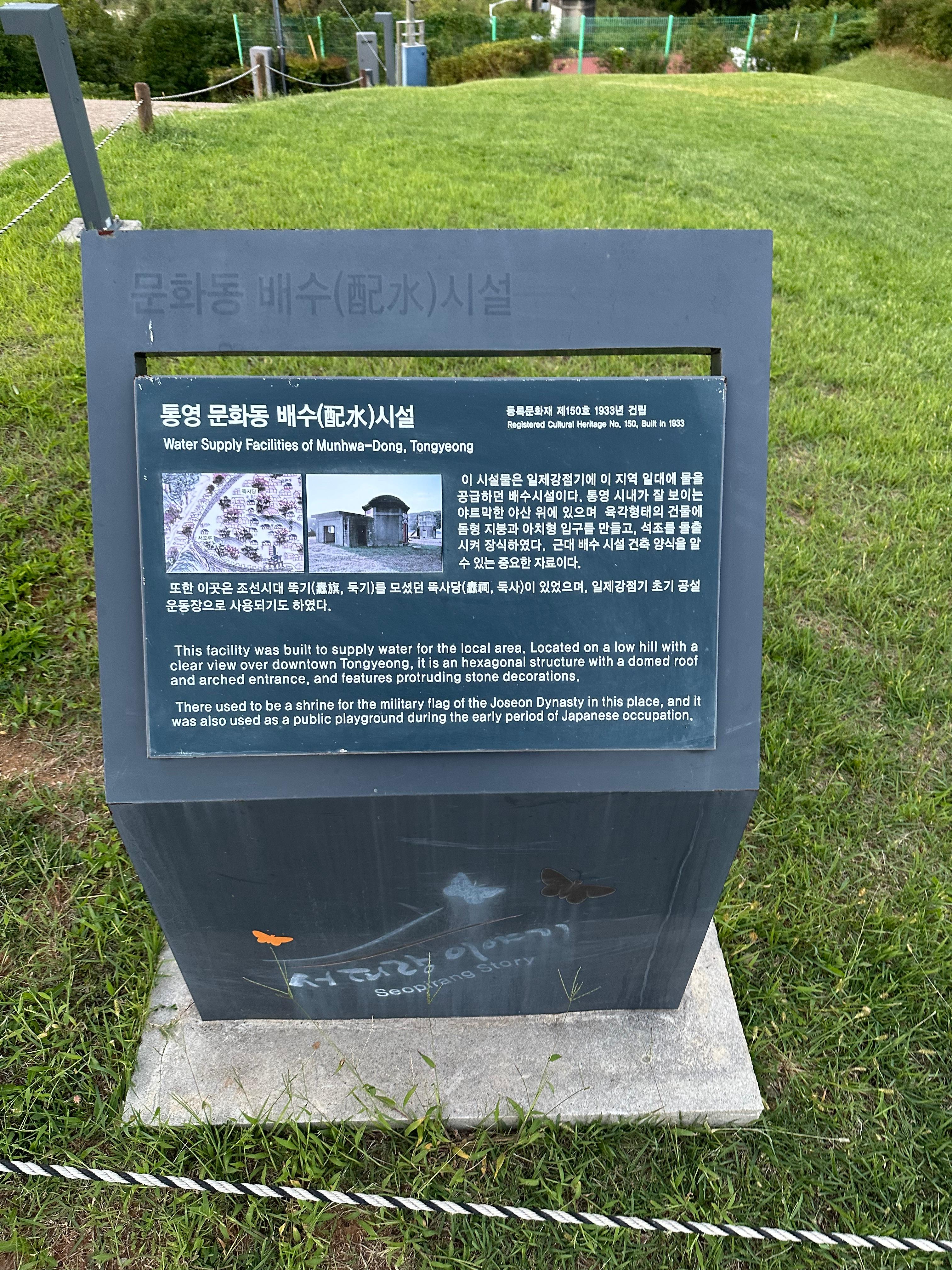 우리나라는 지금으로부터 약 80년전이라고 할가요. 일제로부터 치욕의 역사를 당했습니다. 바로 일제강점기인데요. 우리나라 국내 여행으 하다보면 아직도 일제강점기의 역사를 볼 수 있습니다. 한편으로는 일제의 흔적을 지워야한다고는 하지만 역사는 반복된다는 말처럼 역사를 통해 다시는 이런일을 당하지 않도록 후손들에게 가르침을 줄수있기때문에 없애지 않는 것도 있습니다. 특히 일제강점기라는 흑역사라고는 하지만 그런 역사를 통해 발전했을 수도 있는점도 있지만 무엇보다도 일제강점기를 통해 우리 후손들이 다시는 나라를 잃지 않게 하는 참 교육의 중요성도 있습니다. 통영 서피랑 공원 뒤로는 당시 일제강점기에 지역 일대에 물을 공급하는 배수시설이 있었습니다. 지금은 사용되지 않지만 당시의 흔적을 살펴볼 수 있었습니다.
