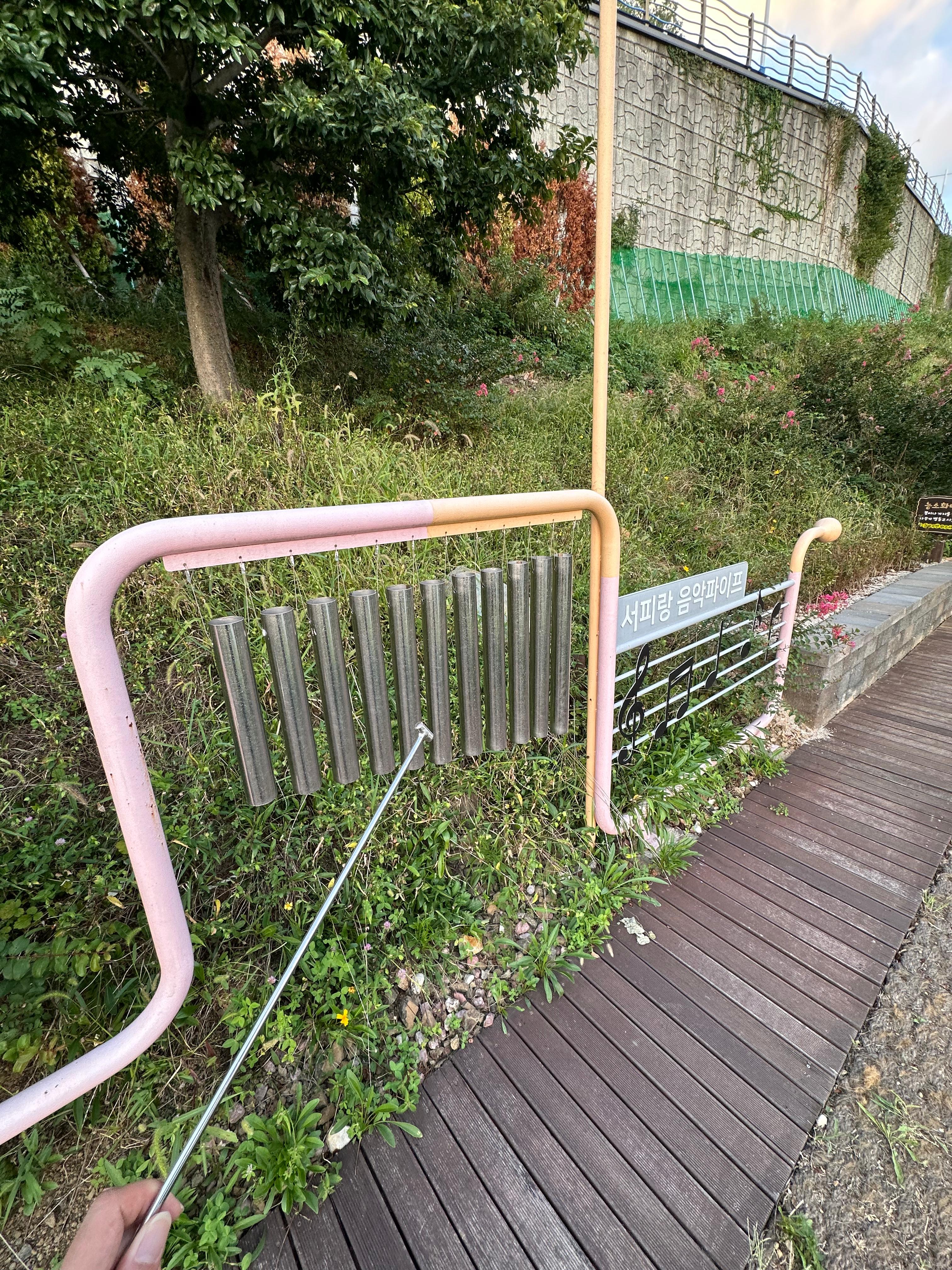 그렇게 장미터널을 지나면 마지 실로엣 처럼 음악 소리가 나는 자연을 이용해서 악기 연주 할 수 있는 도구가 나옵니다. 쇠로된 막대를 이용해서 나무 판을 치거나 혹은 쇠로 칠경우 소리가 나는데요. 학교다닐 때 음악 악기로 도레미파솔라시도 소리도 자연스럽게 들렸습니다.
