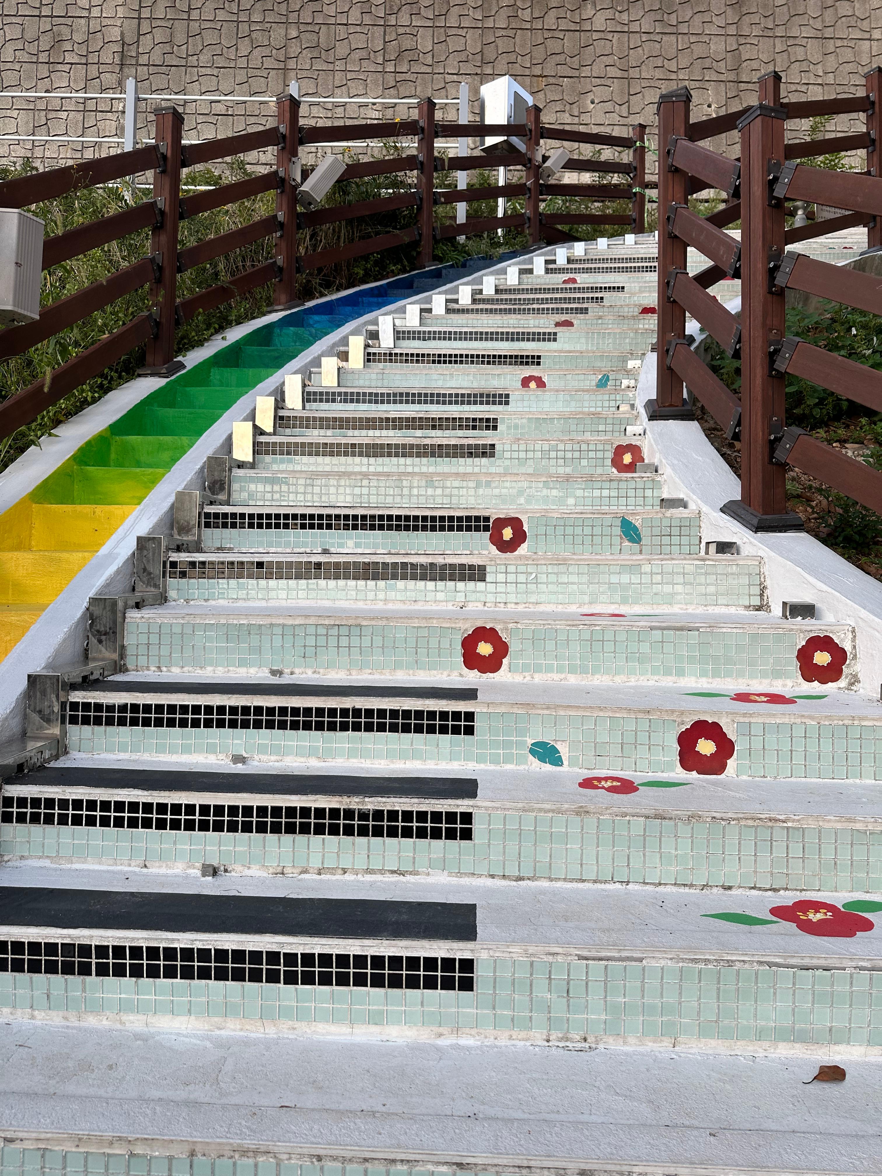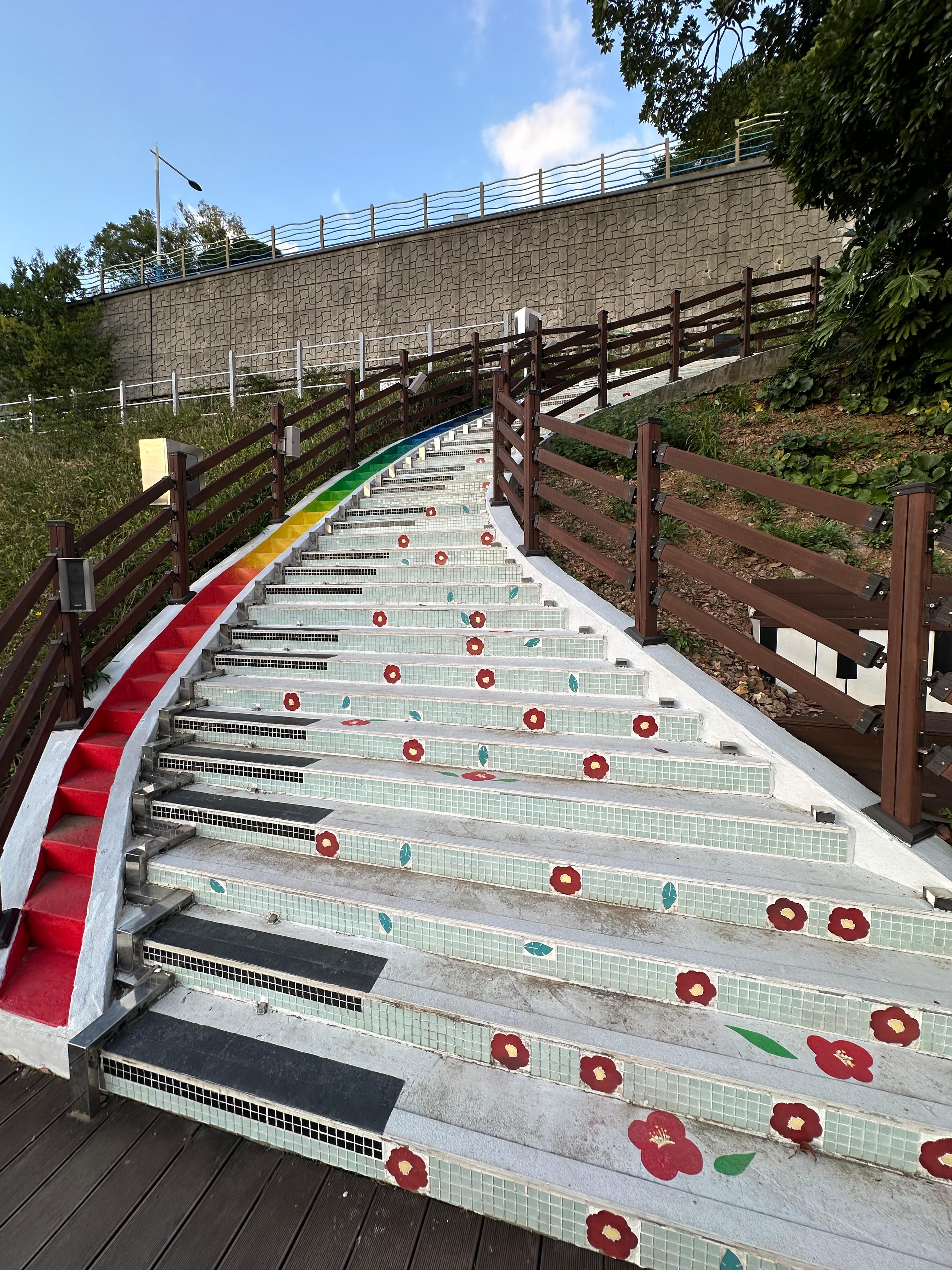 음악정원을 지나서 조금만 걸으면 피아노 계단이 나오는 것을 볼 수 있습니다. 마치 피아노 처럼 밟으면 소리가 나는데요. 단 비가 오거나 날씨가 안좋을 대는 감전 등의 문제가 있기 때문에 작동하지 않는다고 해요. 또한 한가지 피아노계단이라고 아무데나 밟으면 나오는게 아니라 검은색으로 되어있는 부분을 밟아야 소리가 나왔습니다.