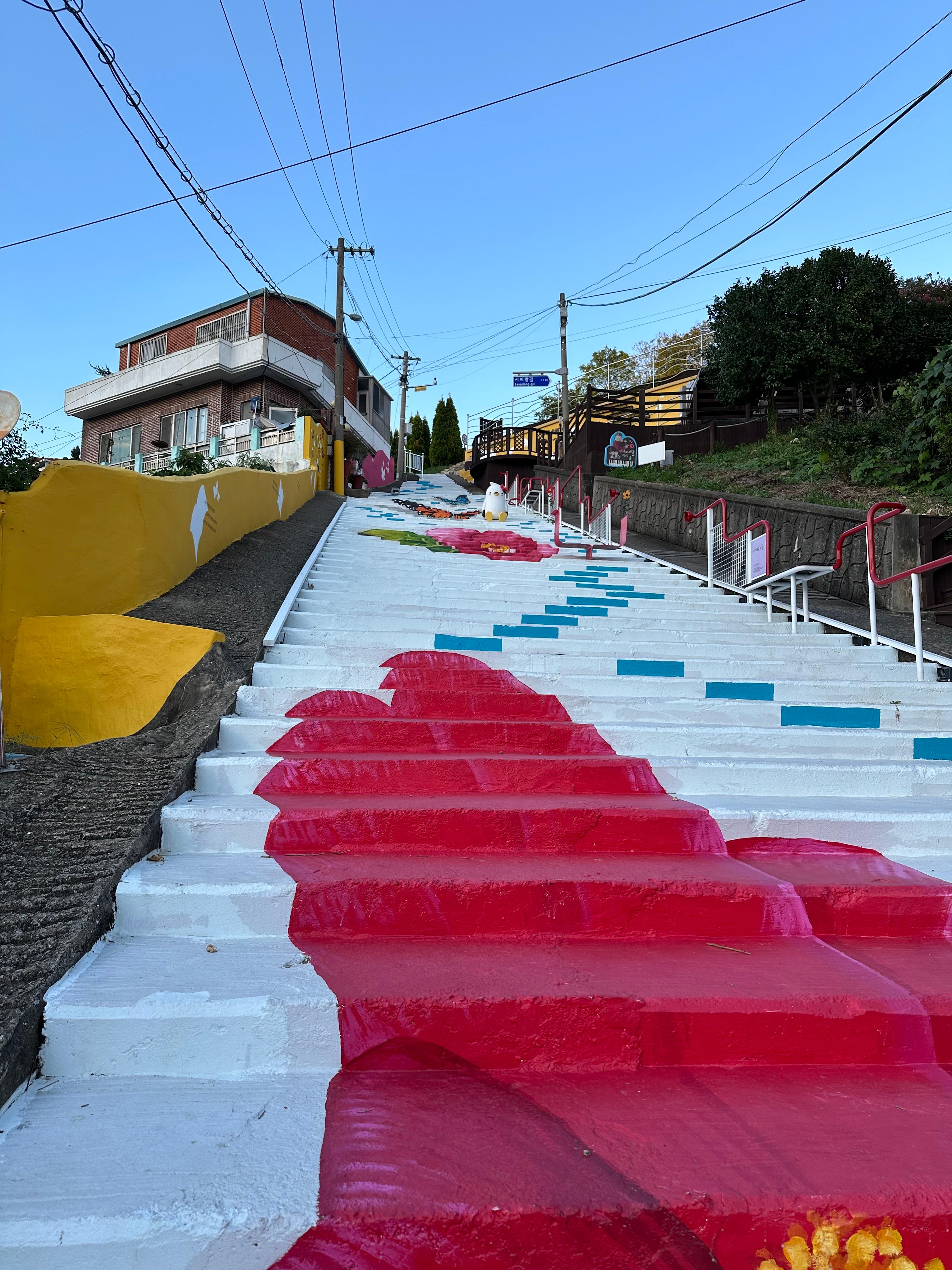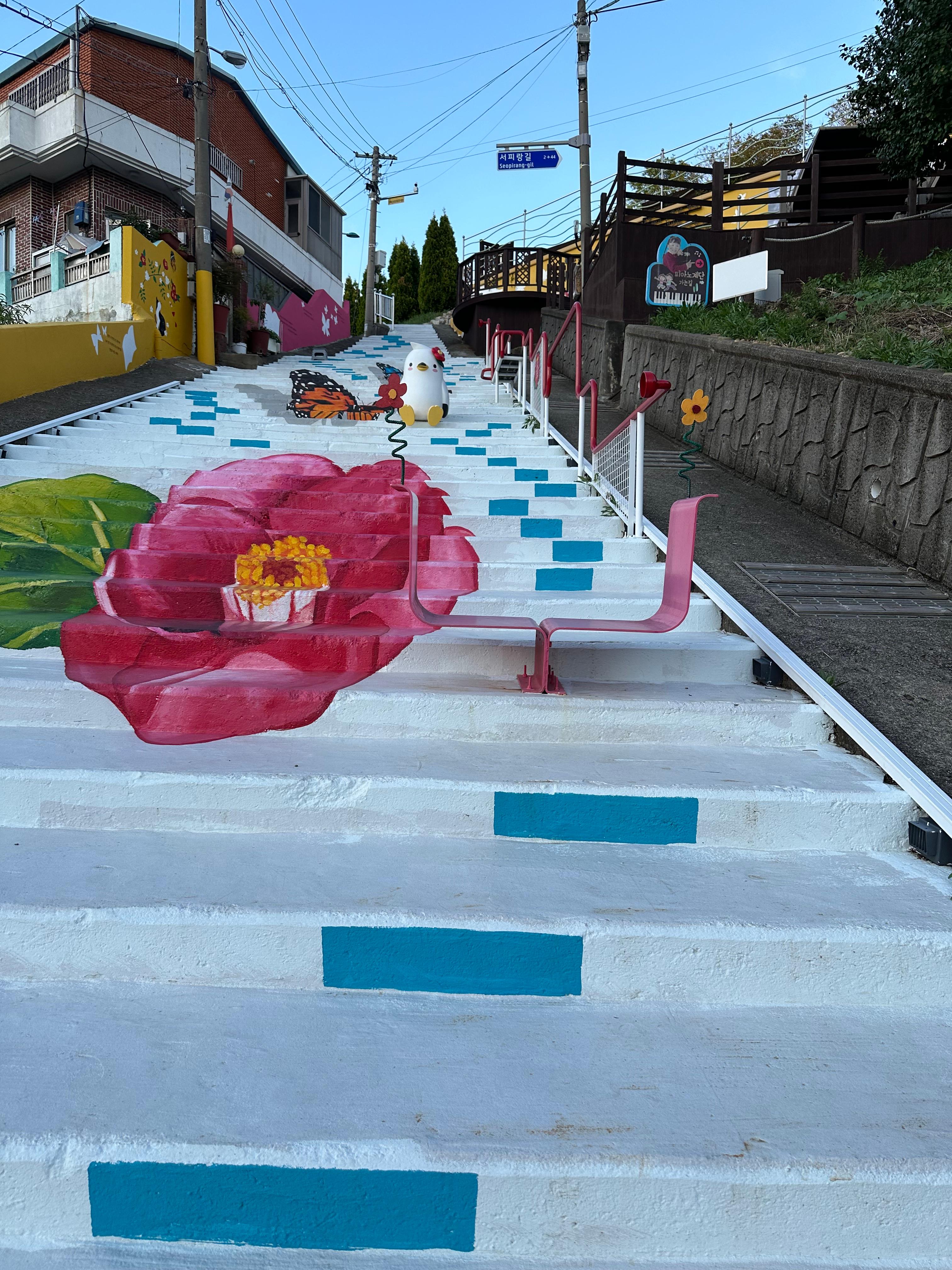 통영 서피랑 떡볶이 길건너서 서피랑 마을을 위해 걷기 여행을 본격적으로 시작합니다. 음악정원과 피아노계단, 99계단 표시한 따라 조금 걷다보니 바로 99계단이 보이게 됩니다. 정말 99계단이는 세어보지 않았지만 아무튼 엄청 높은 계단이었습니다. 그냥 계단이라면 힘들고 오르기 힘들지만 아름답게 그림 그려진 벽화와 계단이 걷는데 있어서 힘들지 않게 느껴졌습니다.
