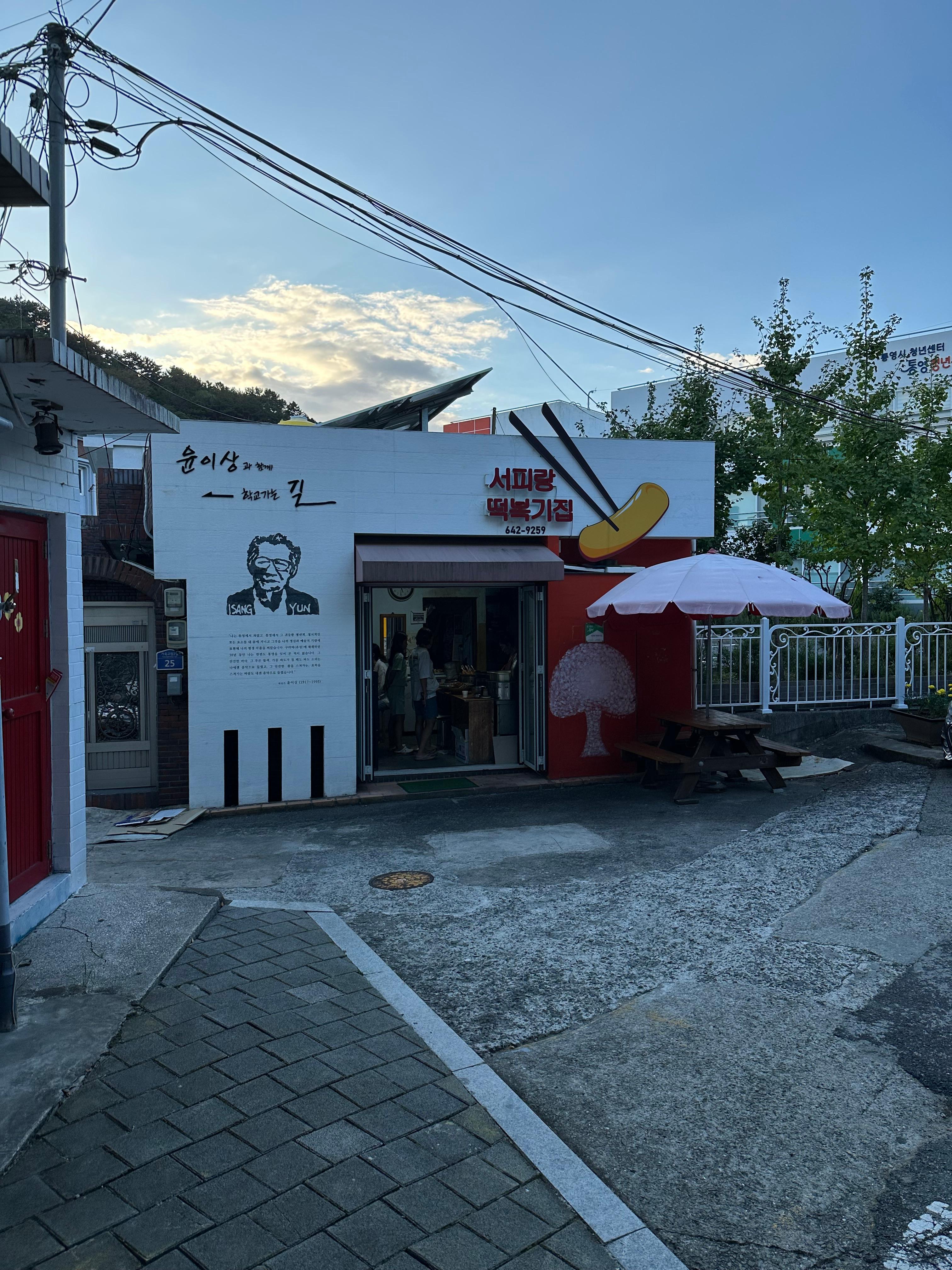 중앙시장에서 북쪽 방향으로 가면 서피랑 마을이 나옵니다. 하지만 저는 이번에 통영 케이블카와 루지를 타고 시내버스를 타고 가려고했으나 피곤하기도 하고 버스가 오지 않아 택시를 타고 서피랑 마을을 갔는데요. 하지만 택시를 막 부르자마자 바로 버스가 와서 애매한 상황이었습니다. 통영 루지에서 서피랑마을까지는 택시로 15분정도로 기본요금에서 조금 더 자오는 정도였습니다. 택시를 타고 15분정도 달려서 서피랑마을의 피아노계단과 99계단 앞에서 하차했습니다. 그리고 내린곳에는 서피랑떡볶이라는 가게가 보였는데요. 제가 슬로비게스트하우스를 처음갔을 때 소통의 시간이라는 파티에 참여했습니다. 그 때 처음으로 슬로비게스트하우스 사장님이 통영 떡볶이 맛집이라는 서피랑떡볶이를 먹었는데요. 그 이후에 직접 찾아가서 먹었는데 오래되고 할머니분이 운영하는 장인정신이 느껴지는 분식집이었습니다. 통영이 시골이다보니 6시 조금 넘으면 문을 닫기 때문에 오전일찍에서 늦기전에 가셔야 합니다. 통영 서피랑 떡볶이 입구에는 통영 출신의 유명한 윤이상 작가의 모습도 벽면을 통해 볼 수 있었습니다.