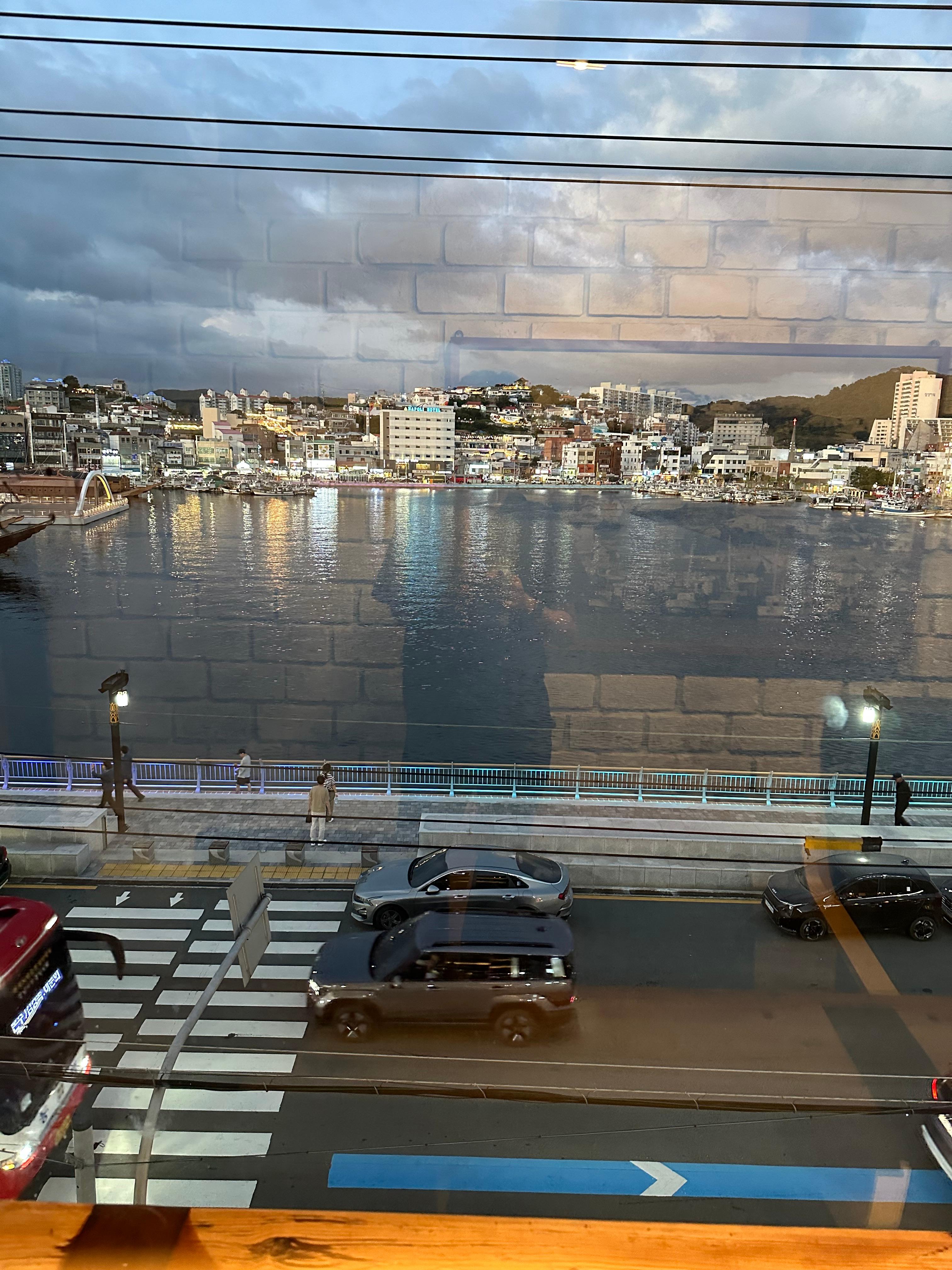 4층에 막 올라왔을 때만 해도 아직 완전히 어두워지지 않아서 그런지 밖은 훤했습니다. 그래도 해가 지고 어두어지기 때문에 바다가 보이는 바다봄 카페 유리창문에는 제가 비추어지고 있었습니다. 어둠이 찾아오면서 강구안 바다 건너편 동피랑 마을과 주변 상가건물에는 불이 켜지면서 통영의 아름다운 밤이 시작되려고 하고 있었습니다.