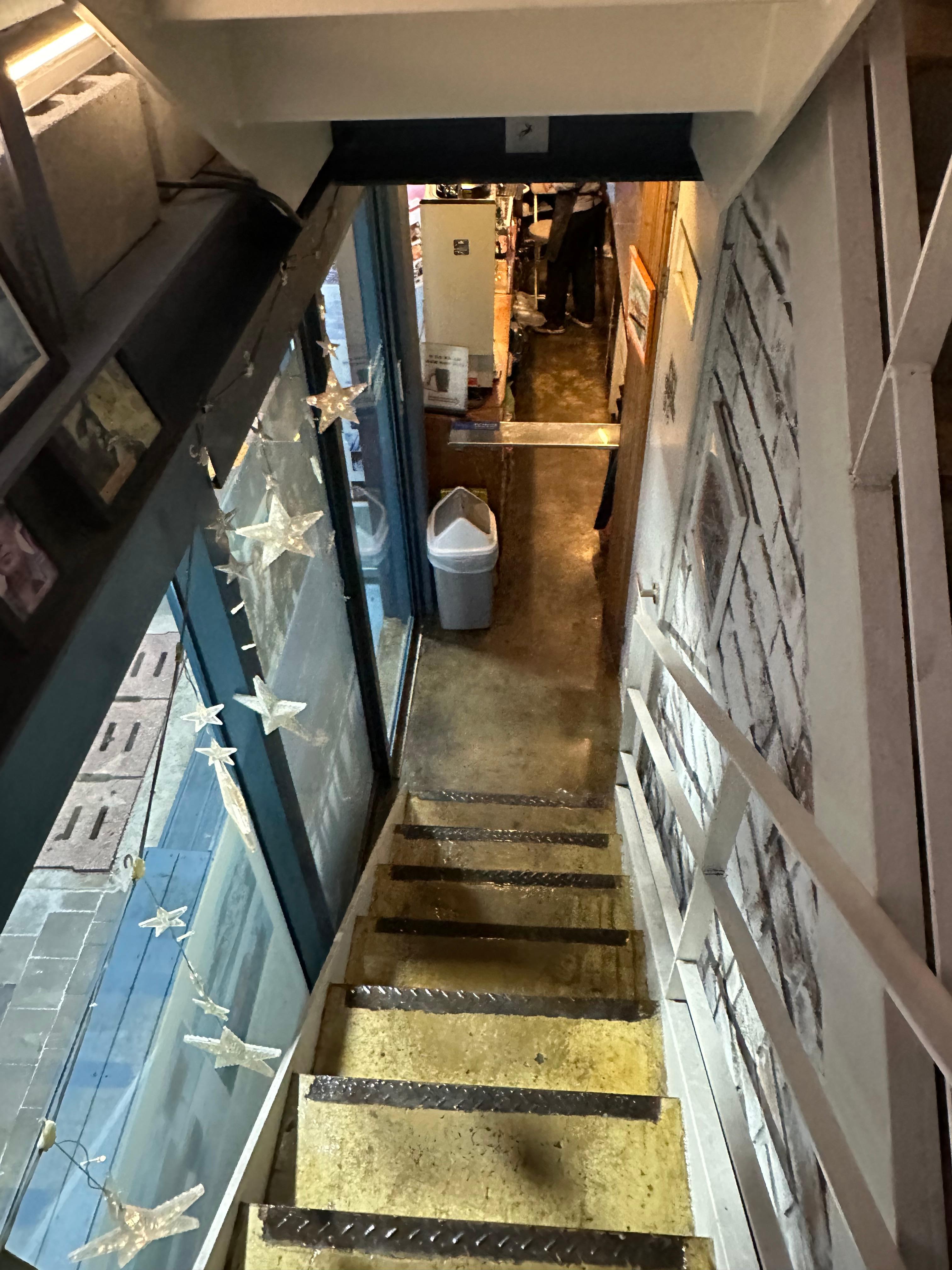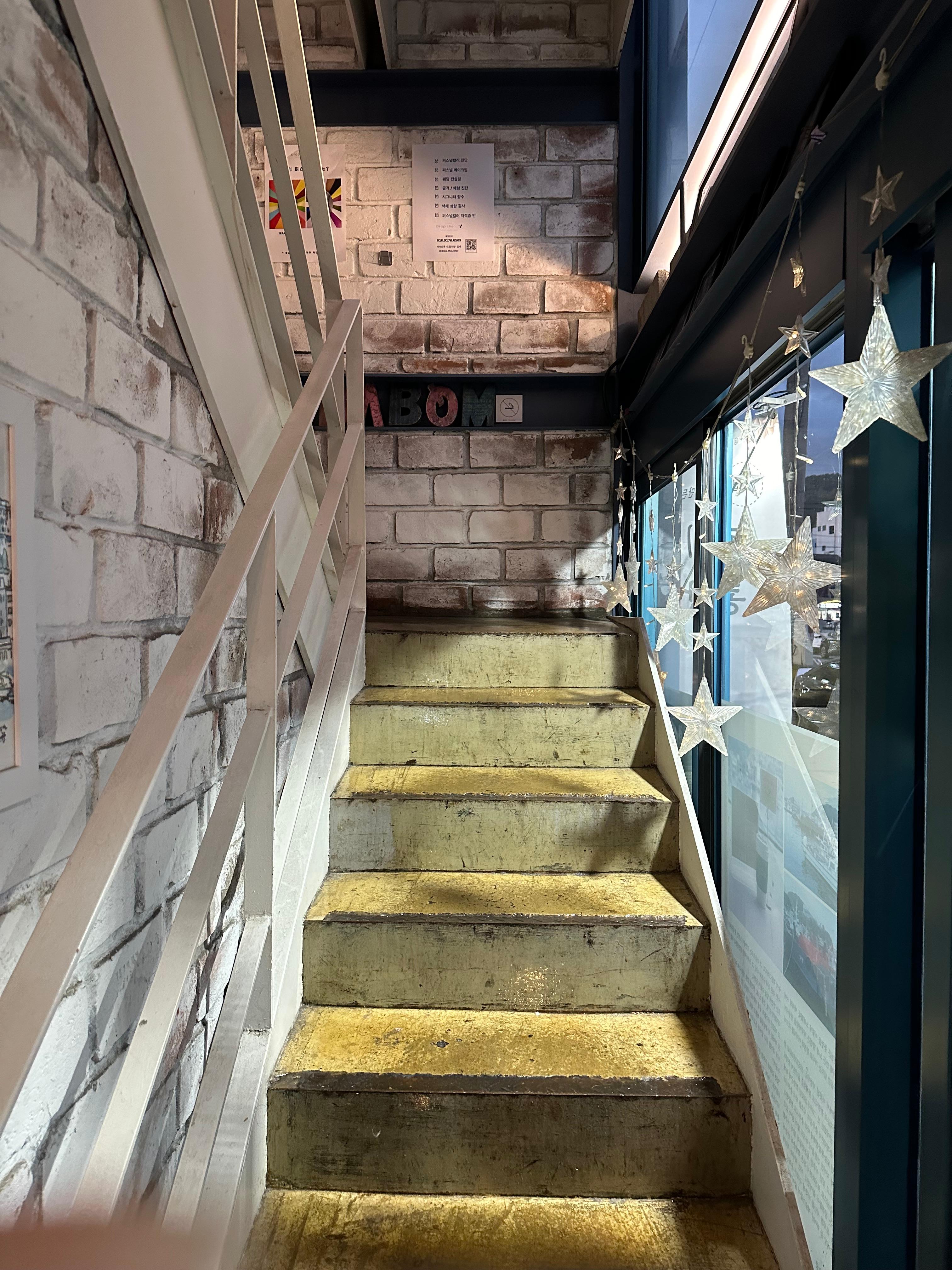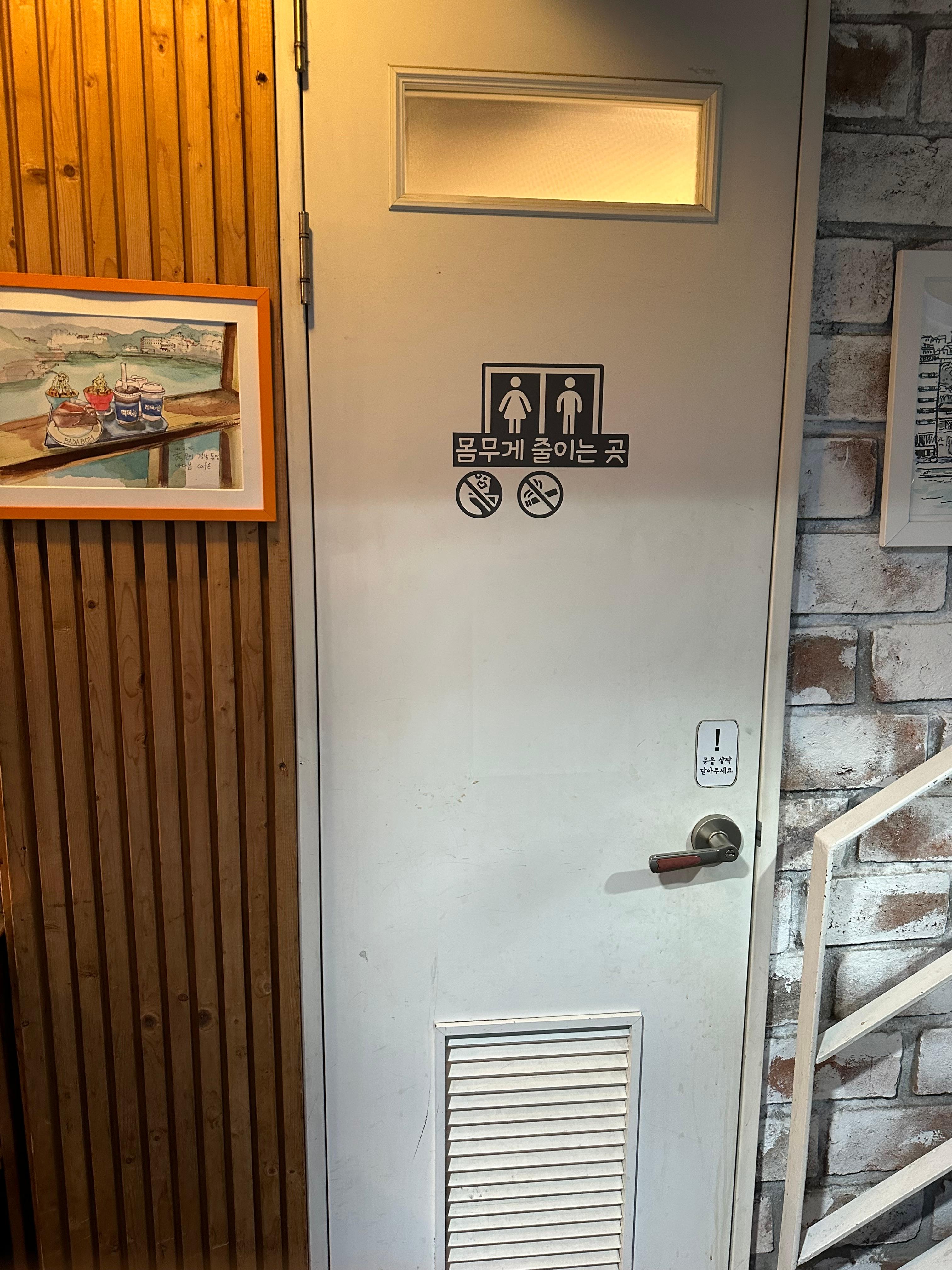 저는 카운터에서 청포도 에이드를 주문하고 얼마 기다리지 않아 청포도 에이드를 들고 계단을 향해 오르기 시작했습니다. 마침 제가 방문했던 시간대에는 손님들이 거의 빠져나가서 조용해서 좁고 작은 바다봄 카페 계단을 오르는데 힘들지 않았습니다. 카페 내부는 사람 한사람도 오르기 힘든 작은 계단이지만 아담하고 작은 화장실도 있습니다. 화장실이라는 명칭 대신 몸무게 줄이는 곳이라는 문구가 재미있었습니다.
