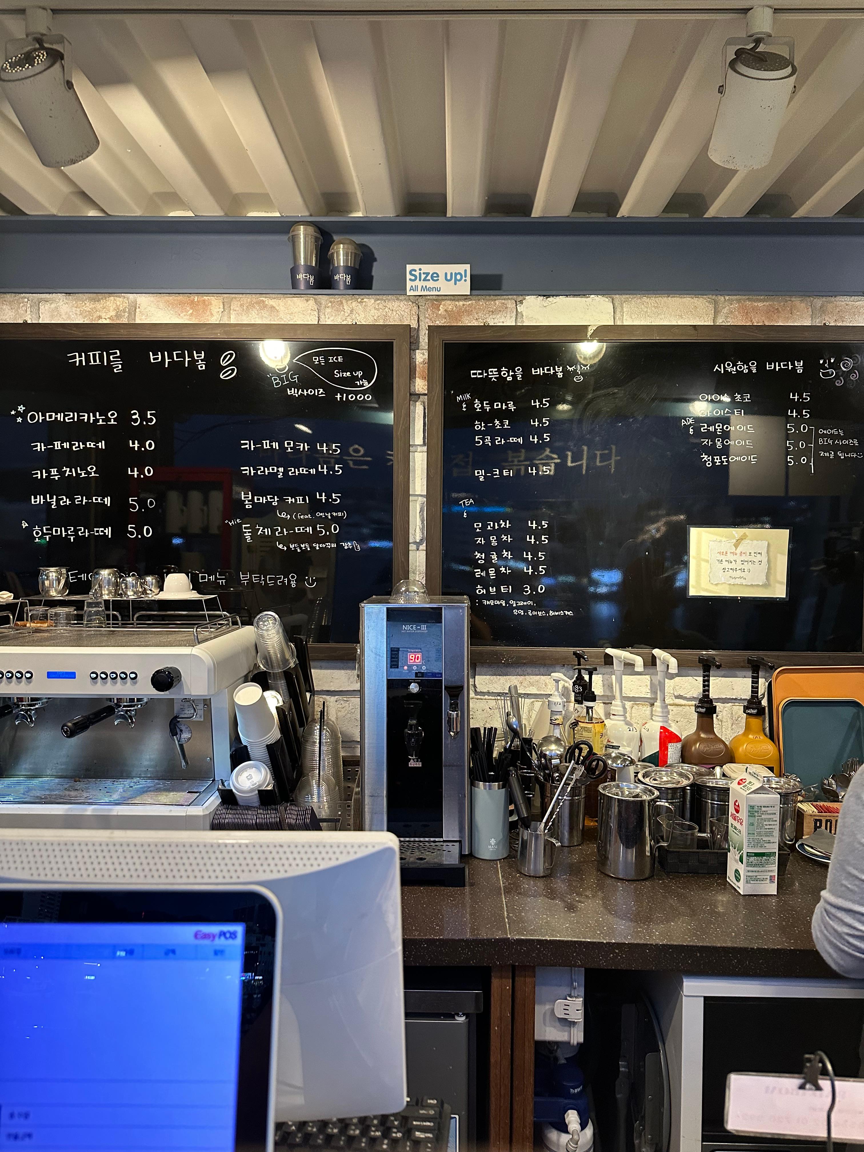 통영 바다봄 카페는 4층 높이로 전체적으로 카페만 높을뿐이지 안에는 작은 구조로 볼 수 있습니다. 커피 주문도 간편하게 테이크아웃 할 수 있도록 도로변가에서 주문 후 직접 음료수를 받아서 가던길을 가거나 전망이 좋은 높은 층으로 올라가서 차한잔 음료 한잔 마시며 휴식을 취할 수 있습니다. 음료를 주문 할 수 있는 카운터는 결제를 하는 포스기계 뒤로 다양한 카페 제조 도구를 볼 수 있었습니다. 학창시절 칠판을 보듯이 칠판위에 분필로 적은 메뉴판을 볼 수 있었습니다. 바다봄 카페는 카페 뿐만 아니라 커피콩방과 땅콩카페로도 유명합니다.